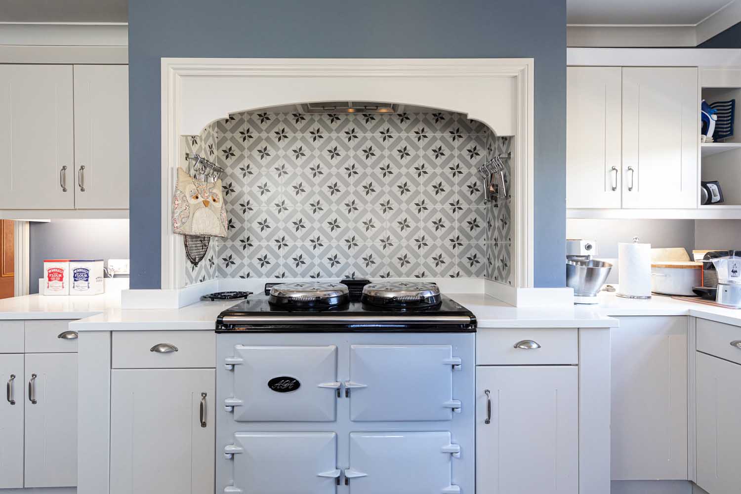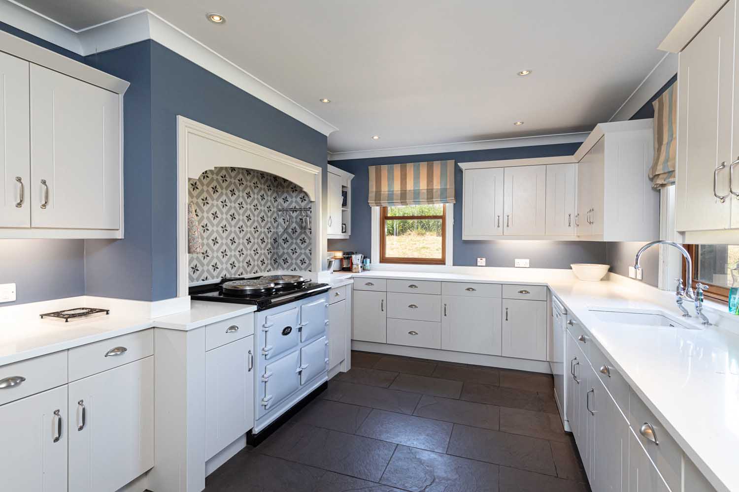The kitchen is accessed from both the sitting room and the living/dining room and has been superbly updated to marry a traditional country house feel with high quality modern fixtures and finishes. Pretty cabinetry at wall and floor level offer an abundance of workspace and storage, whilst also housing a range of discreet integrated appliances. The centrepiece is a modern electric AGA Total Control Cooker tucked in an inglenook with decorative Victorian-style tiling. The kitchen is further served by a generous laundry/utility room which has external access and links to the integral garage.