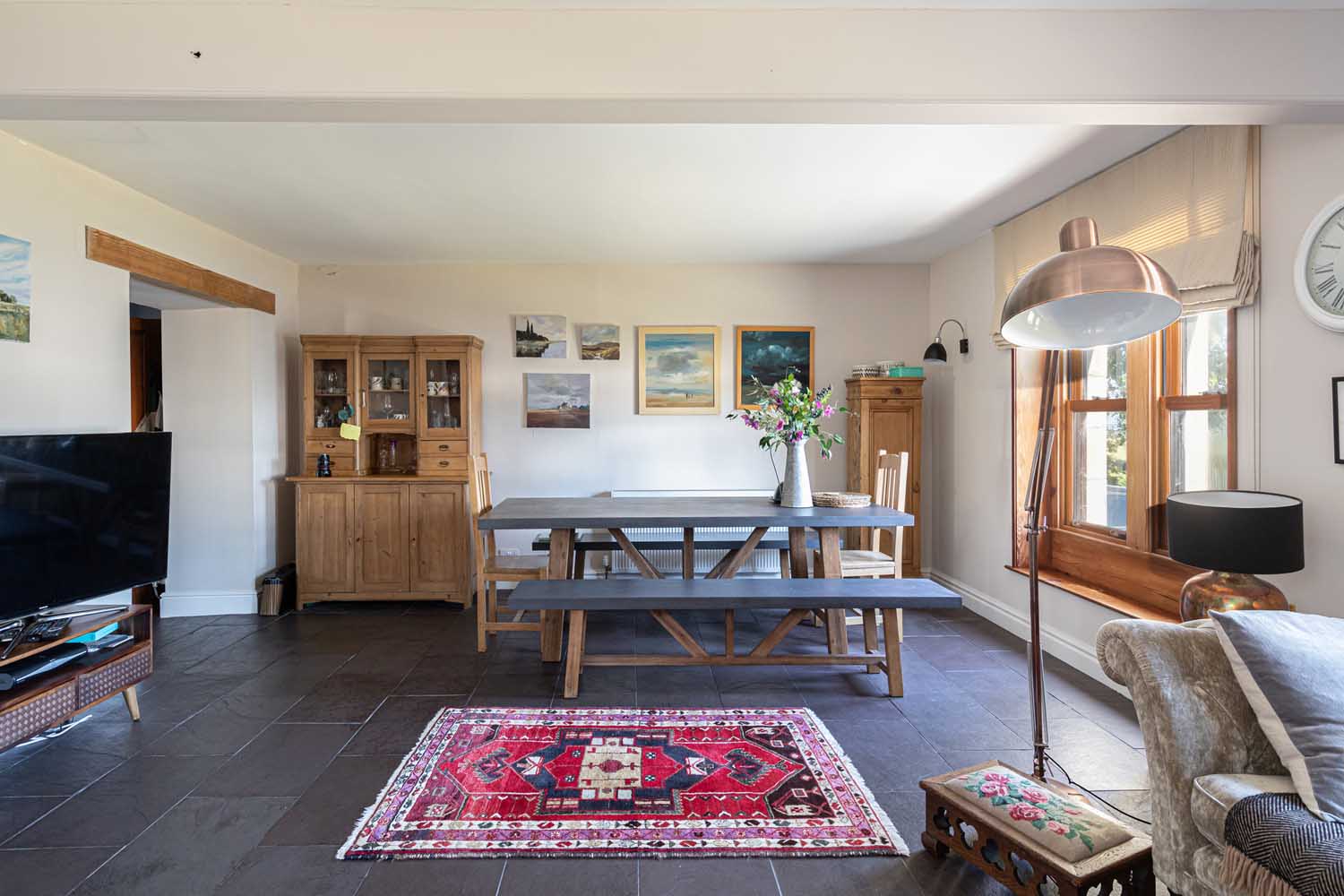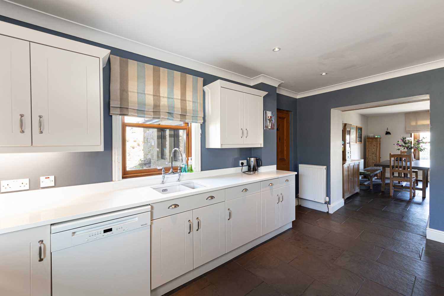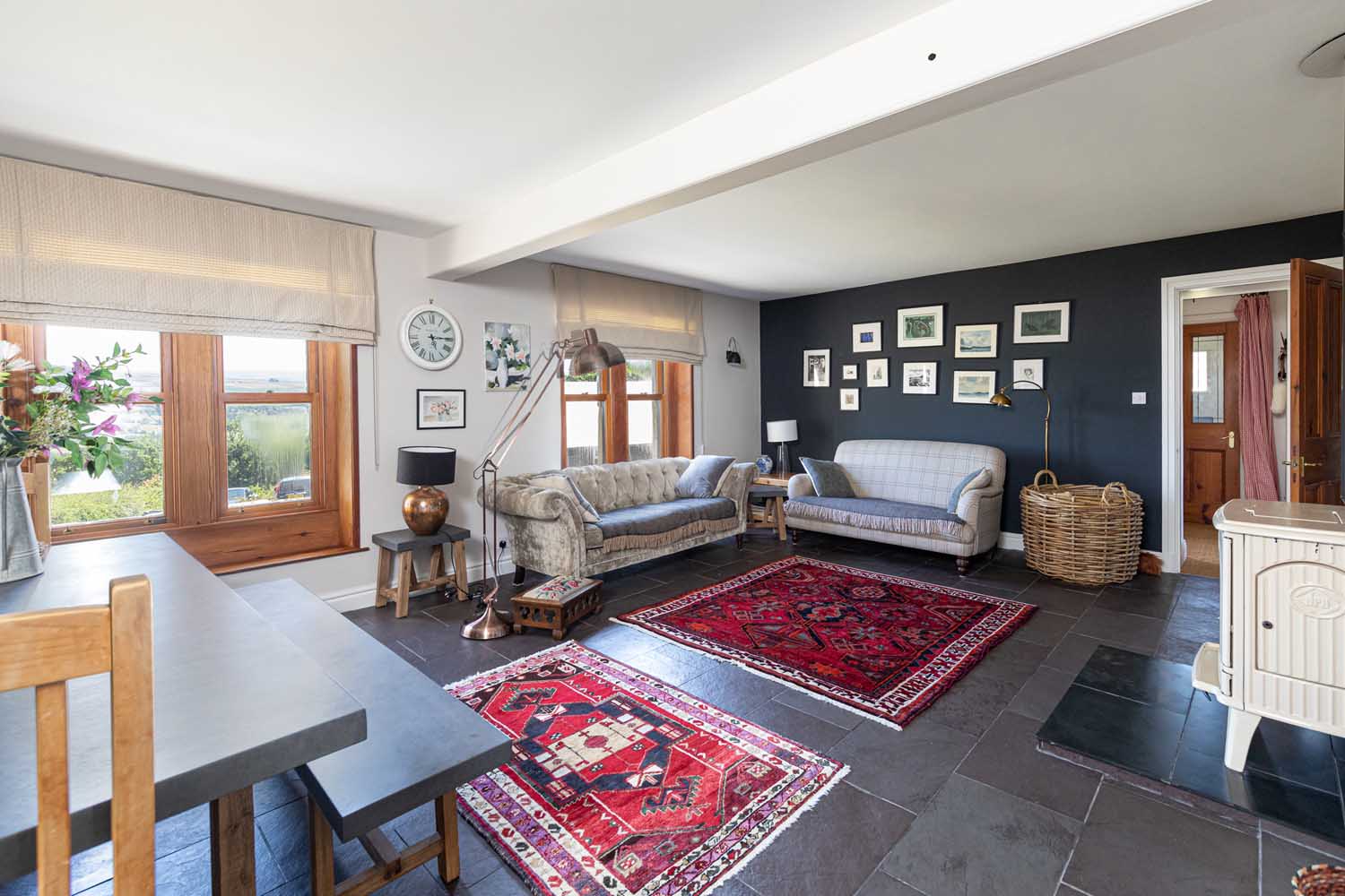 There are three spacious and flexible reception rooms that offer great versatility. The dual aspect sitting room is filled with natural light with French doors that open to the patio and sweeping gardens beyond. A striking inglenook with wooden mantel over houses a woodburning stove to add to the cosy atmosphere. The family room also benefits from a dual aspect with lovely views to enjoy. At the heart of the home is the huge living/dining room which very much caters to contemporary living styles, with space to dine, entertain and relax. Attractive slate flooring flows through the room and a woodburning stove sits centrally on a slate hearth. The whole room is bright and welcoming, with two large south-facing windows bringing swathes of light.