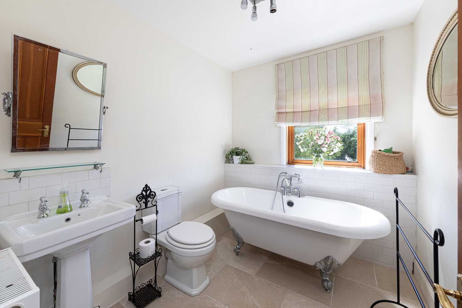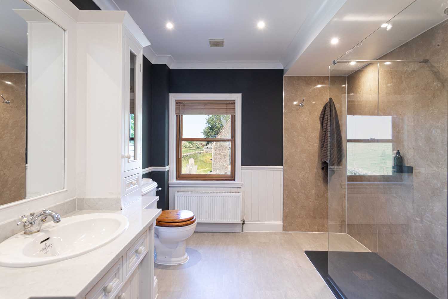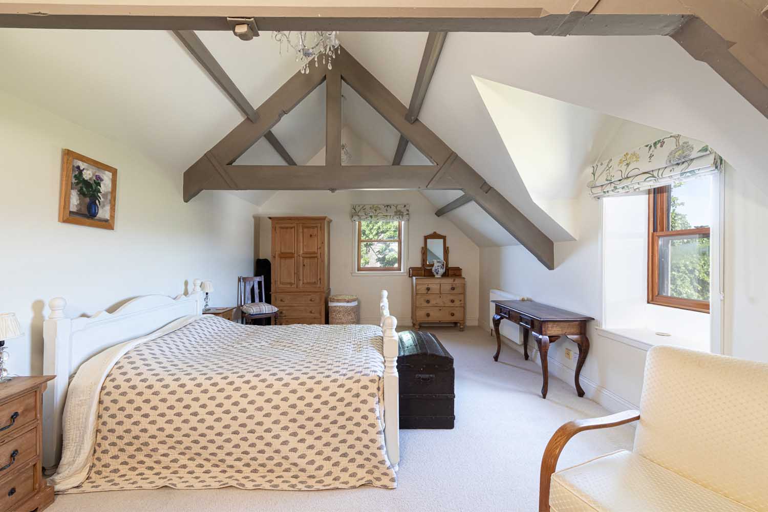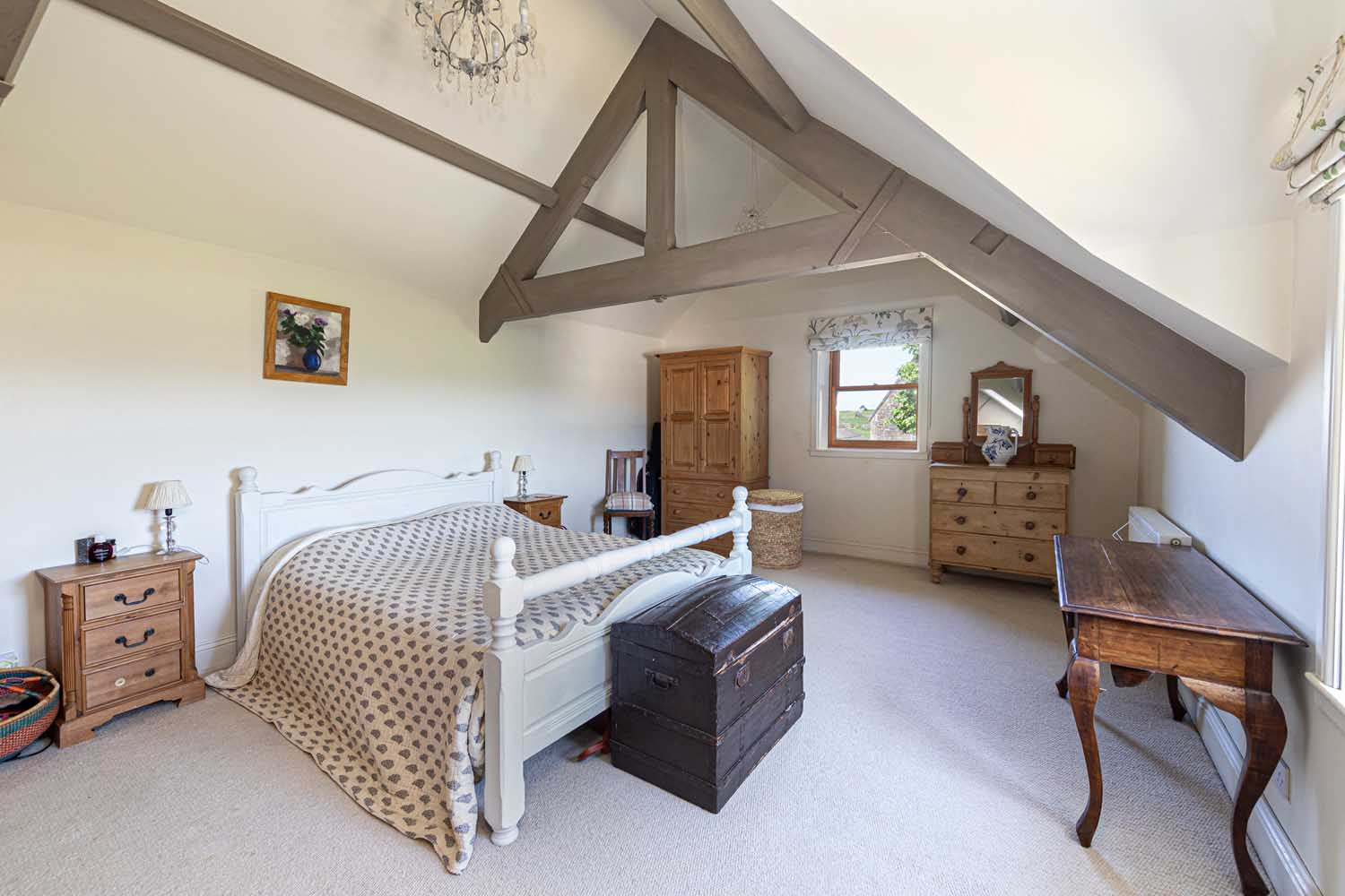 Stairs rise via a half landing to the first floor with all bedroom accommodation radiating off a wide hall. The fabulous principal bedroom features a vaulted ceiling supported by eye-catching A-frame beams. The vast bedroom is light and airy, with the elevated position enhancing the views. Three further double bedrooms make the most of varying outlooks, and all are finished in clean, modern style. The bedrooms are served by a beautiful bathroom and an equally lovely shower room. Both rooms have high specification suites with traditional styling that complements Old School House to perfection.