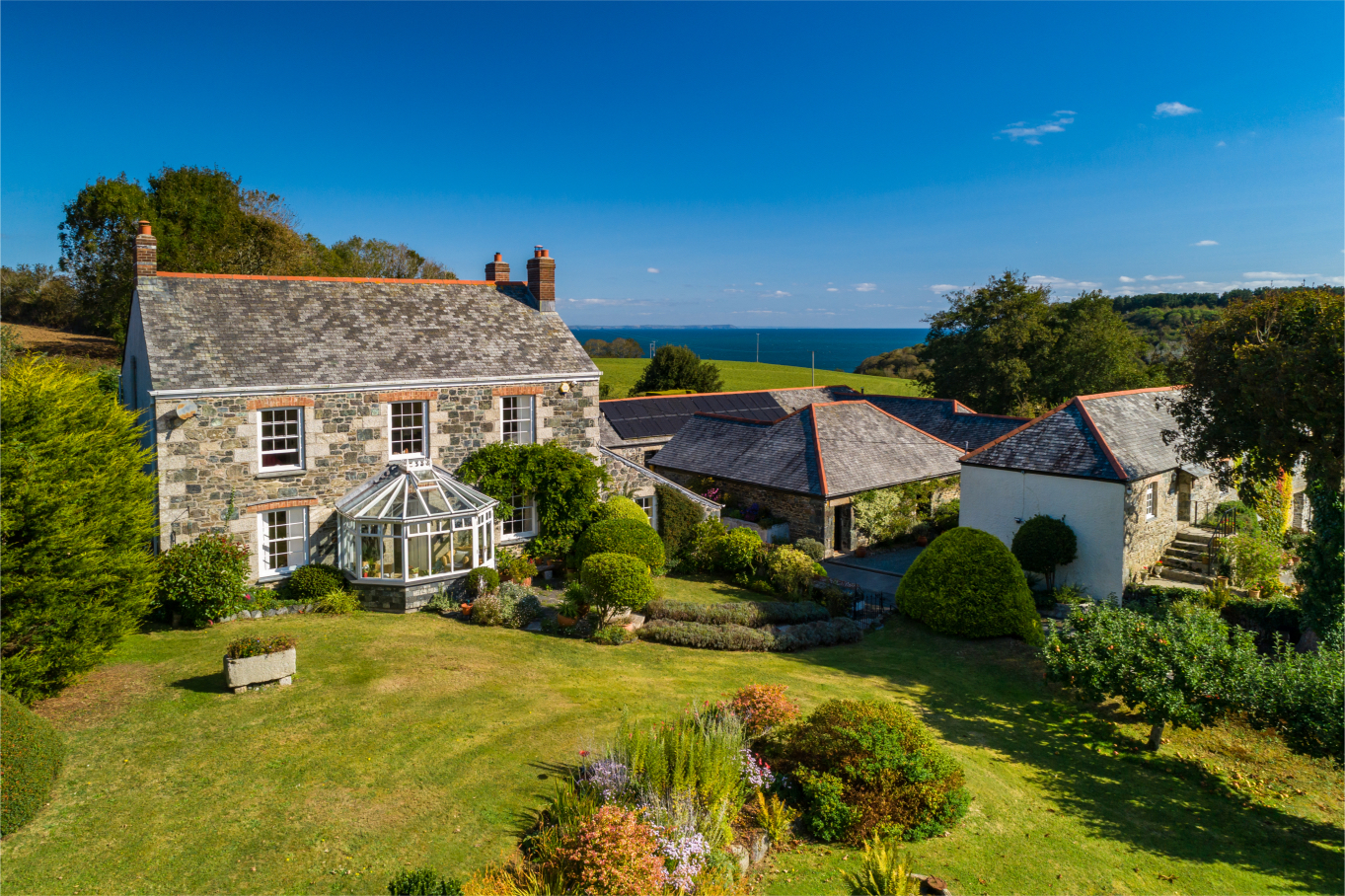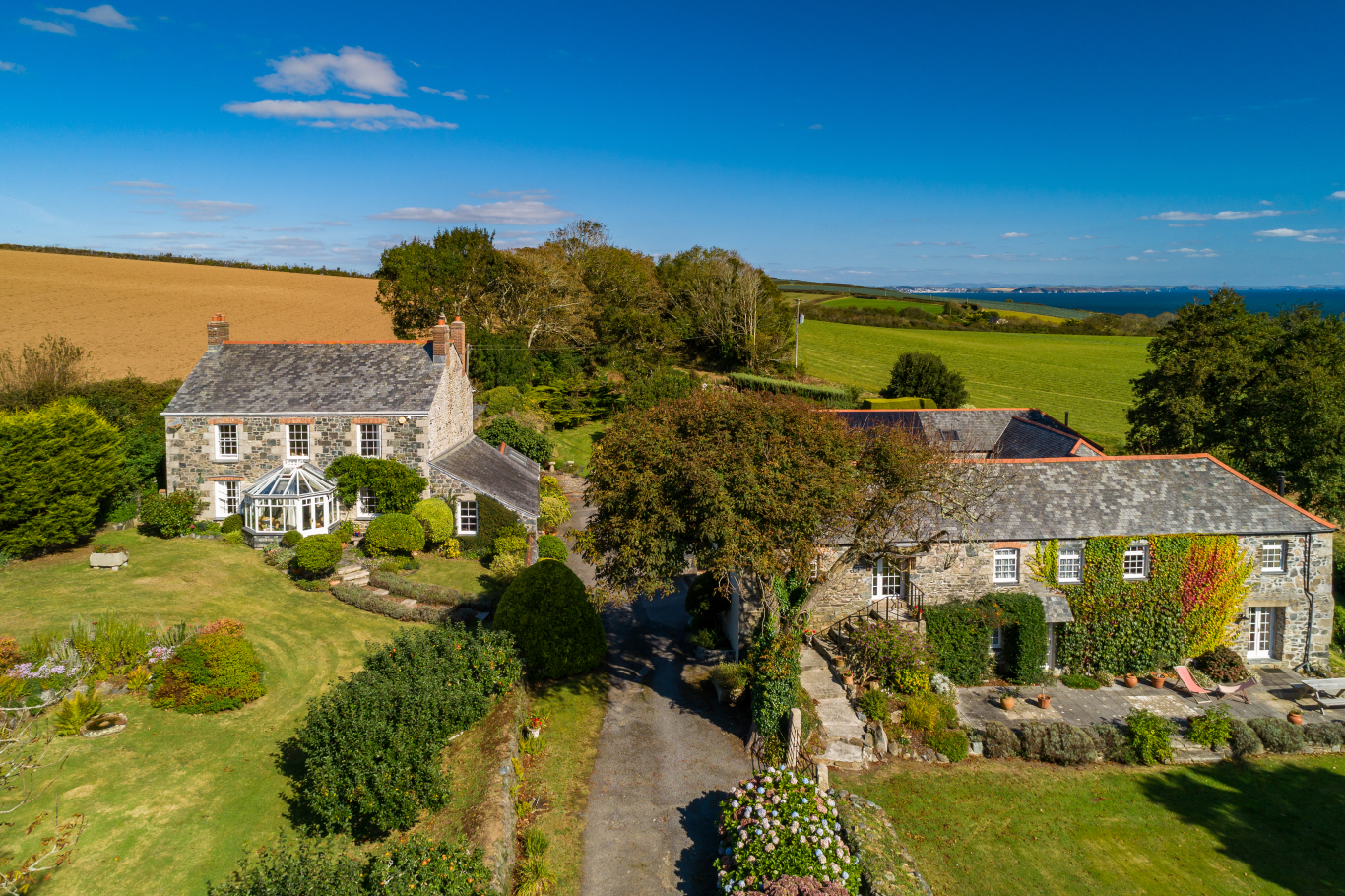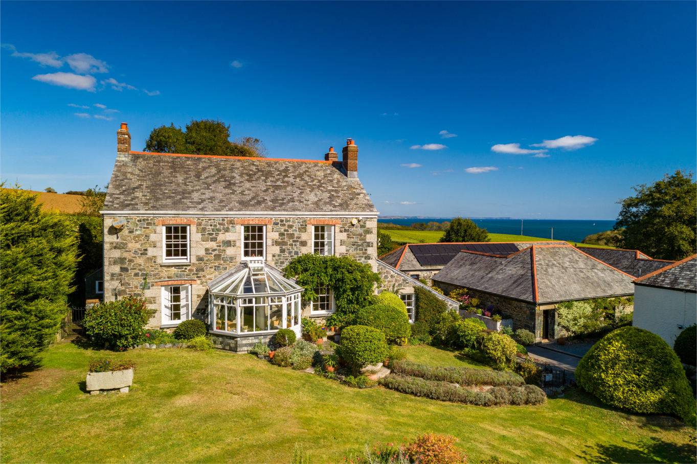 A gorgeous south facing Georgian farmhouse of classic proportions, located on the stunning Lizard Peninsula within 1 mile of Porthallow Cove. The property also benefits from three holiday lets within the adjacent courtyard of very attractive stone barns, providing useful income. There are further large stone undeveloped barns within the courtyard that currently provide storage and garaging, offering excellent potential for a multitude of uses. All set within delightful private grounds of circa 1.5 acres, which also enjoy lovely views to the coast.