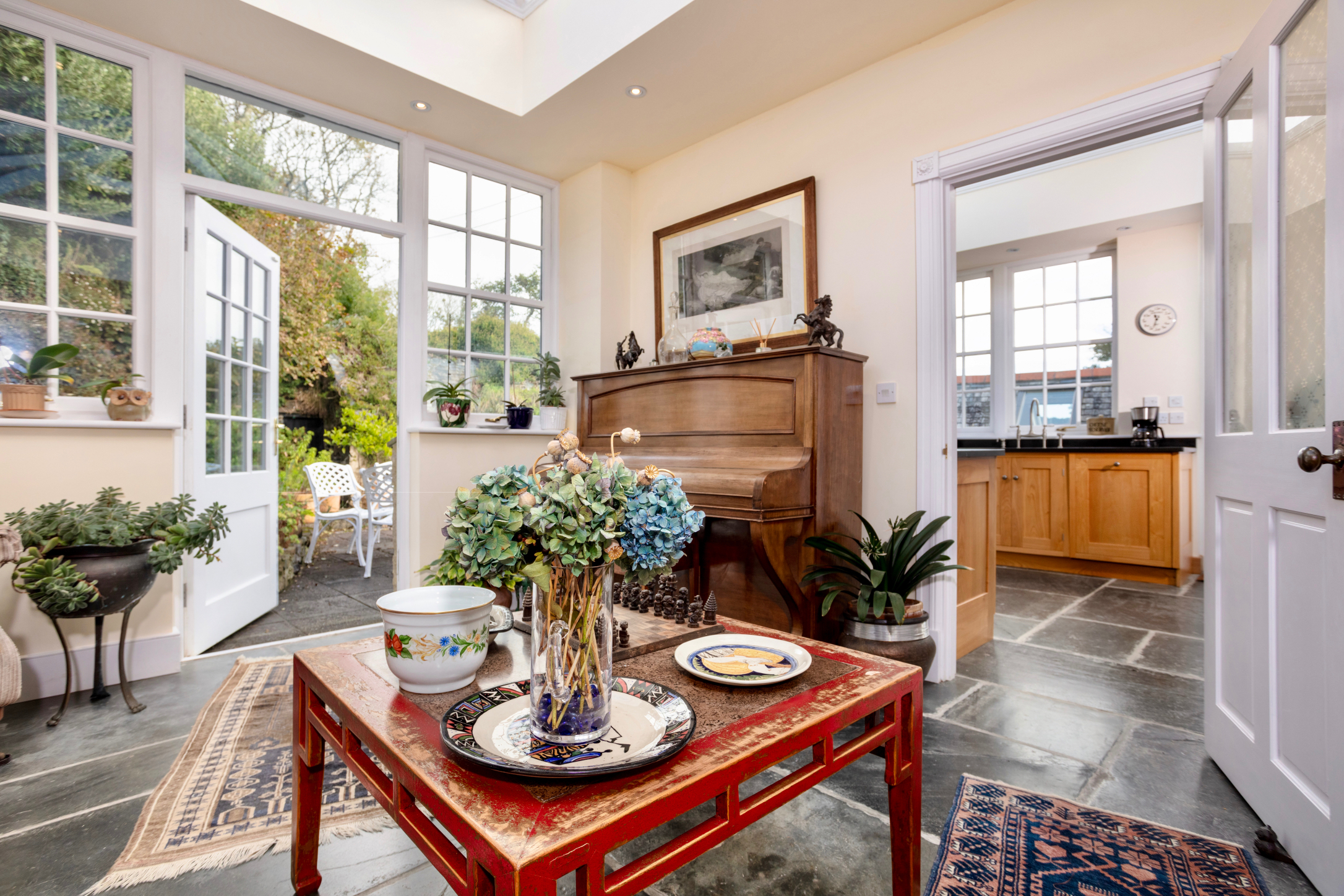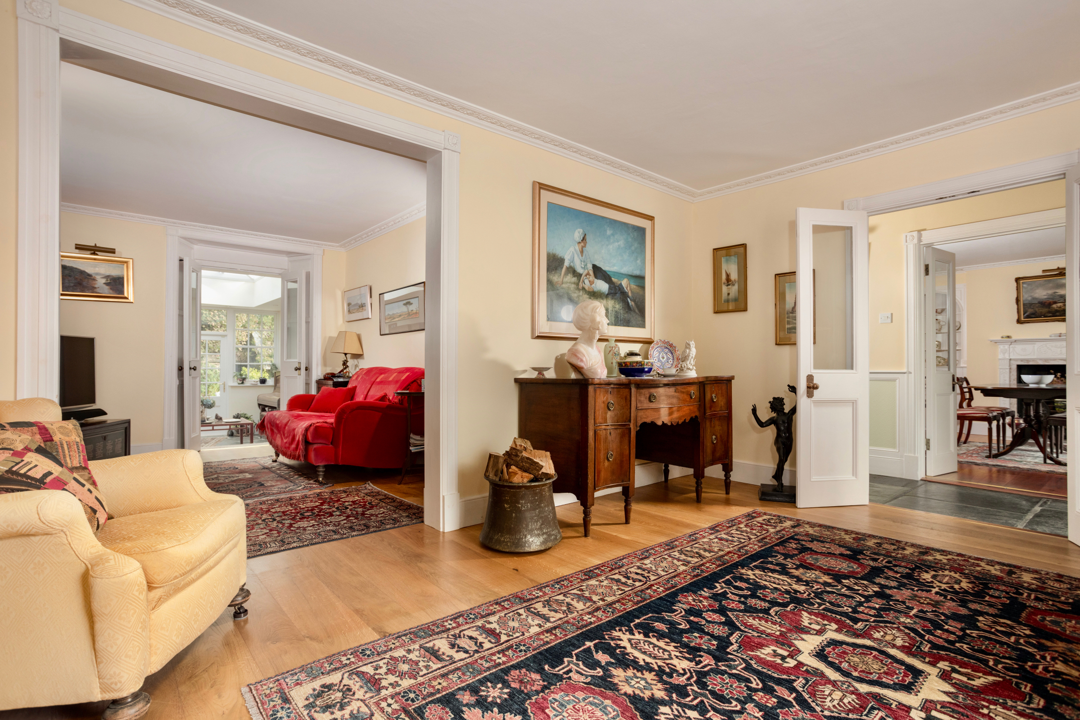 The principal residence is a traditional, double fronted, southerly facing house set out in typical Georgian fashion. An entrance porch opens into a welcoming hallway, flanked by the dining room and sitting room. The kitchen is located at the rear and has recently been beautifully extended with an adjoining garden room. The breakfast room seamlessly flows from the kitchen and combines to provide a fabulously sociable layout and a great space for entertaining. To the eastern side is a large extension currently utilised as a music room and studio, but we understand it had previously been set out as a self contained annexe.