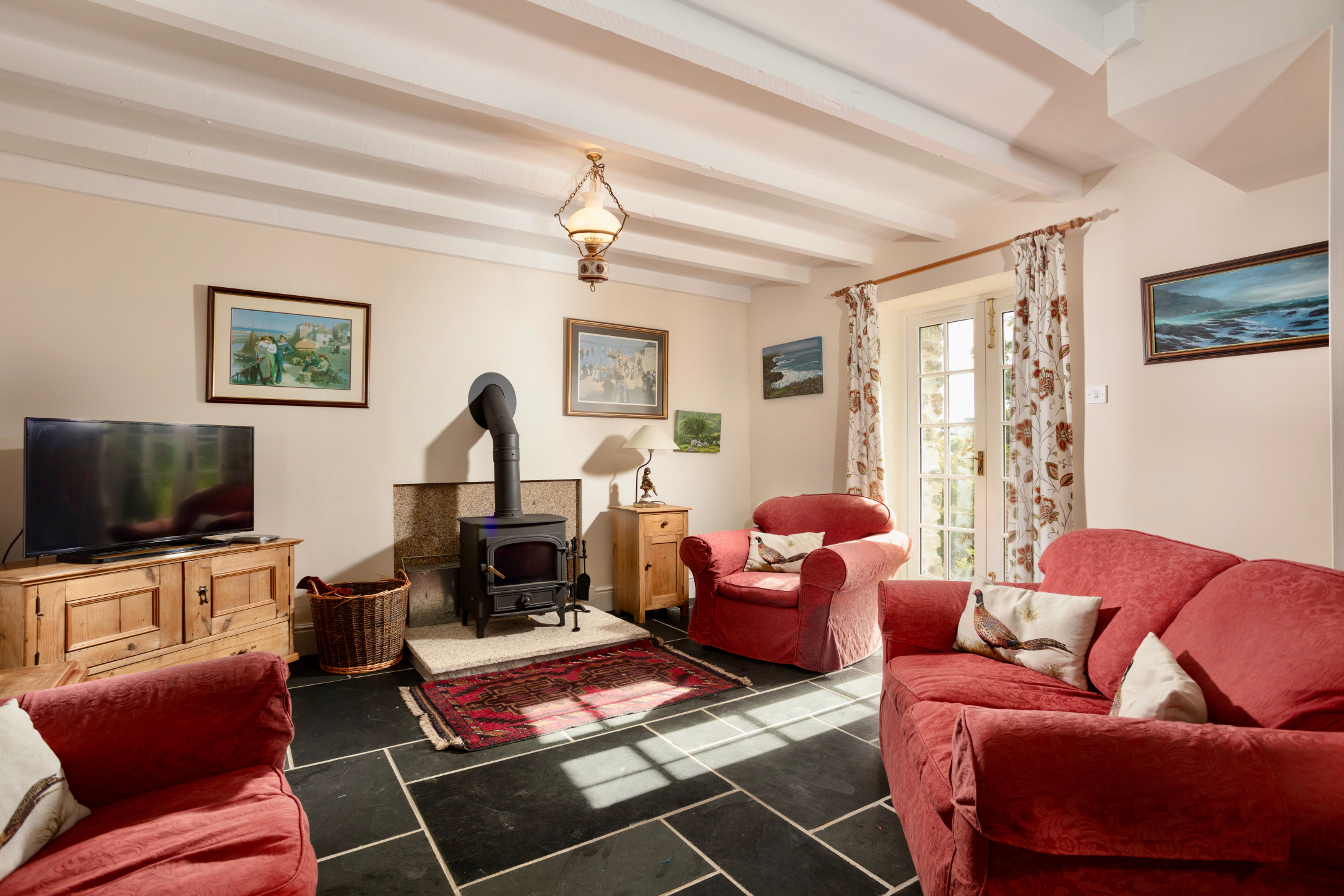 The horseshoe shaped courtyard of stone barns are centred around an attractive large central barn/garage, perfect for anyone with an interest in classic cars. Two cottages are positioned on the southerly side, Rainbow Cottage being a two storey and the second, Rainbow End, being just on the first floor, with a large storage area under. A third barn, Cove View, is positioned on the northerly side, enjoying delightful views across the neighbouring farmland towards the sea. In addition, there is further single storey barn offering an opportunity for conversion, to create more letting units or perhaps an alternative commercial use. The properties are set centrally within the delightful gardens and grounds, which extend to circa 1.5 acres.