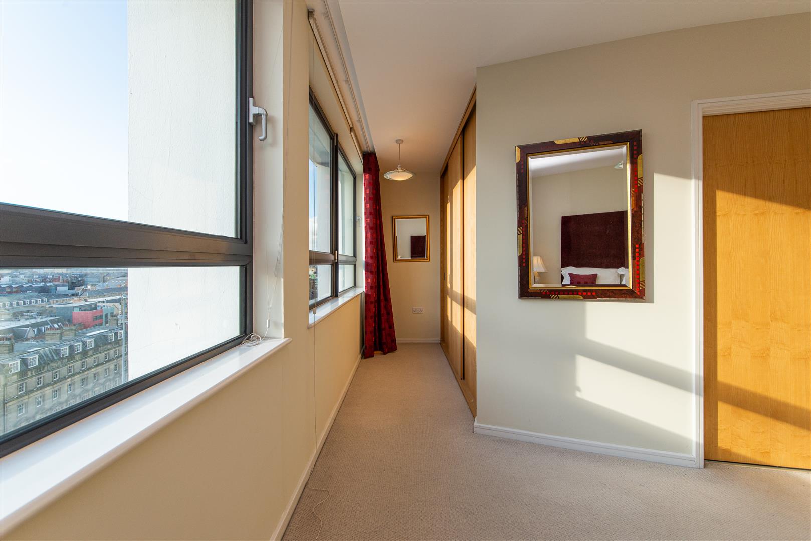 On the lower level, the main entrance hall leads to three well-appointed double bedrooms with windows that maximise city views. The master suite includes extensive fitted wardrobes and a modern en-suite shower room. Wide aspect windows in the master suite offer superb views towards Mosley Street and St. Nicholas Cathedral. A further bathroom services the remaining bedrooms, featuring mosaic tiles and a vanity unit.