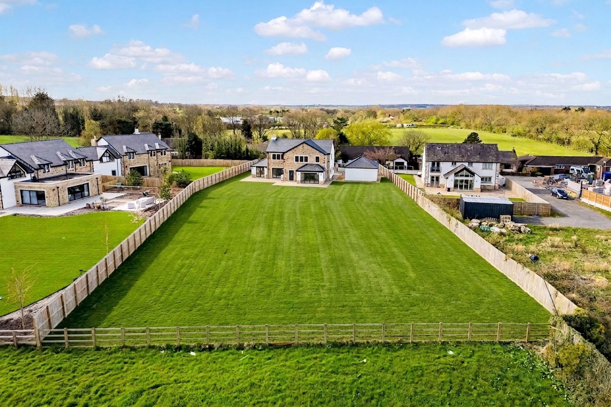To the rear, the house opens onto an extensive stone terrace that runs the full width of the property, creating a series of generous outdoor seating and dining zones that flow directly from the kitchen, lounge and garden room. Beyond, an impressive, level expanse of lawn stretches away towards open countryside, enclosed by fencing for privacy yet open enough to capture long, green belt views and evening sunsets, and here the purchaser will also benefit from a fully designed garden scheme by a leading garden design specialist, with complete drawings included in the sale so that the outside space can be realised to its full potential in their own time.