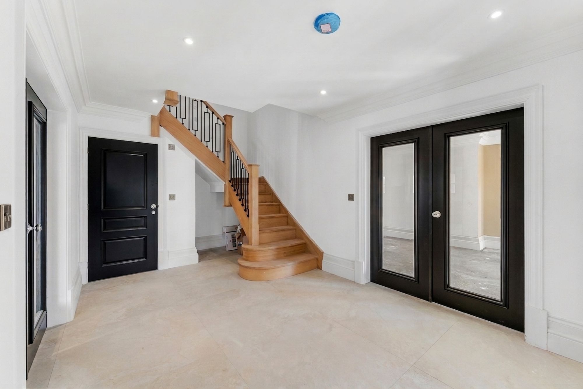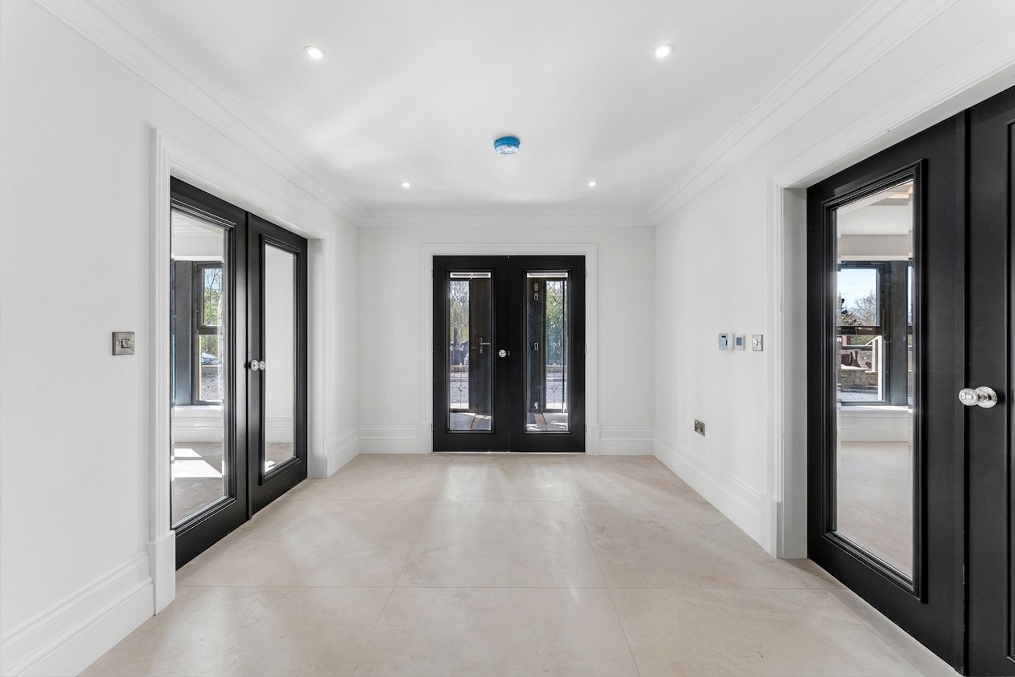 The reception hallway at Ravensworth sets an immediately impressive tone, opening through double doors into a broad, light filled space framed by deep skirtings, tall architraves and crisp white walls ready to receive the purchaser’s chosen finishes. A beautifully crafted oak staircase with elegant wrought iron balustrades rises gently from the hall, its sweep adding both warmth and a subtle sense of theatre, while a series of glazed internal doors in a contrasting dark finish draw the eye through to the principal reception rooms, creating long sightlines and a lovely flow for entertaining.