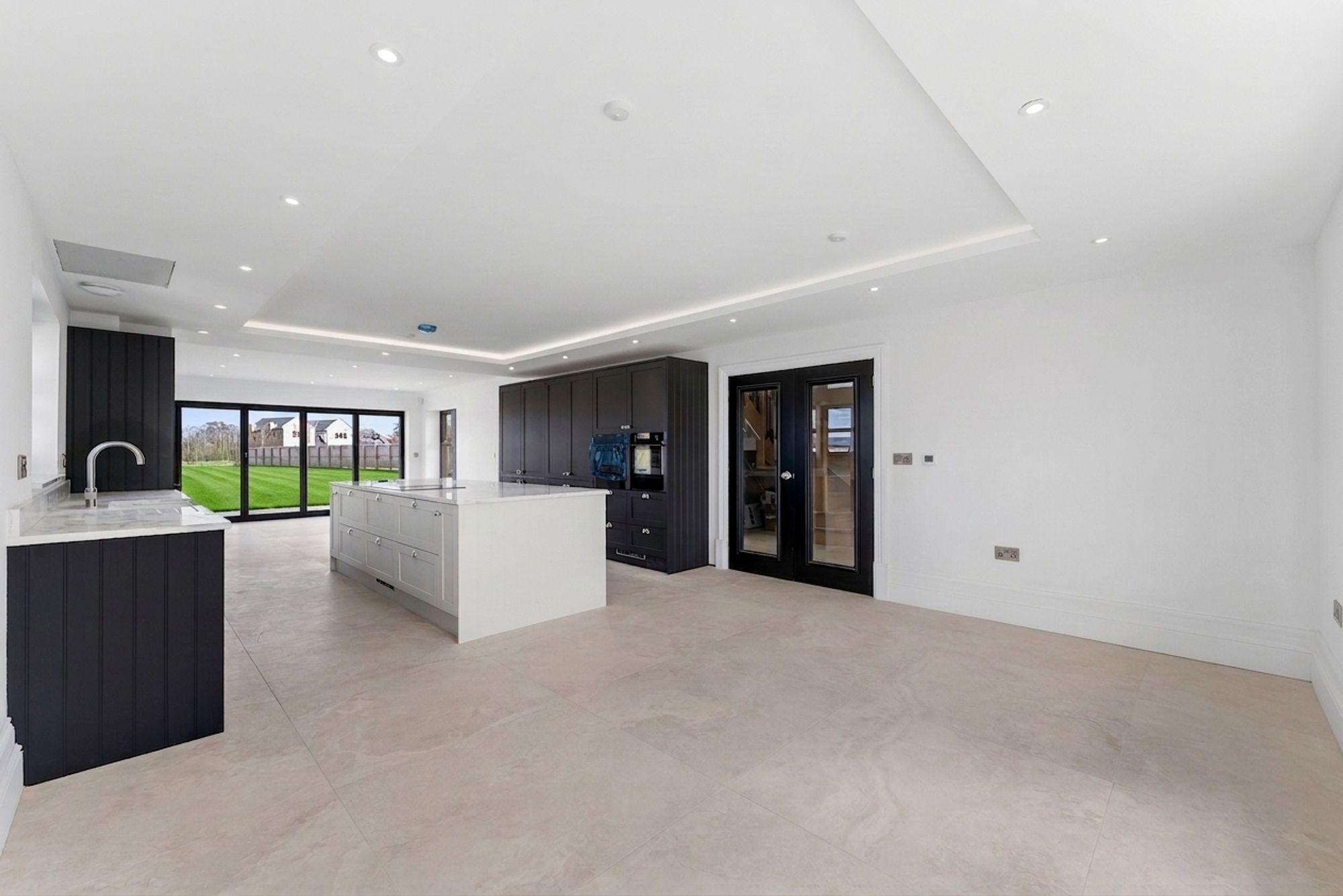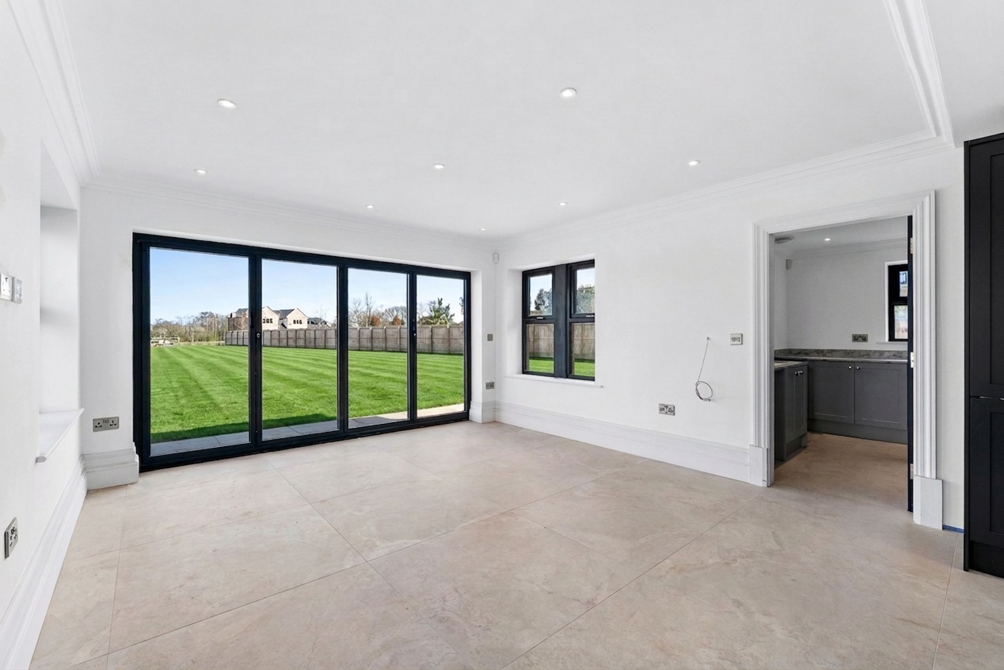 The adjoining living and dining area is flooded with light from multiple windows and the full height glazing to the rear, creating generous areas for relaxed seating, informal dining and children’s play, all within sight of the kitchen. Off the main kitchen, a well-proportioned utility room provides valuable back of house space, with matching cabinetry and worktops, an additional sink and appliance space, ideal for laundry, boots and dogs, keeping the main living area beautifully uncluttered.