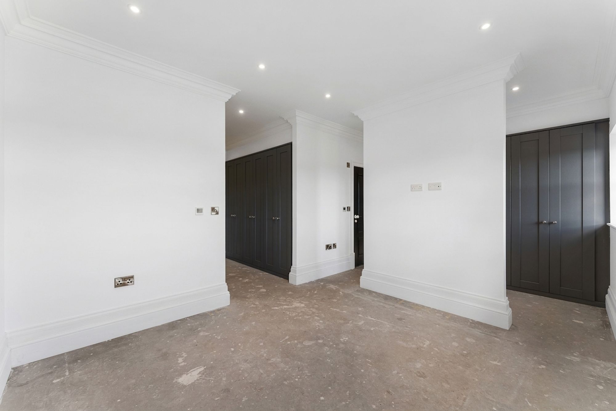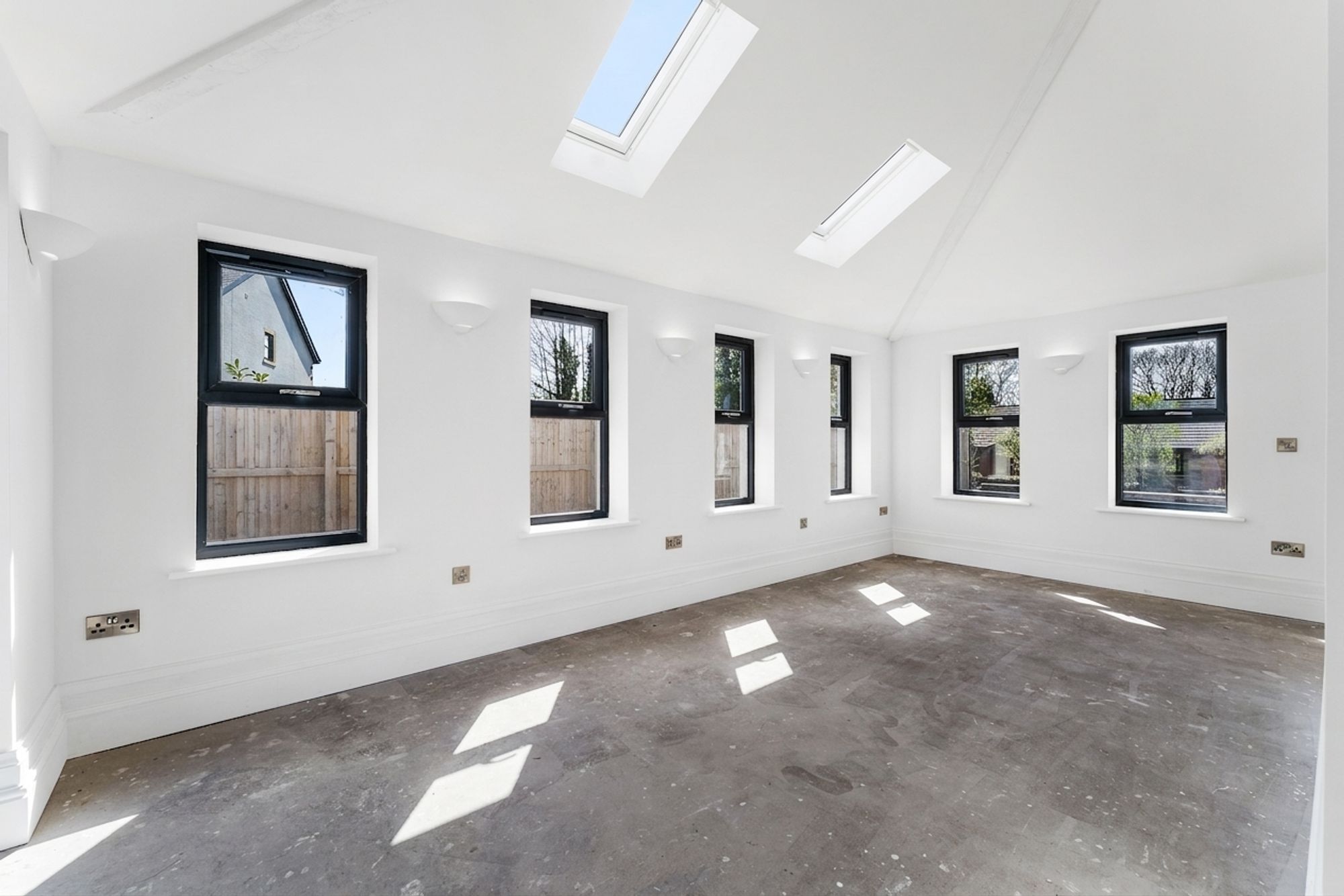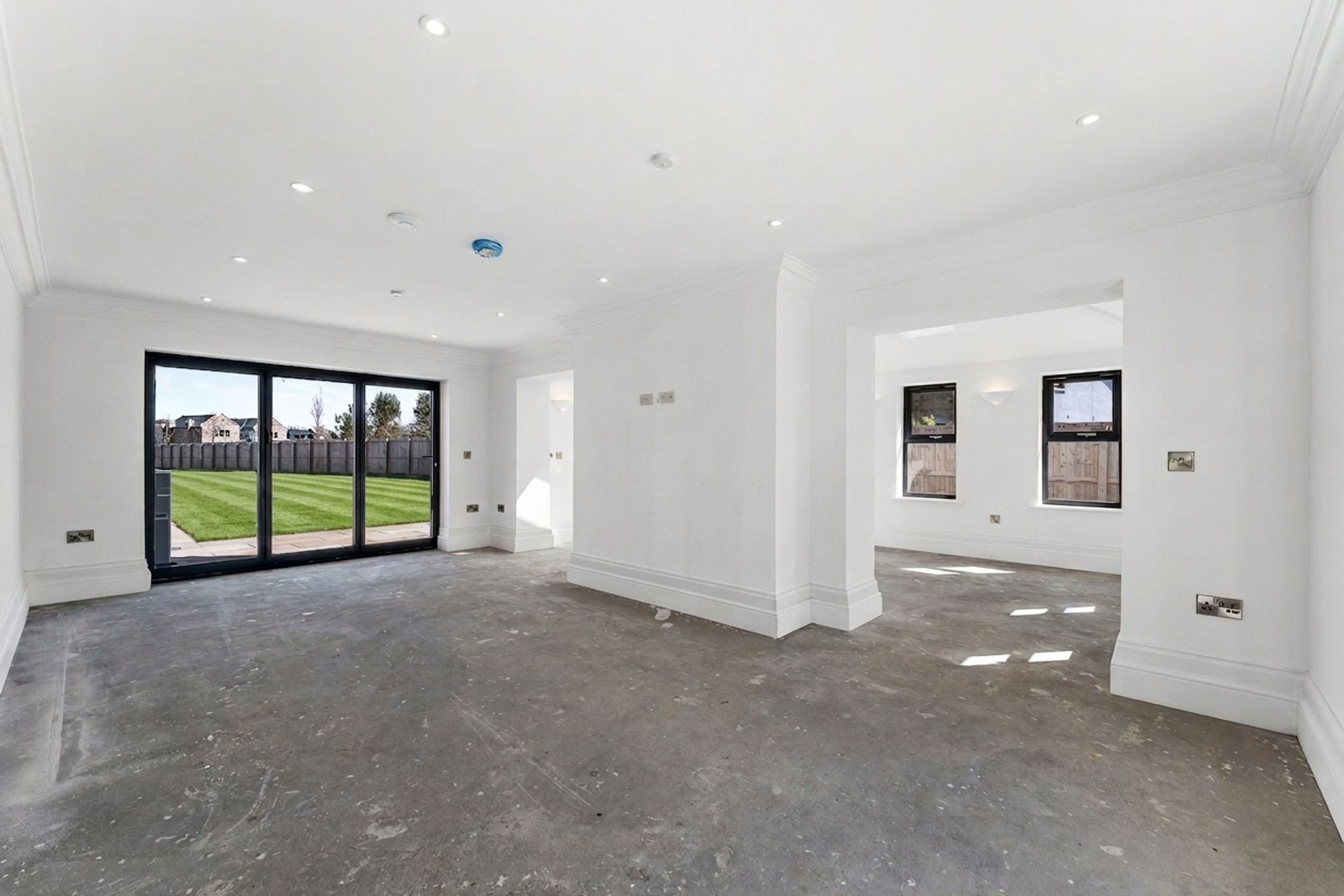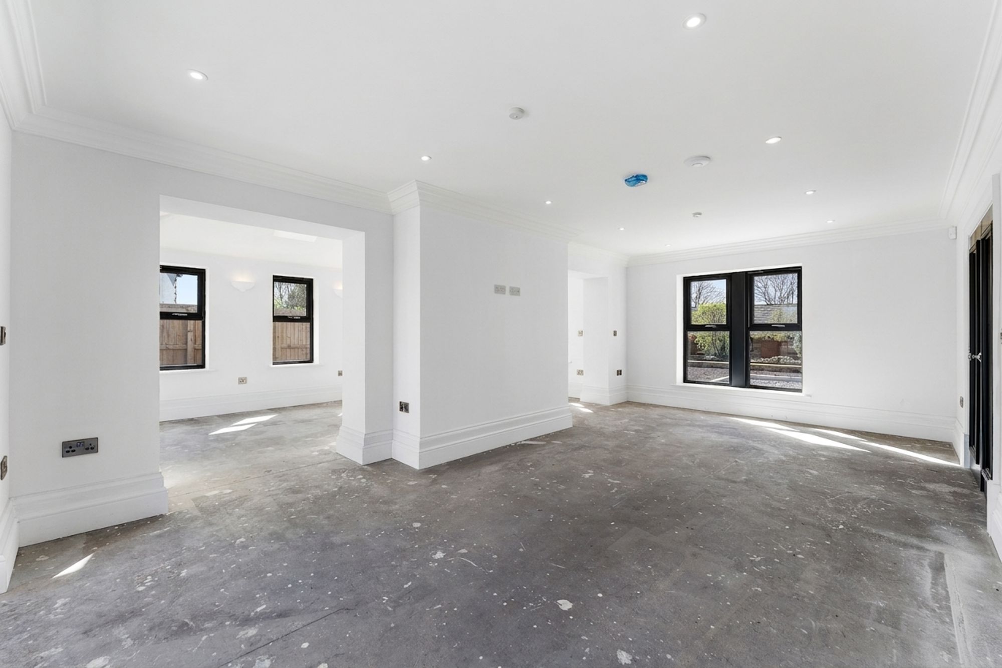 The principal lounge and adjoining garden room form a beautifully adaptable sweep of living space, running the full depth of the house and framing views to the gardens at both the front and rear. Crisp white walls, deep skirtings and generous ceiling heights create a calm, gallery like backdrop ready for the purchaser’s chosen flooring and furnishings, while multiple sets of glazed doors and full height windows draw light throughout the space and invite effortless circulation between the two rooms.