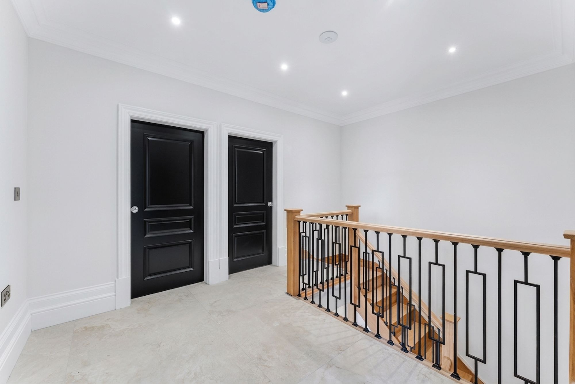 A gently rising oak staircase with bespoke black metal balustrades forms a strong architectural spine through the house, its clean geometry and warm timber handrail giving a quietly luxurious feel to everyday comings and goings. At first floor level it arrives on a generous landing, finished with the same crisp cornicing and deep skirtings as the ground floor, and from here there is direct access to all four bedrooms, reinforcing the sense of a well-considered, family friendly layout.
