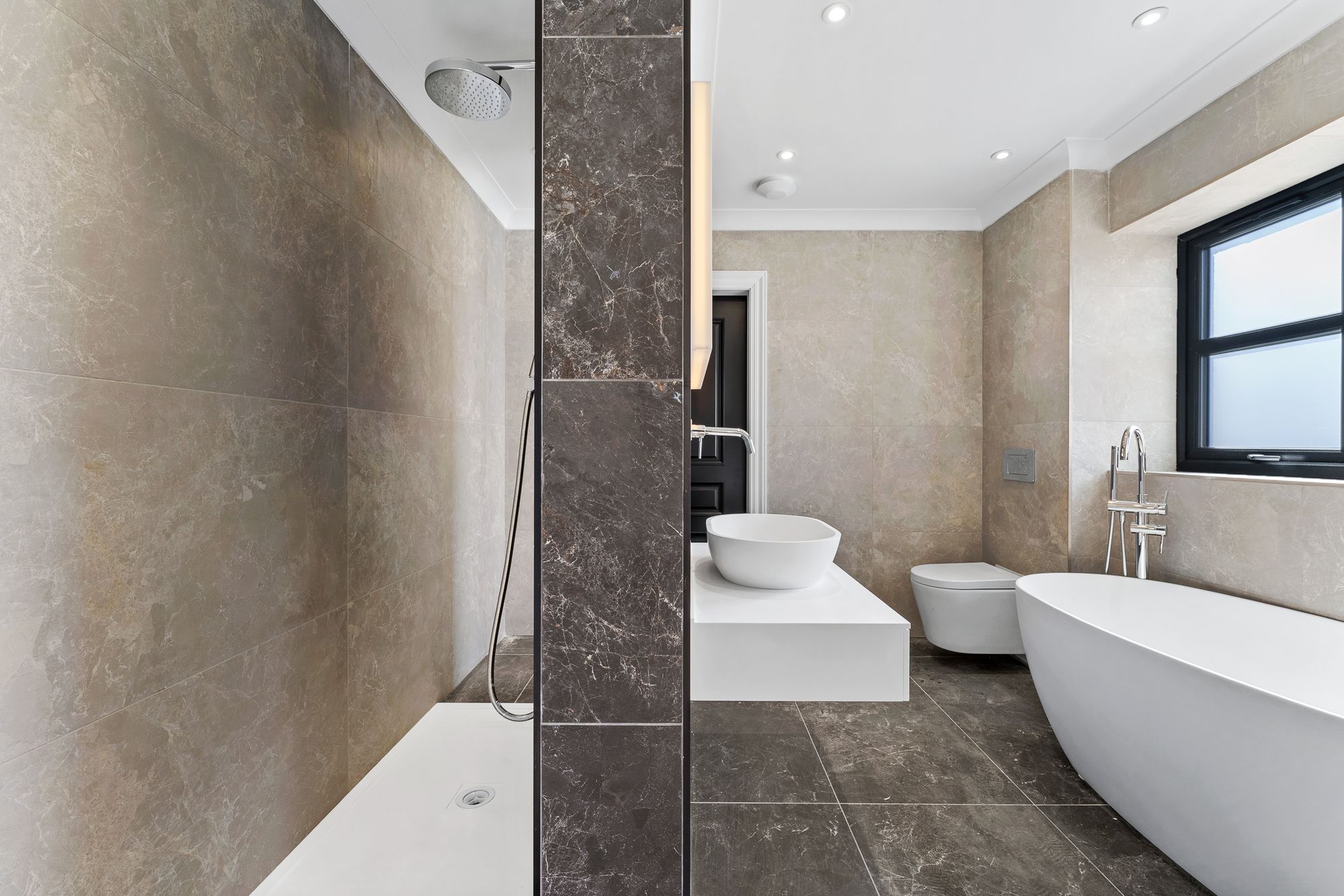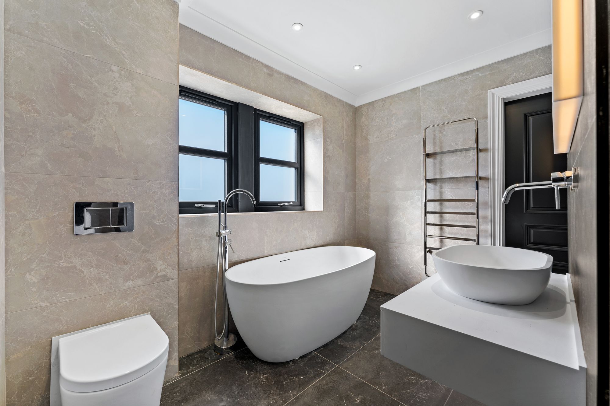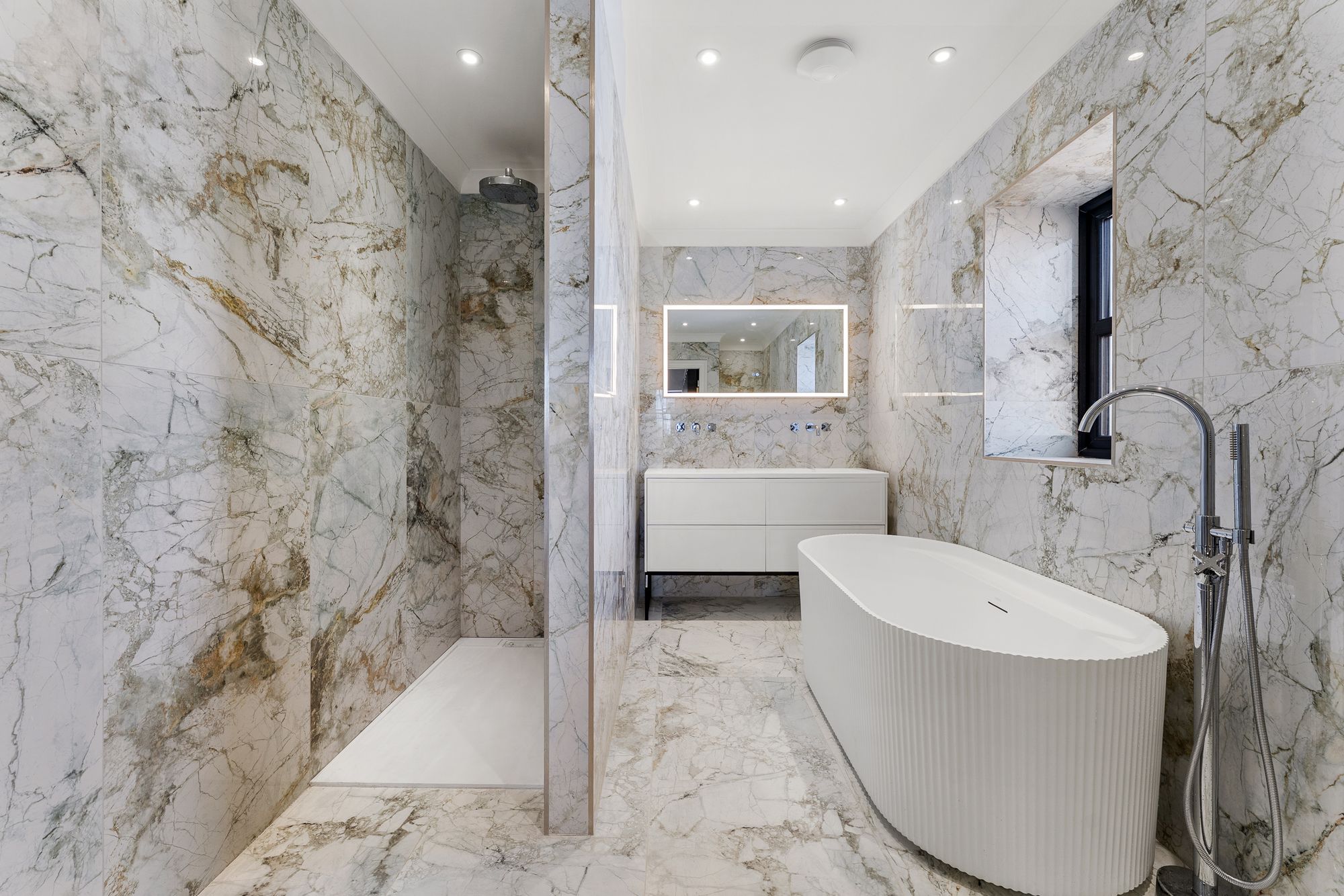 The three en suites at Ravensworth feel closer to private spa suites than conventional bathrooms, each one wrapped in expanses of large format stone effect tiling that give depth, movement and a quietly dramatic backdrop to the Lusso sanitaryware and Blum cabinetry. Two of the suites, including the principal and the Jack and Jill arrangement, are indulgent five piece rooms, centred around sculptural freestanding Lusso baths, walk in showers with rainfall heads and separate hand showers, twin basins set on sleek Blum vanity units and wall hung WCs, all finished with backlit mirrors and designer brassware to create softly lit, hotel grade sanctuaries for unhurried evening rituals.