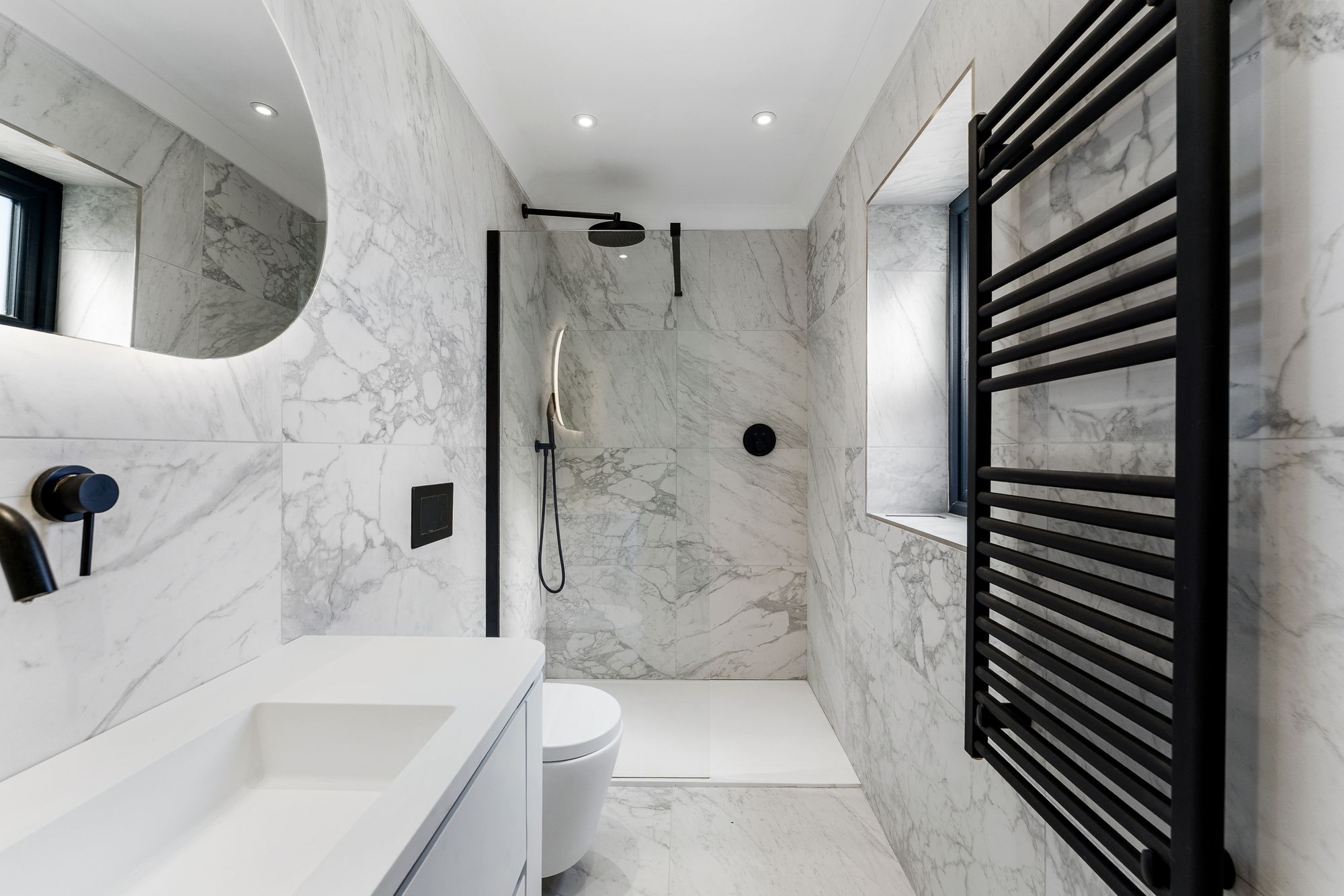 The third en suite is a beautifully executed three-piece shower room, with a generous walk in enclosure, wall hung basin on a Blum vanity and wall mounted WC, again finished with Lusso fitments, heated towel rail and a halo of light from an illuminated mirror that keeps the space bright and flattering at all times. Across all three, the consistency of materials and detailing matte black or polished chrome fittings, carefully mitred tile edges, recessed niches and concealed storage reinforce a sense of elevated, joined up design, so that every bedroom enjoys its own distinctly luxurious, spa inspired retreat.