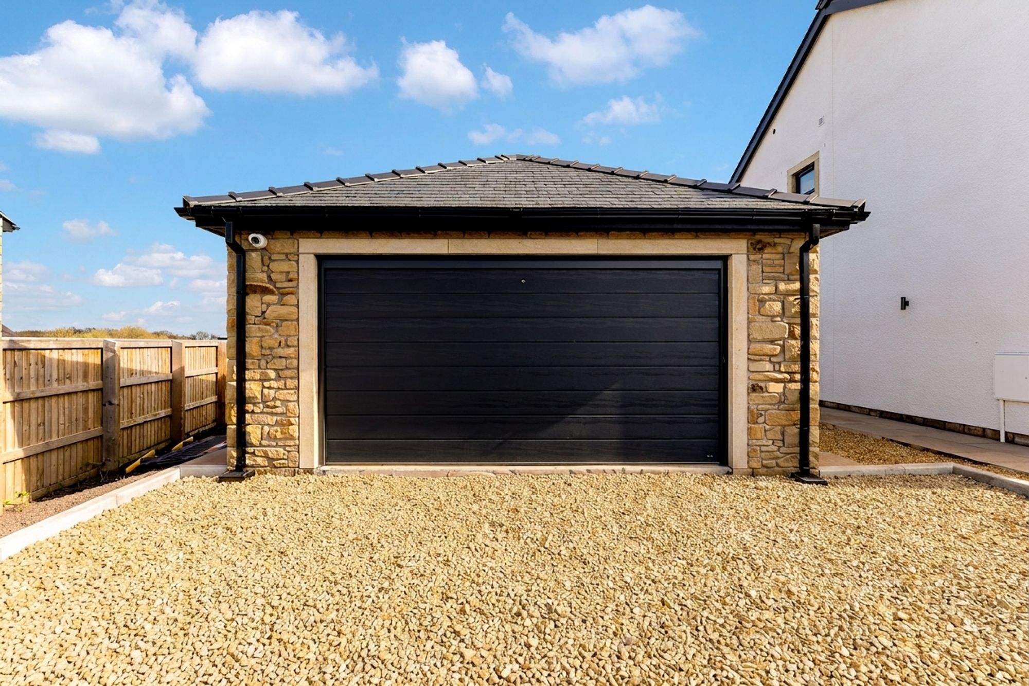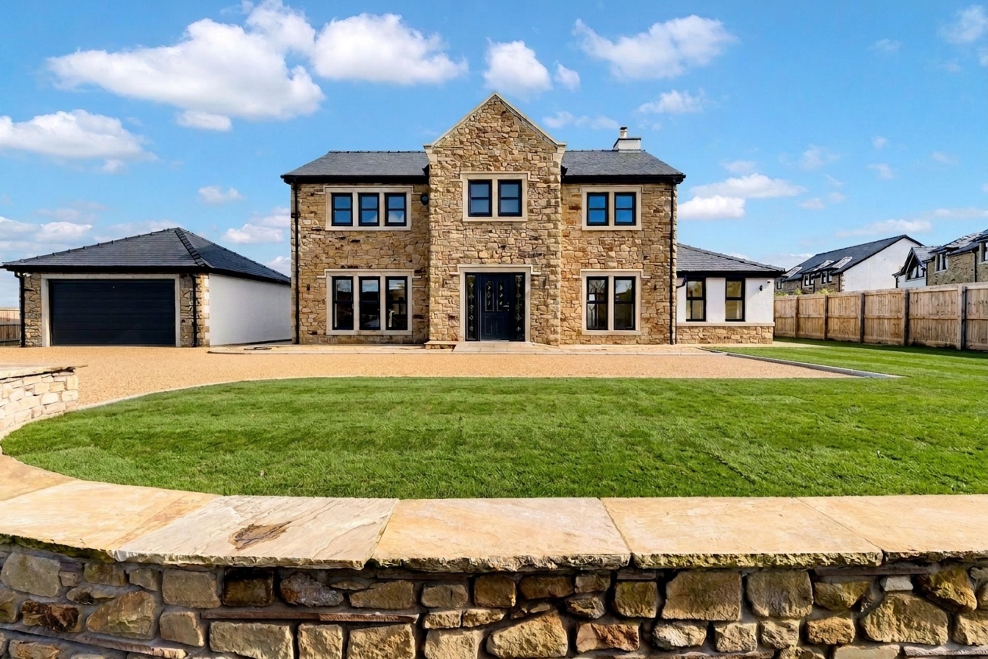 Approached through private gates, Ravensworth presents a striking stone-built frontage, with a deep lawned fore garden and a wide sweep of driveway that provides plentiful parking and turning for several cars. The drive culminates at a detached double garage, set slightly to one side so that the house and its handsome central elevation remain the main event, while still giving excellent everyday practicality and storage.