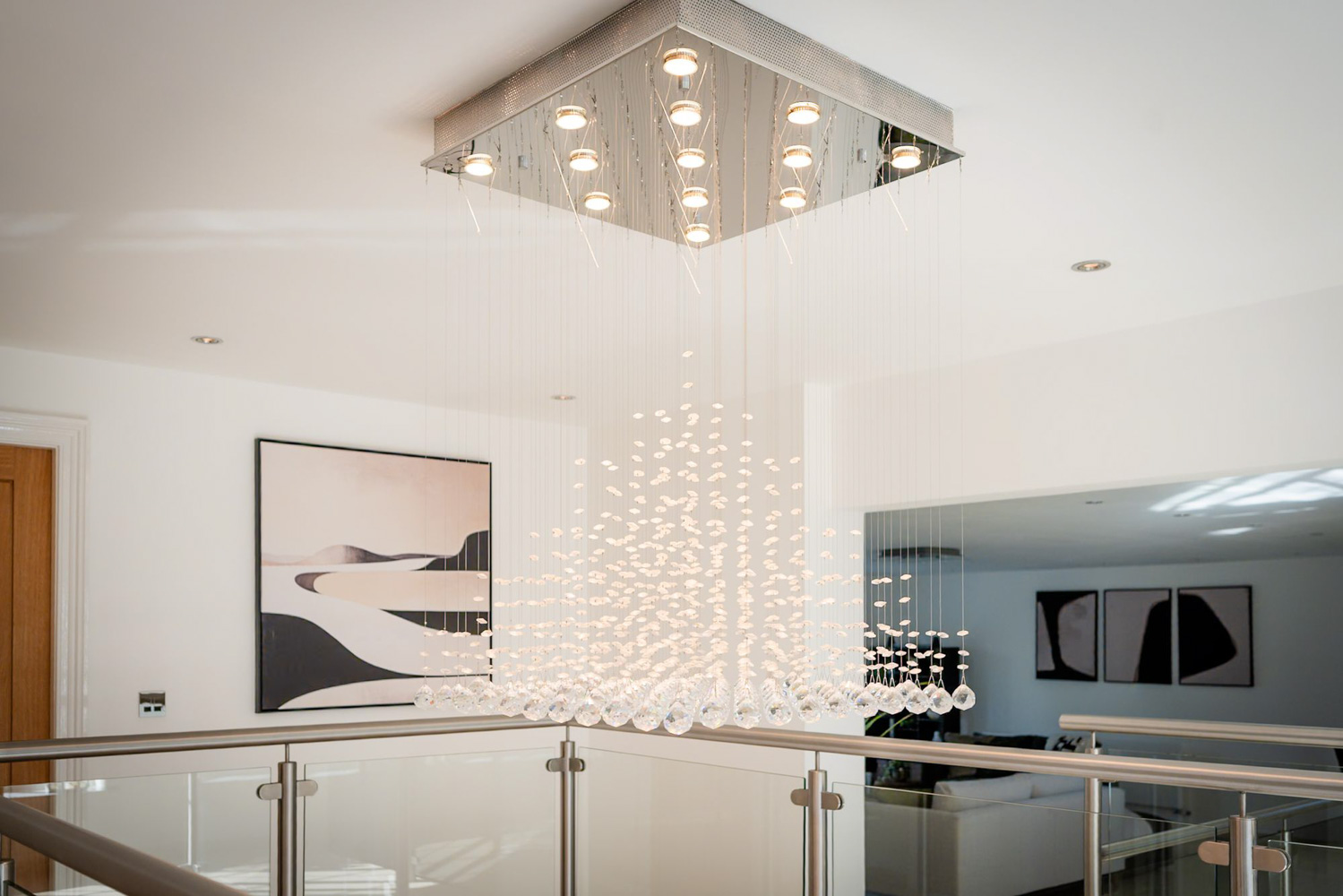 The landing area connects the first floor and quietly becomes an experience in its own right rather than simply a way through. Glass balustrades frame open views across the stairwell, allowing light to move easily between levels and giving the whole house a gentle sense of cohesion. There is an immediate feeling of openness and connection, a soft pause between rooms where you instinctively slow your step. It is a place you pass through many times a day, yet it never stops offering that subtle lift – a small, daily reminder of the care and consideration that have shaped this home.