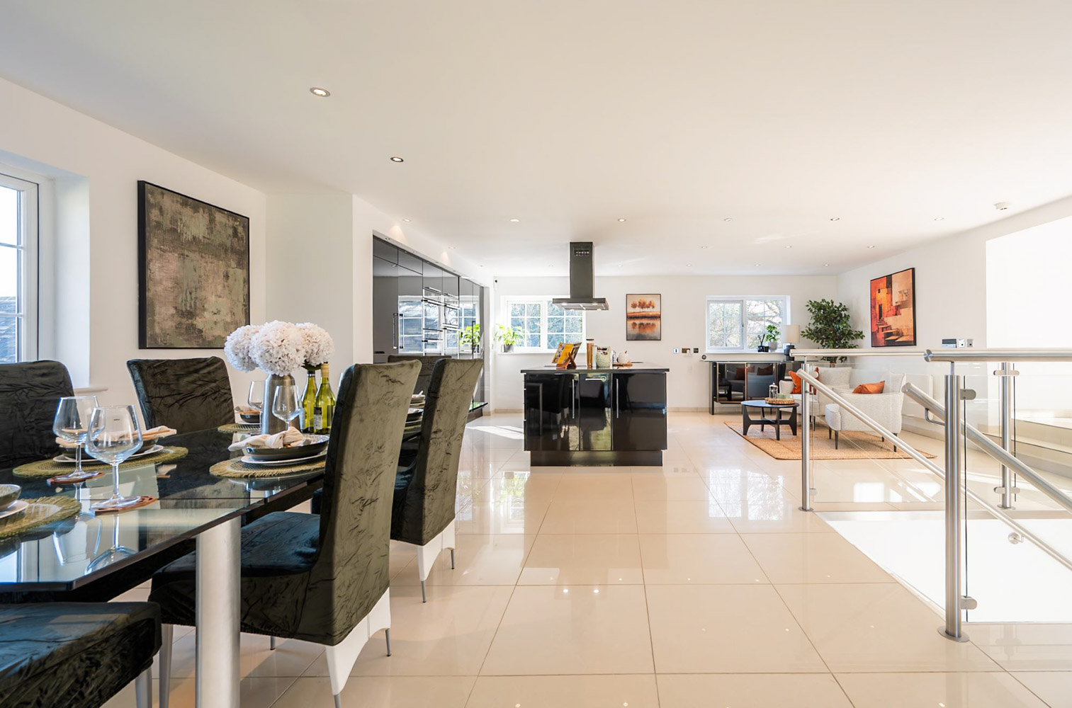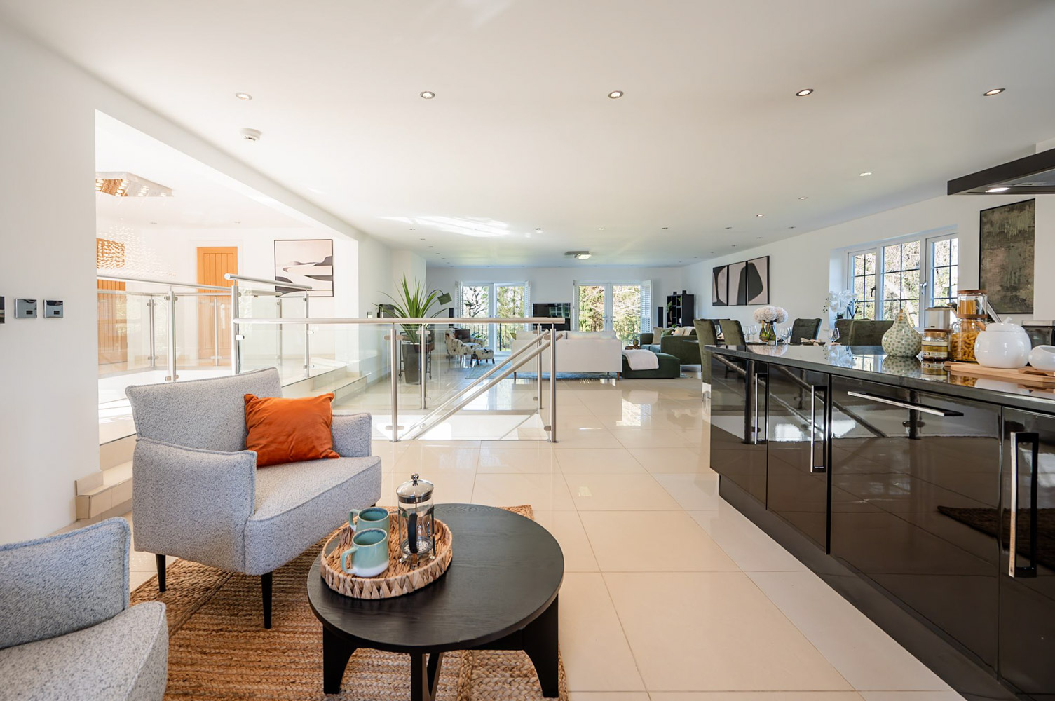 Step inside and the double-height hallway feels like a moment of uplift. Glass and brushed steel balustrades catch and scatter the light, polished tiles lead you onward, and the volume of the space wraps itself around you in a way that is at once impressive and deeply soothing. It is a hall that invites you to pause, to look up to exhale. From here, the ground floor flows out in all directions, each room intuitively placed so that even on a first visit you instinctively know where to go next, the kind of layout that lets you imagine, almost immediately, what it would be like to call this place home.