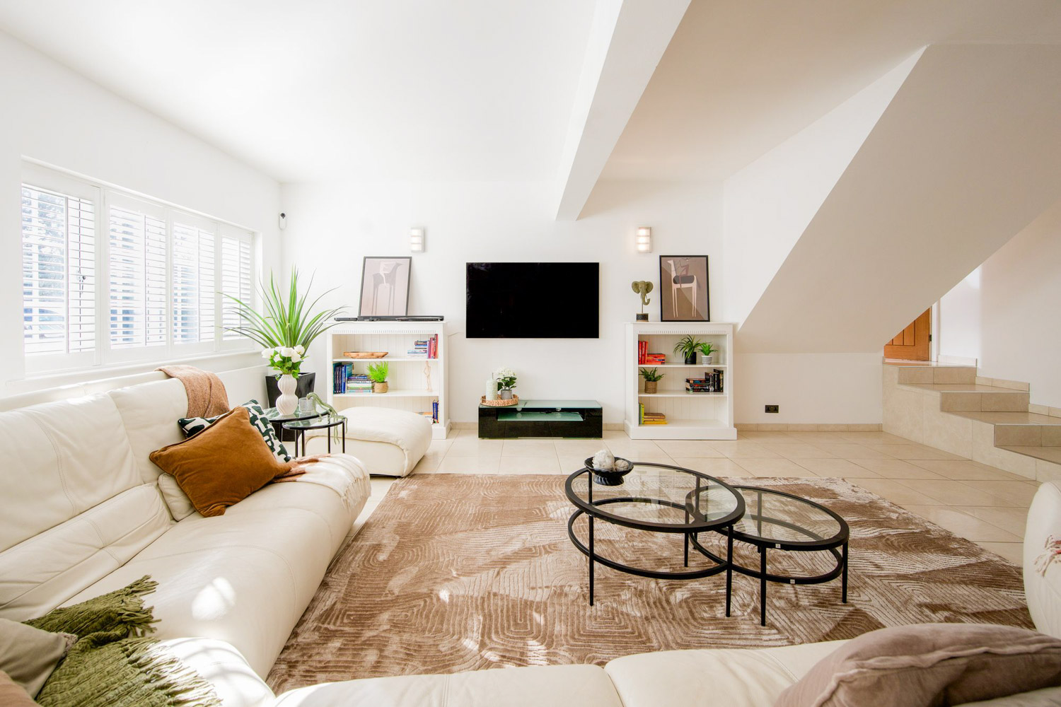 On the ground floor, and at the front of the house, the principal lounge feels like the place everyone will naturally drift to and be reluctant to leave. Wide shuttered windows draw in soft light from two directions, washing over a calm, neutral palette that makes the room feel open, airy and quietly elegant. A bespoke library wall with illuminated shelving turns books, art and favourite objects into a living gallery, giving the space soul as well as style, while opposite, a sleek media wall frames the TV and creates a natural focal point for evenings in. Generous corner sofas invite you to stretch out, pile in and linger, proving that this is a room equally at ease with a slow Sunday morning and a house full of friends.