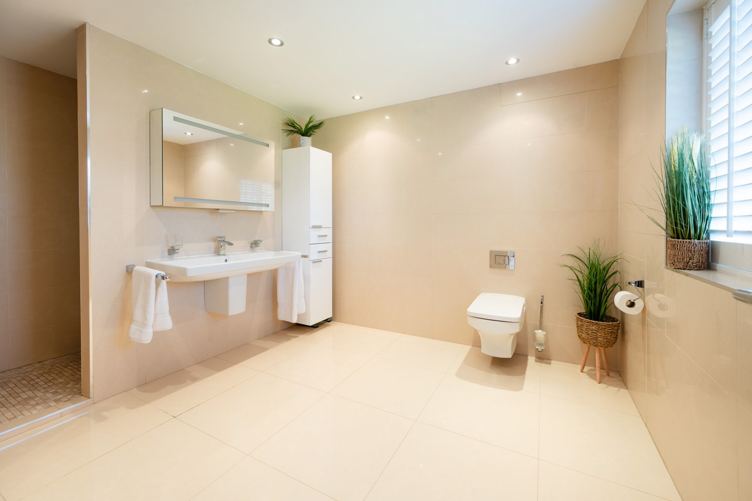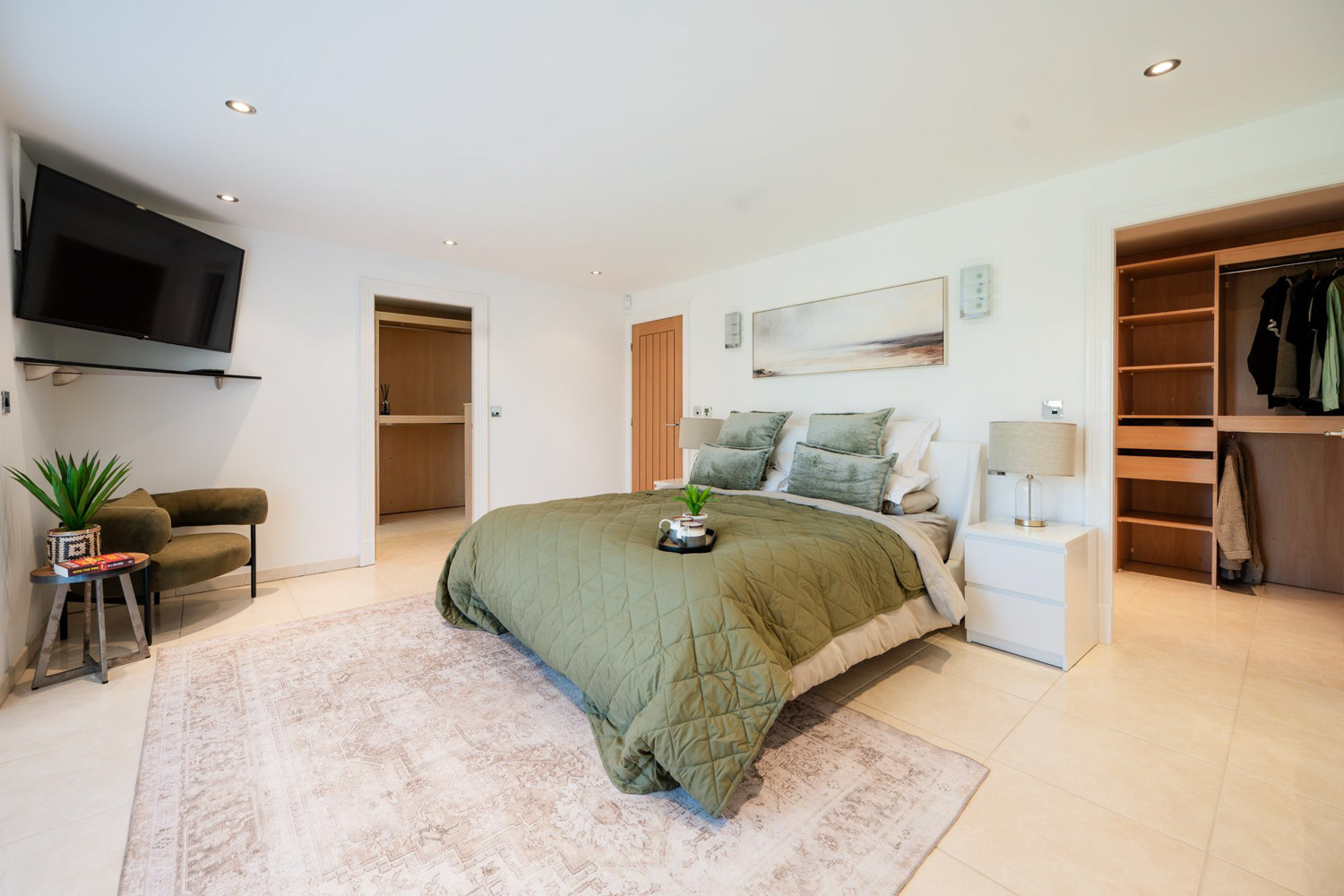 A second suite on this level brings even more nuance to the layout. Here, a generous bedroom flows into its own dressing room, where open shelving, drawers and hanging space make every day routines feel quietly luxurious. Beyond, a dark-tiled en suite with mosaic- based walk-in shower, curved vanity and wall-hung WC feels indulgent yet reassuringly practical, designed as much for daily use as for moments of escape. Nearby, the family bathroom is finished in warm neutrals, with a deep tub beneath shuttered windows, soft lighting and thoughtful vanity storage, a room that invites you to close the door on the day and stay a little longer than you meant to.