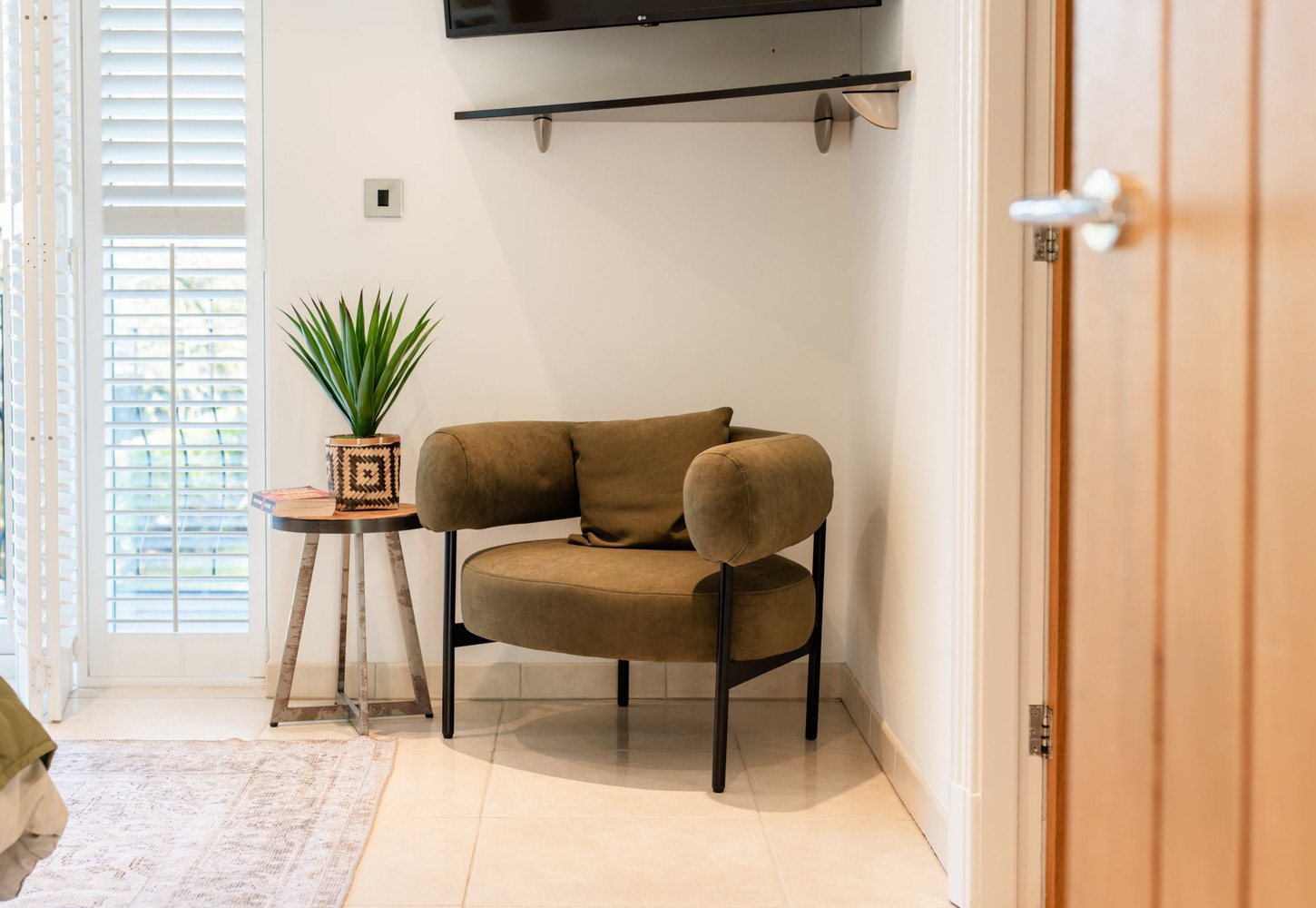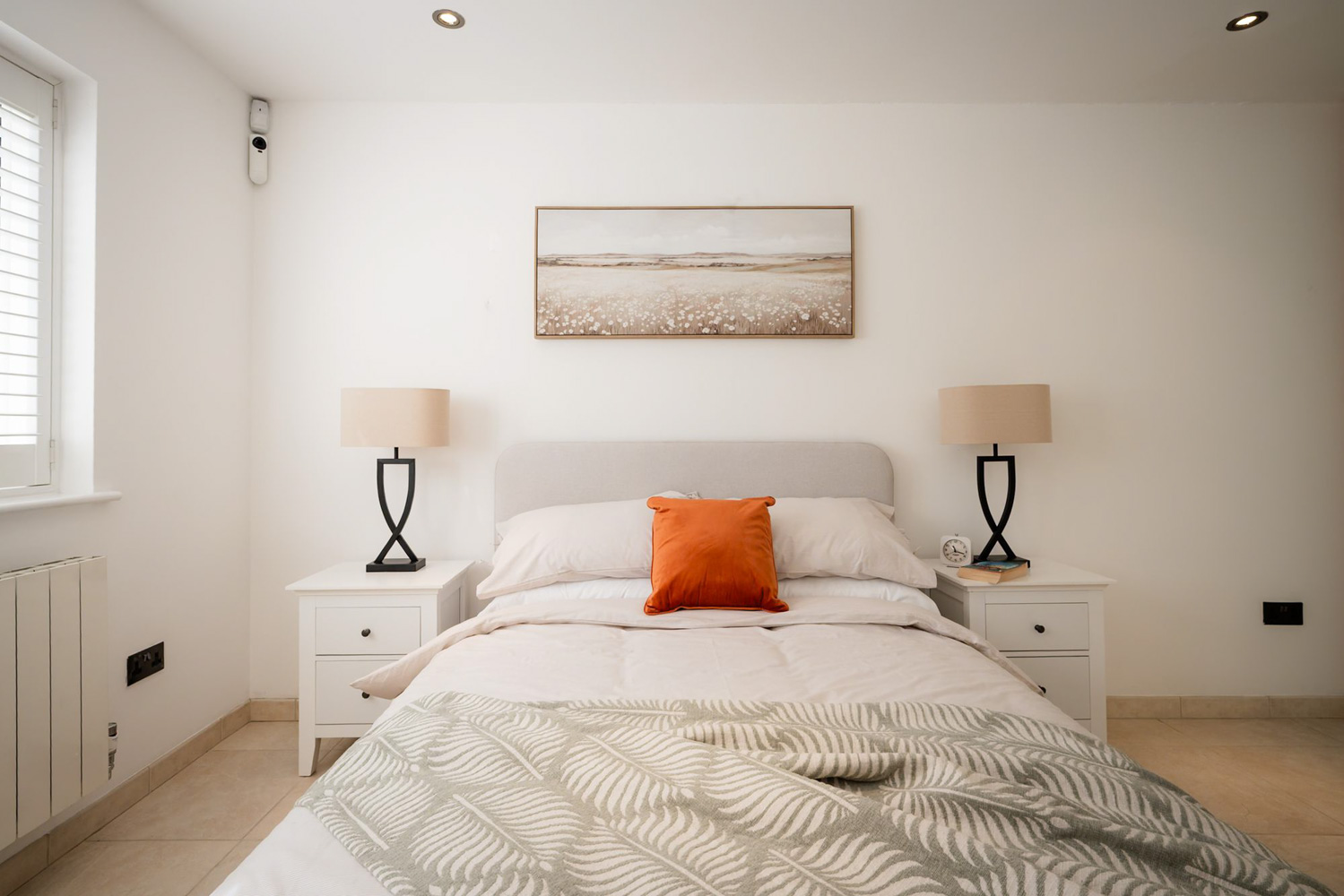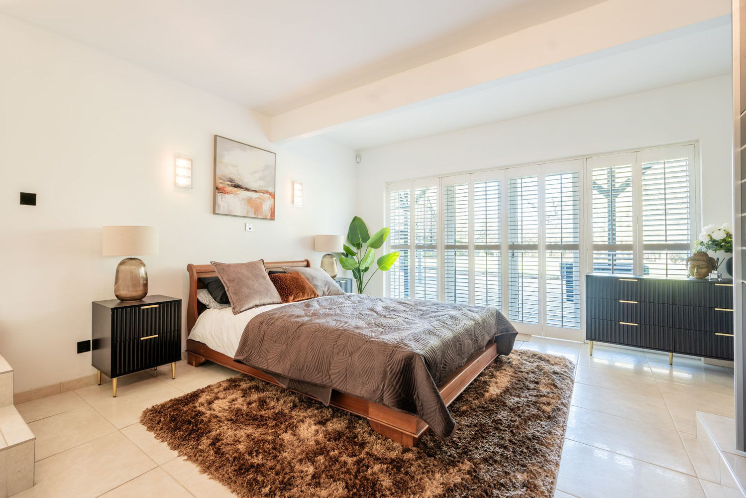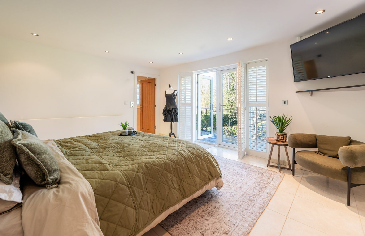 The ground floor also hides a gentle surprise: a beautifully appointed bedroom suite that opens directly onto the garden. Glossy fitted wardrobes line one wall in a clean, uninterrupted run, while double doors with plantation shutters frame a view of green and sky that changes with the seasons. Step into the en suite and the mood shifts again, black tiling, a walk-in rainfall shower and a contemporary vanity combining to bring a boutique-hotel atmosphere to this calm corner at the edge of the lawn.