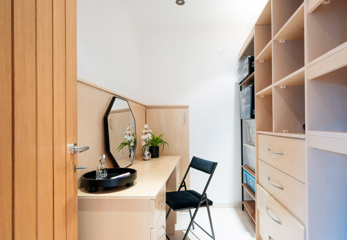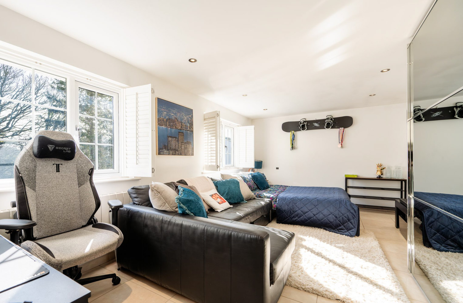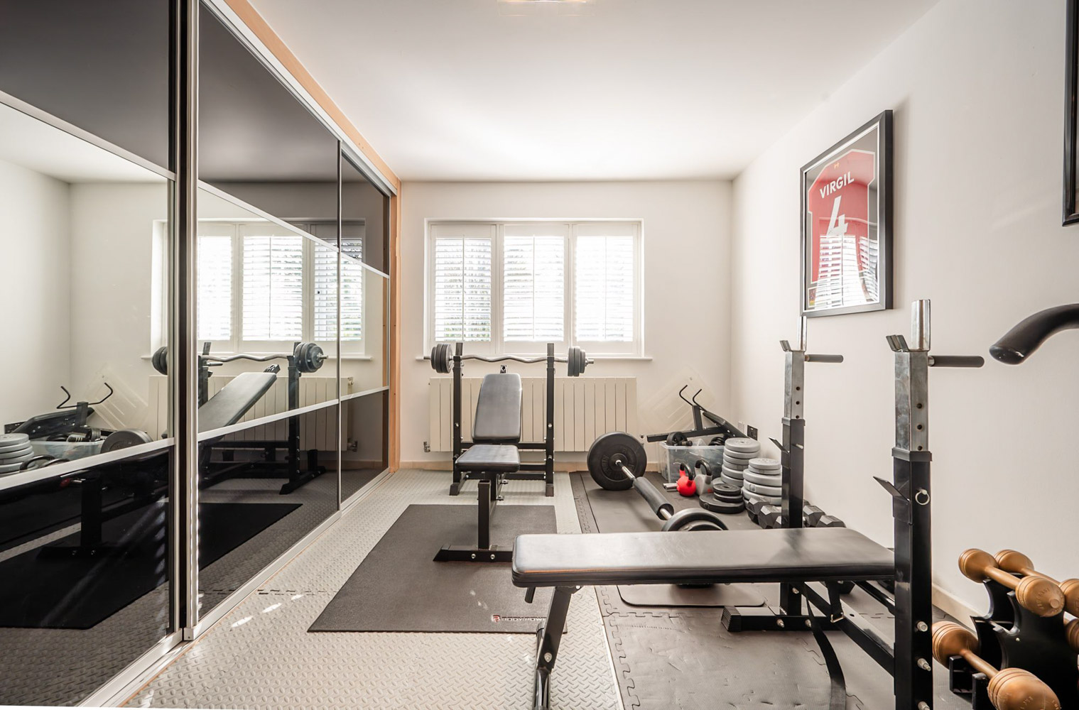 To one side of the hallway, two highly adaptable rooms give the house an extra gear. One is currently a home gym, its rubberised flooring and natural light providing the feel of a private training space, while the other is a bright, composed double bedroom with built-in wardrobes and space for a dressing or study area. It is easy to picture quiet work, relaxation or creative projects here, with the layout lending itself just as naturally to use as a dedicated home office if desired.