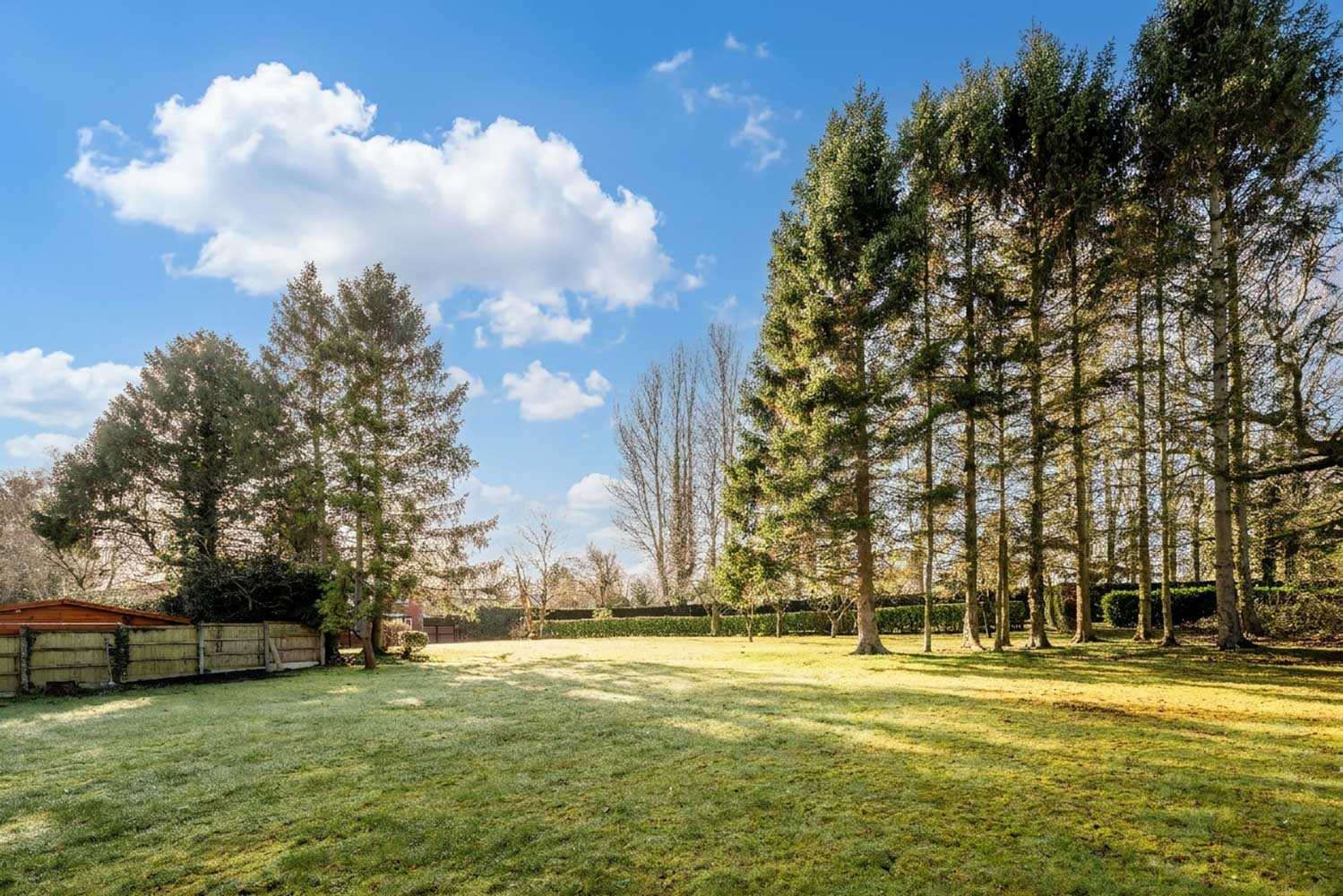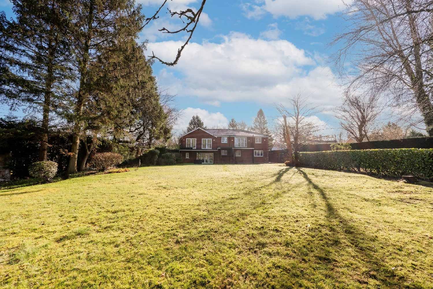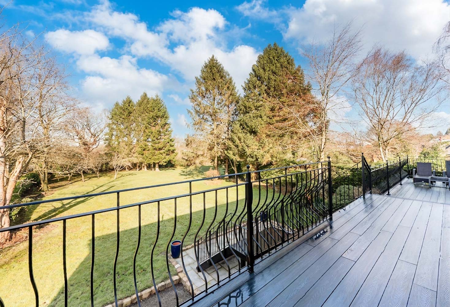 To the rear, the garden loosens and lengthens into a sequence of green rooms. Broad, manicured lawns invite bare feet, impromptu games and blankets spread for summer picnics; deeper pockets of established planting offer shaded corners for a book, a conversation, a moment alone. Beyond, a soft backdrop of mature trees and hedging draws the eye outwards and upwards, giving structure, shelter and privacy while still letting the sky feel vast. From the raised terrace and the balcony above, you look across it all, morning light catching on the grass, long afternoons slipping into evenings where tables are laid outside, candles are lit and the garden becomes an extension of the house itself.