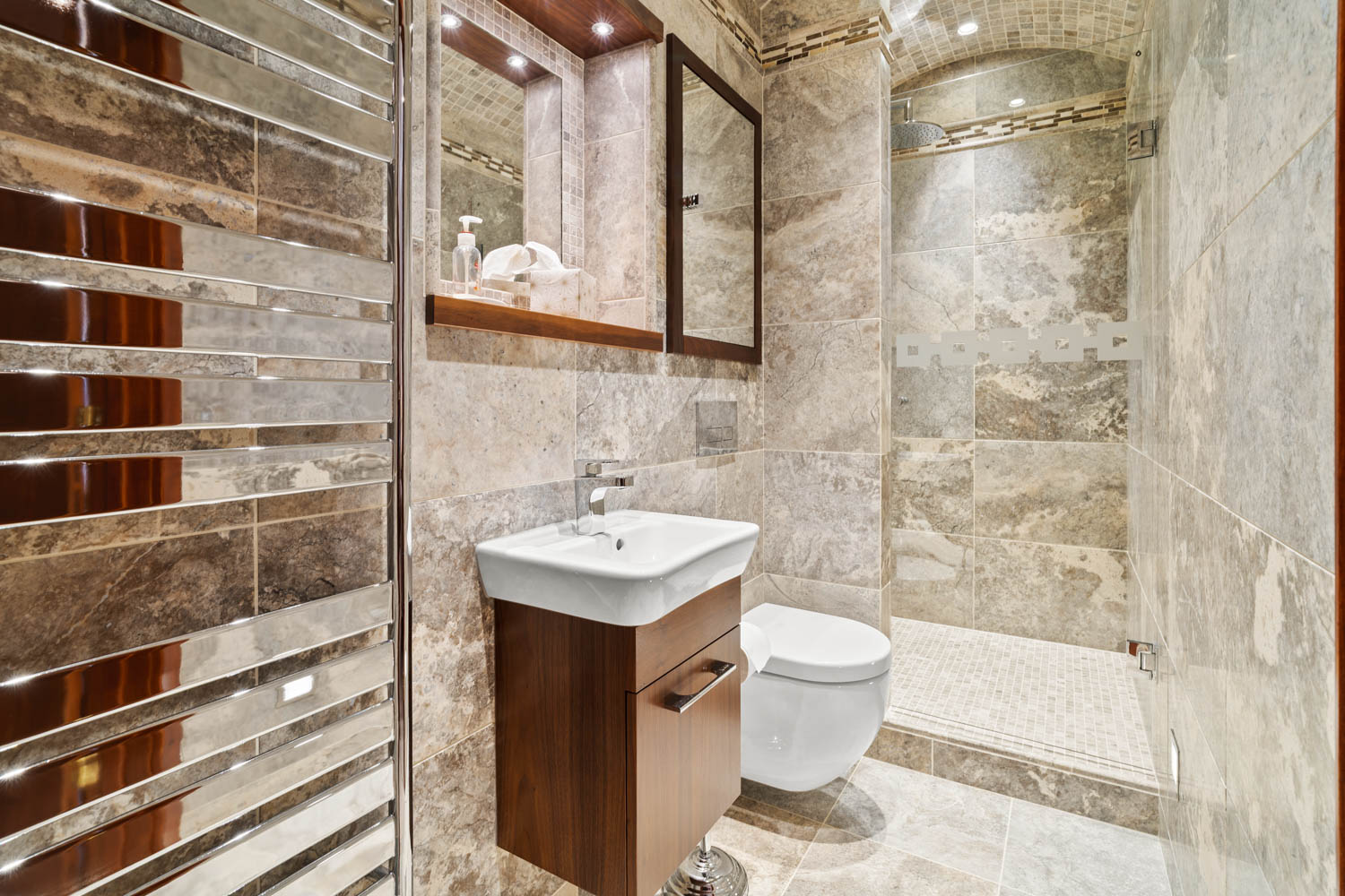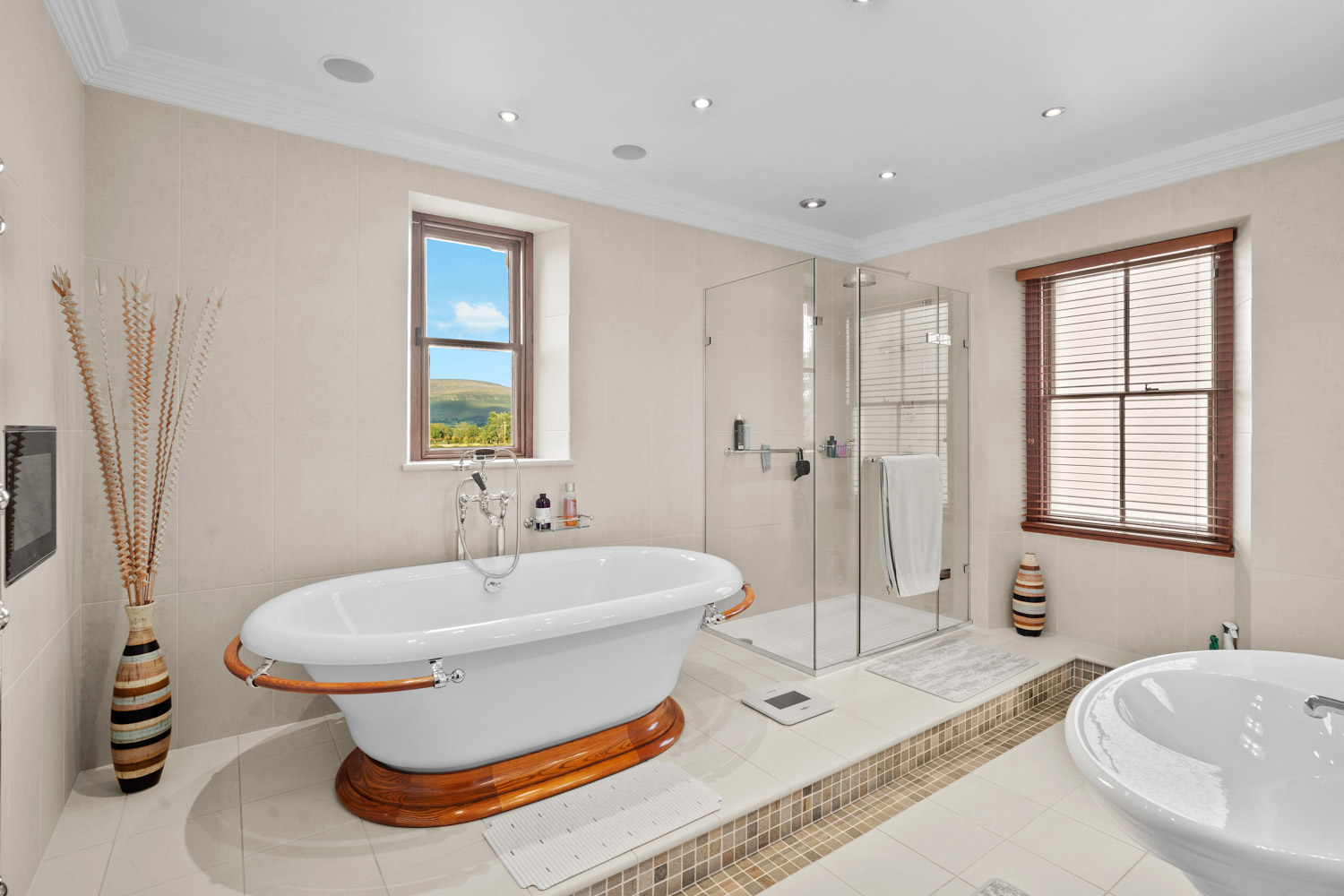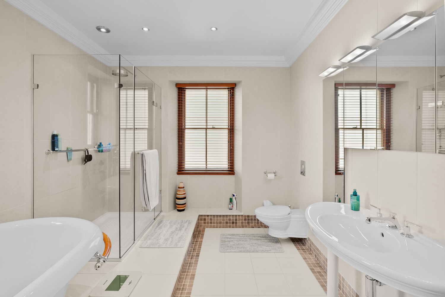 A free-standing roll-top bath makes a striking centrepiece, perfect for unwinding at the end of the day, while a spacious walk-in shower provides everyday convenience. Natural light from the windows completes the spaces, giving it a clean, bright and welcoming feel.