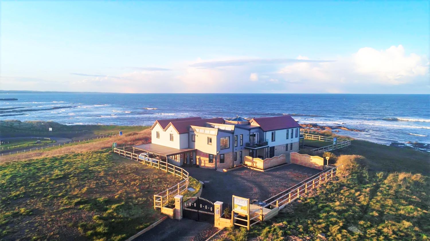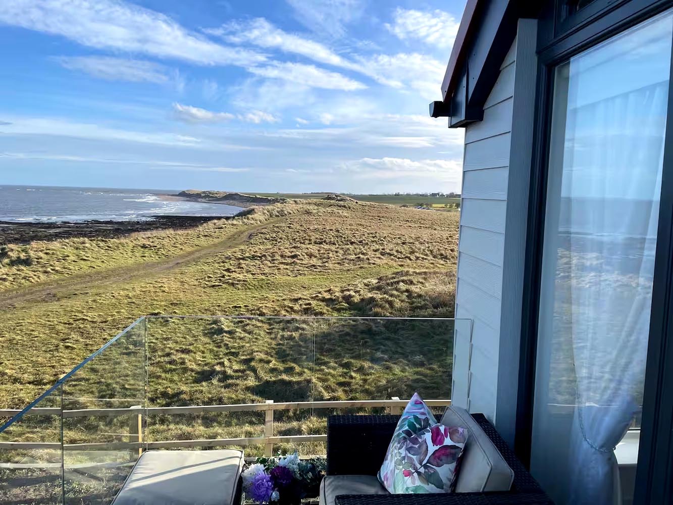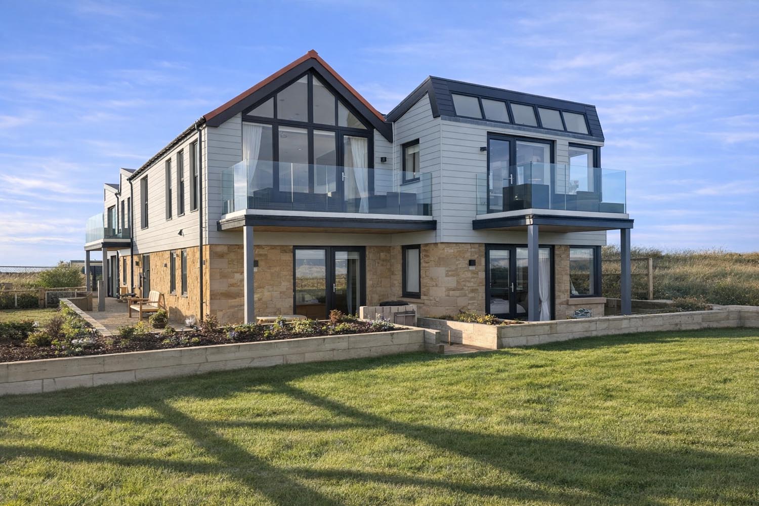 "A contemporary coastal house with elevated sea views, expansive glazing and balconies overlooking the Northumberland coastline "