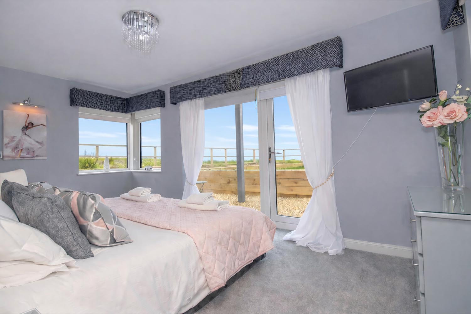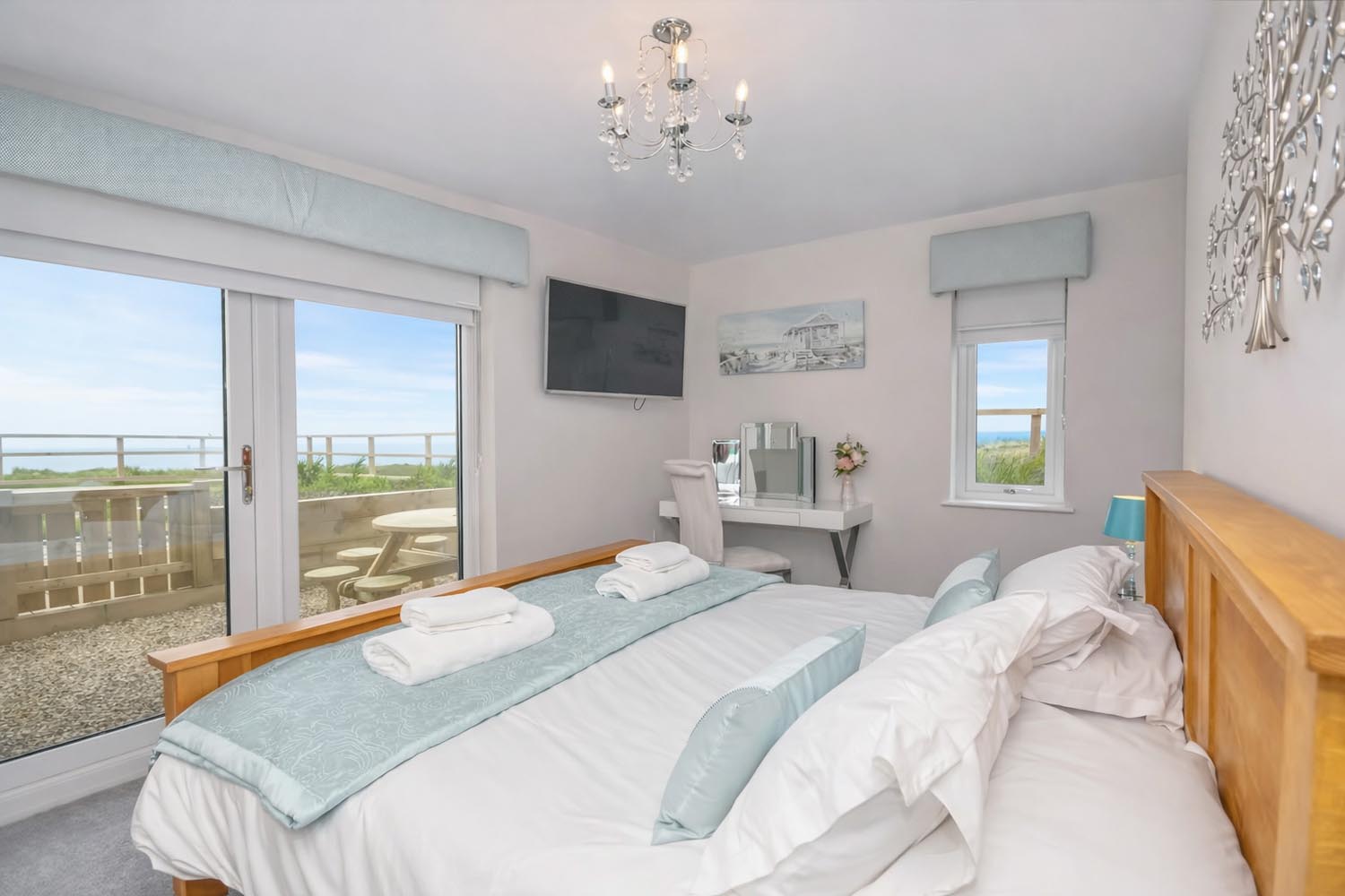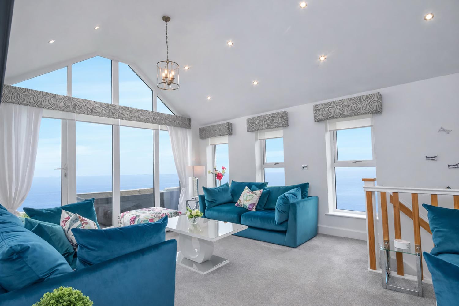The sitting area naturally gathers around the glazing while doors open onto a generous balcony, allowing the living space to extend outdoors and providing an exceptional place to take in the coastal setting.