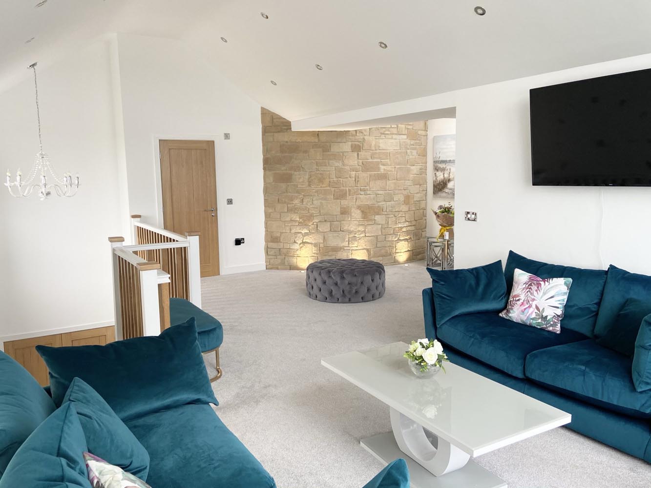 The house adopts a thoughtfully considered upside down layout, placing the principal living spaces on the first floor where the views are most impressive. Entry is through a striking double height entrance hall where a sandstone feature wall rises through both floors, introducing a distinctive architectural element while enhancing the sense of scale and light.