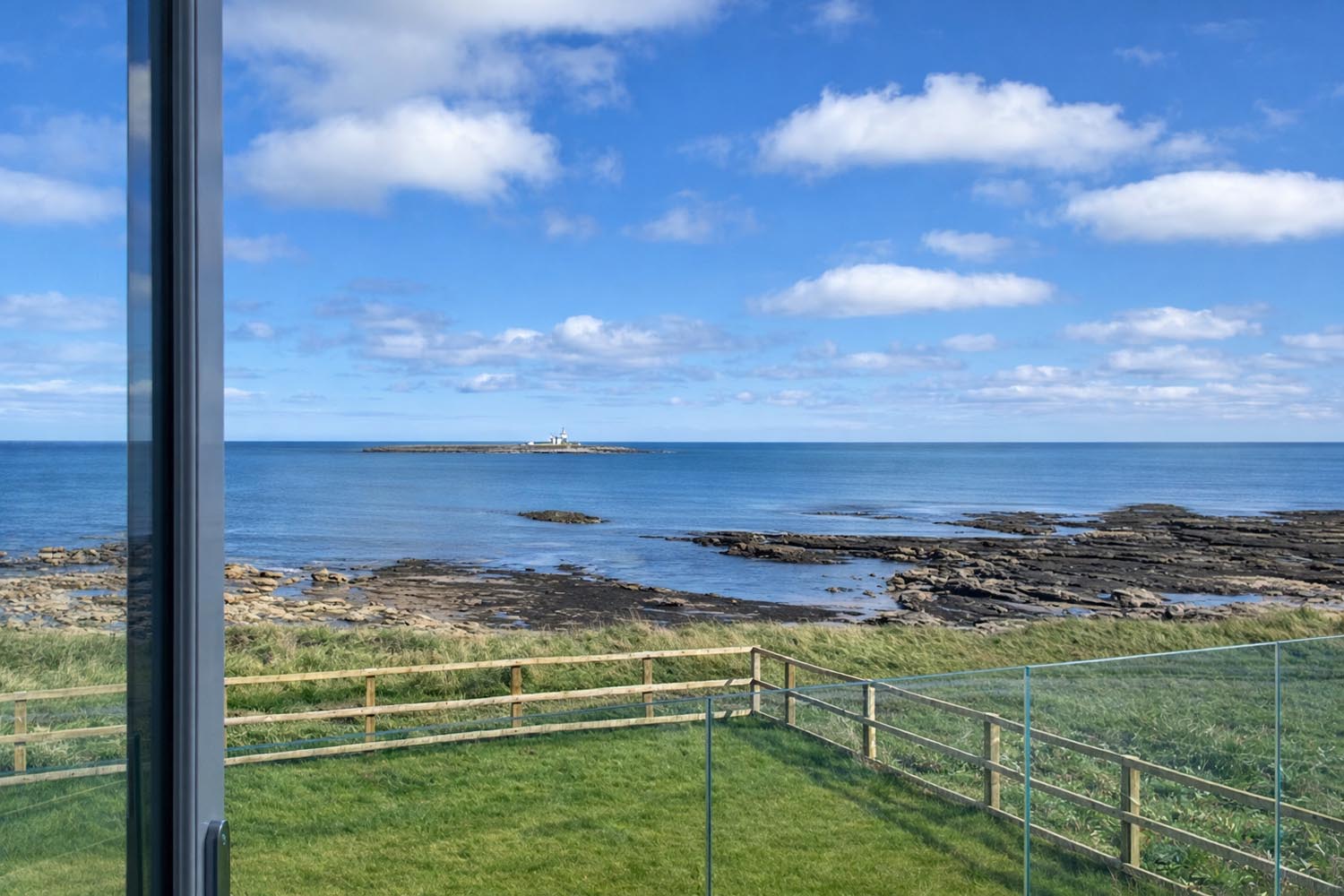 Stairs rise to the first floor where the house opens into an impressive open plan living space beneath a vaulted ceiling. Here, the architecture shifts to frame the surrounding landscape, with full height glazing across the gable end drawing the sea and coastline directly into view. From this elevated vantage point the outlook takes in the Northumberland coastline, Coquet Island and the harbour beyond.