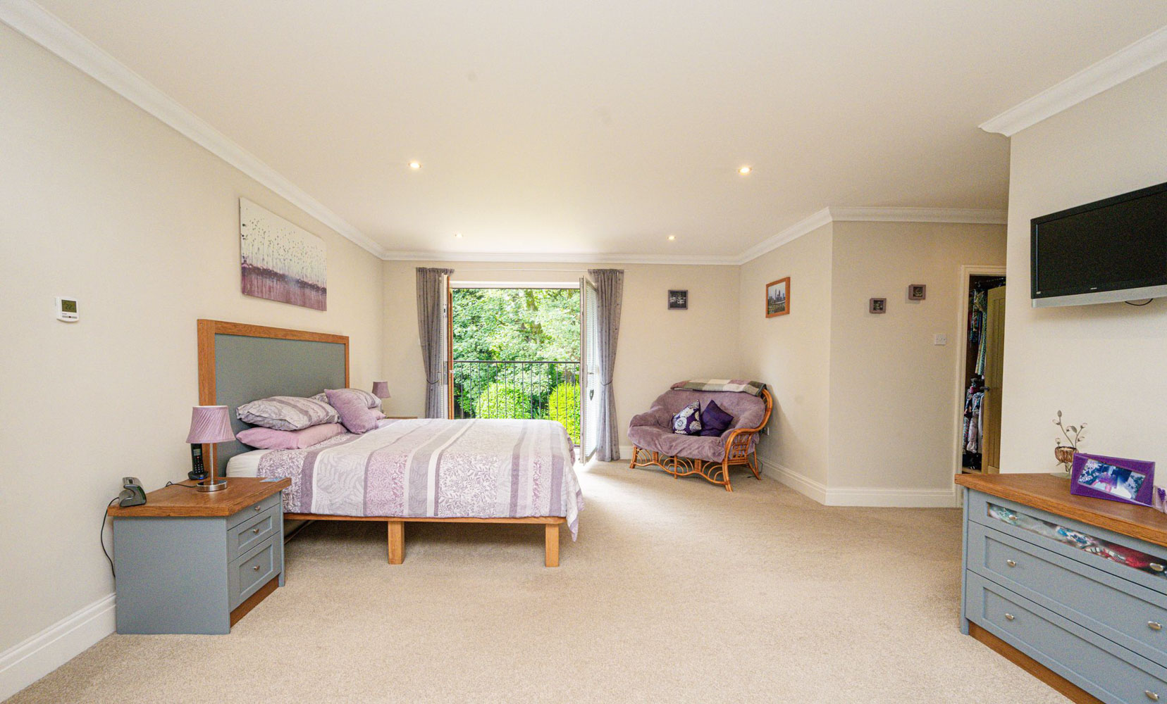 The master bedroom truly epitomizes luxury living. Exceptionally large and elegantly proportioned, this stunning suite commands the entire breadth of the house, bathed in natural light thanks to full-width windows and a set of French doors opening to a Juliet balcony, offering lush views of mature gardens and woodland beyond. More than just a bedroom, this space provides a complete private sanctuary. Within the suite, a dedicated sitting area creates the perfect spot to unwind with morning coffee, enjoy a quiet read, or simply take in the calming outlook. The room’s sense of scale ensures both sleeping and living areas feel generous yet intimate.