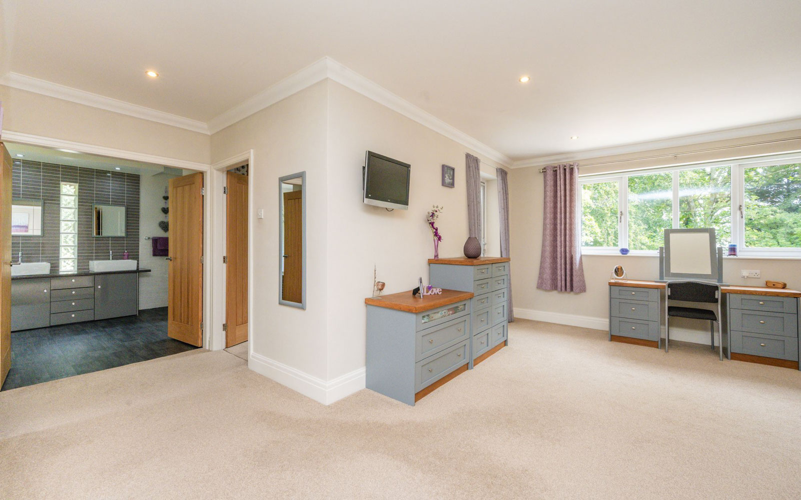 Soft neutral décor, plush carpeting, and subtle recessed lighting enhance the calm, comfortable atmosphere, while two exceptionally spacious walk-in wardrobes, discreetly accessed from the main room, provide not only plentiful storage but a true boutique dressing experience.