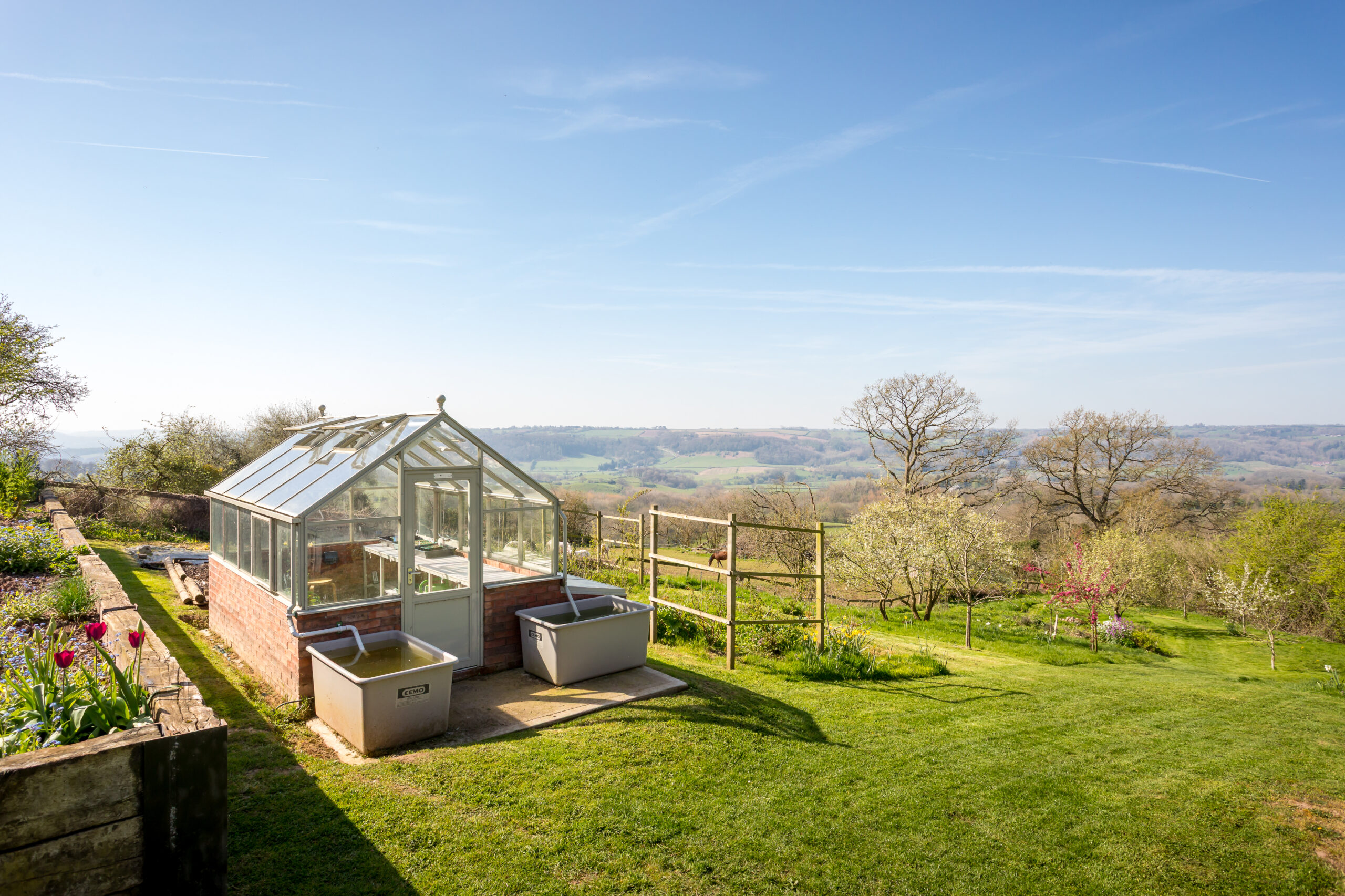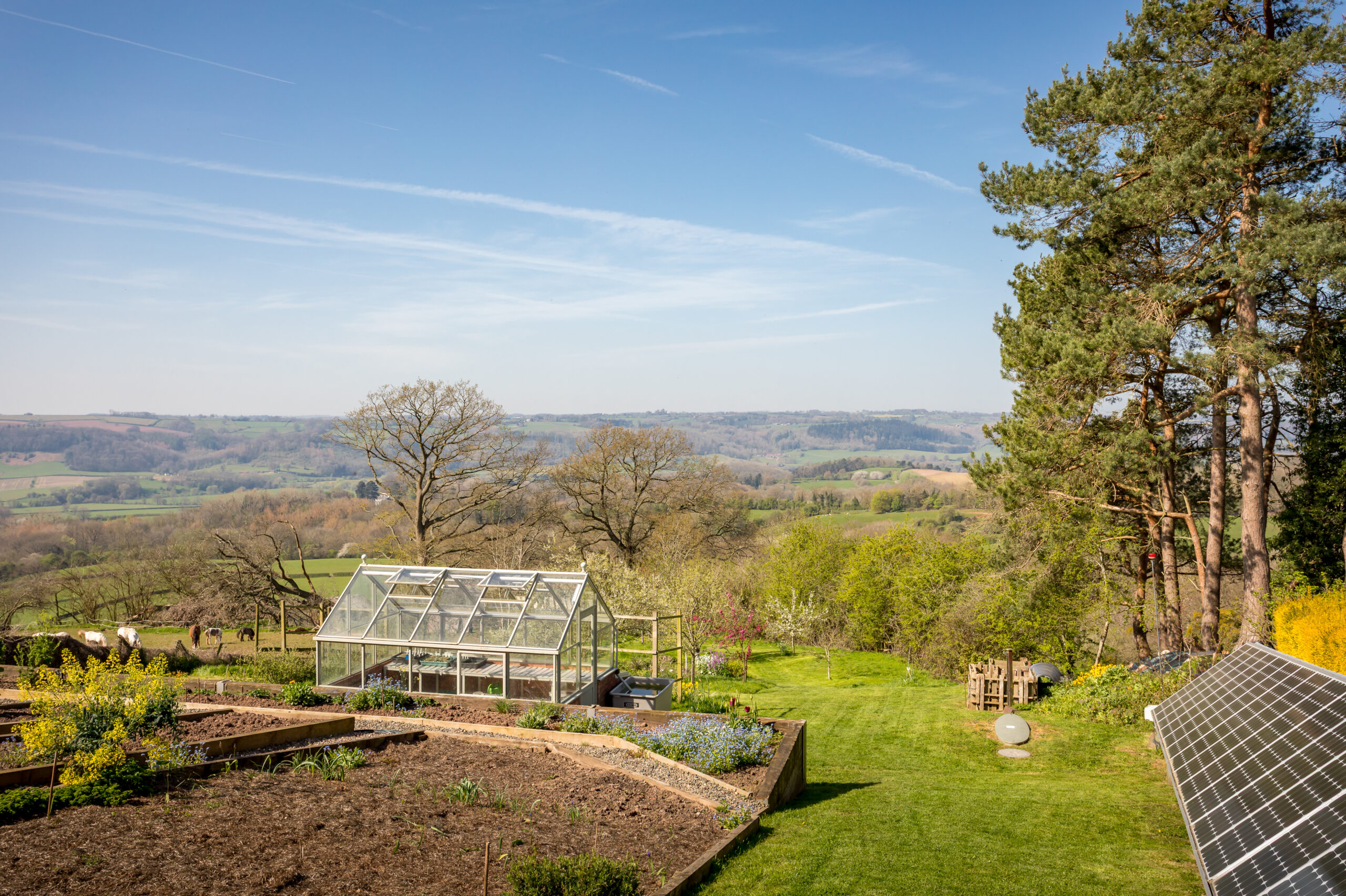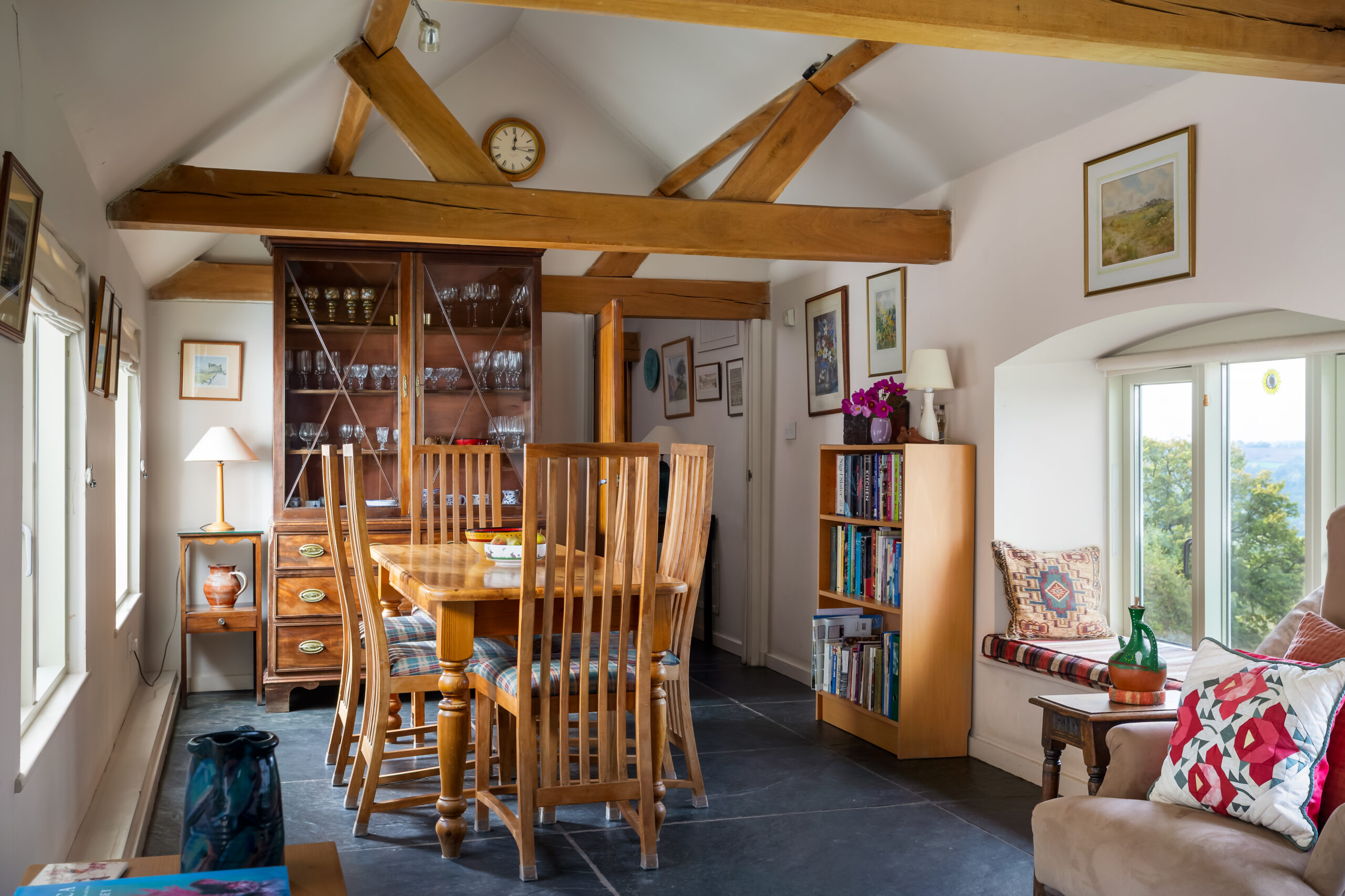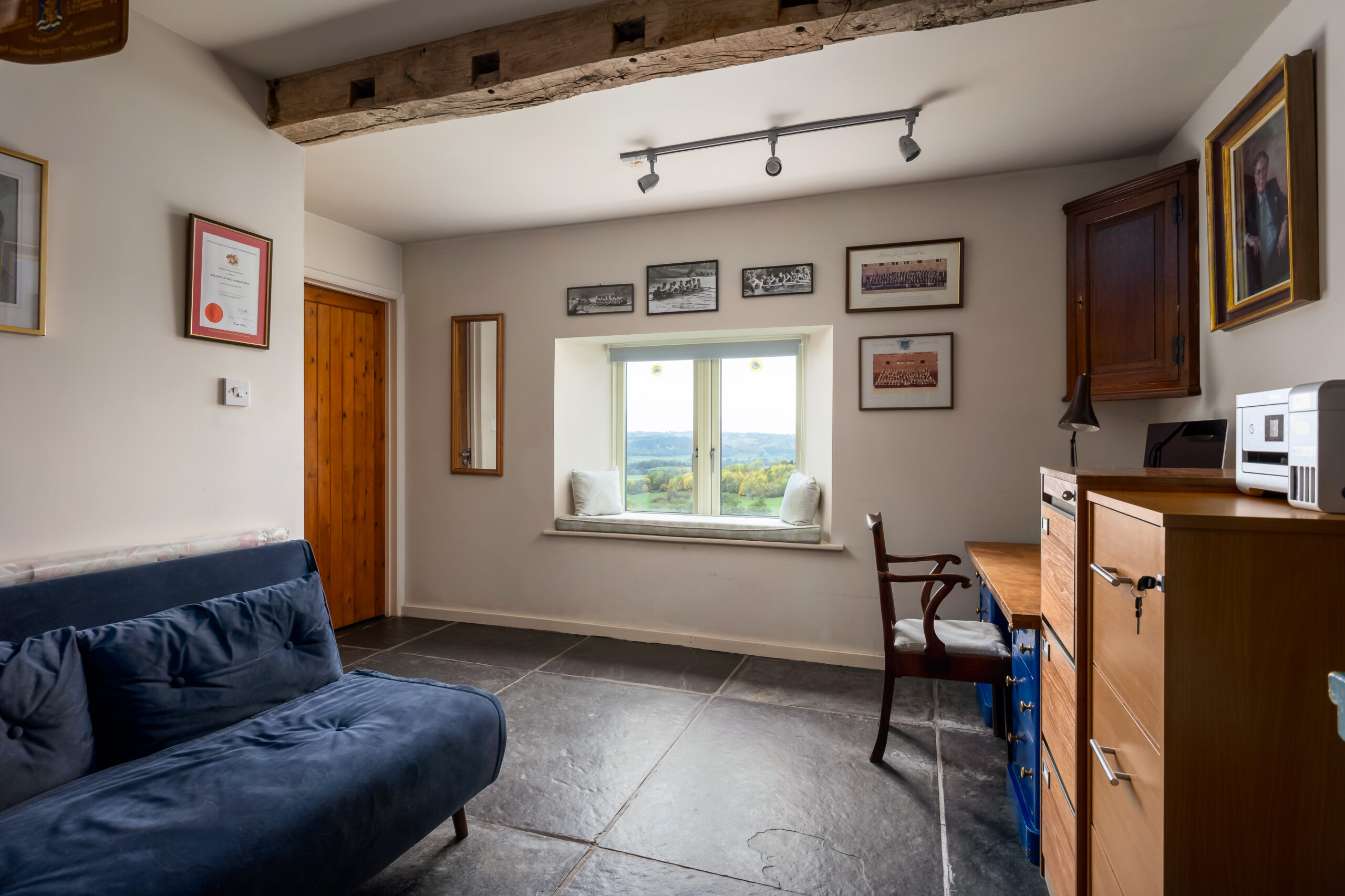 Every room enjoys uninterrupted valley views and ever-changing sunsets. The heart of the home is a spacious live-in kitchen/breakfast room. Living spaces include a vaulted main sitting room with glazed arches, a Jotul wood-burning stove, and direct garden access, plus a second cosy reception room also opening to the garden.