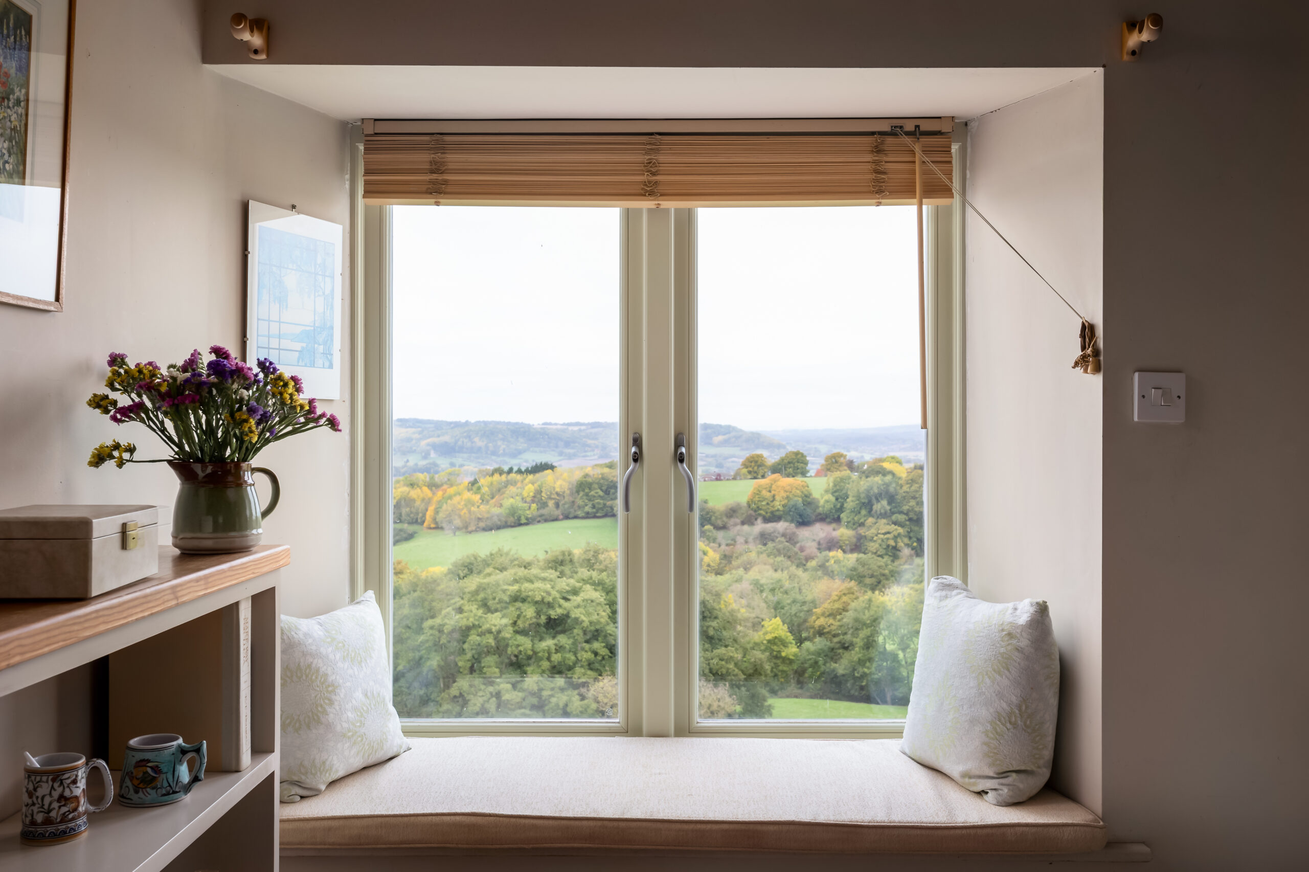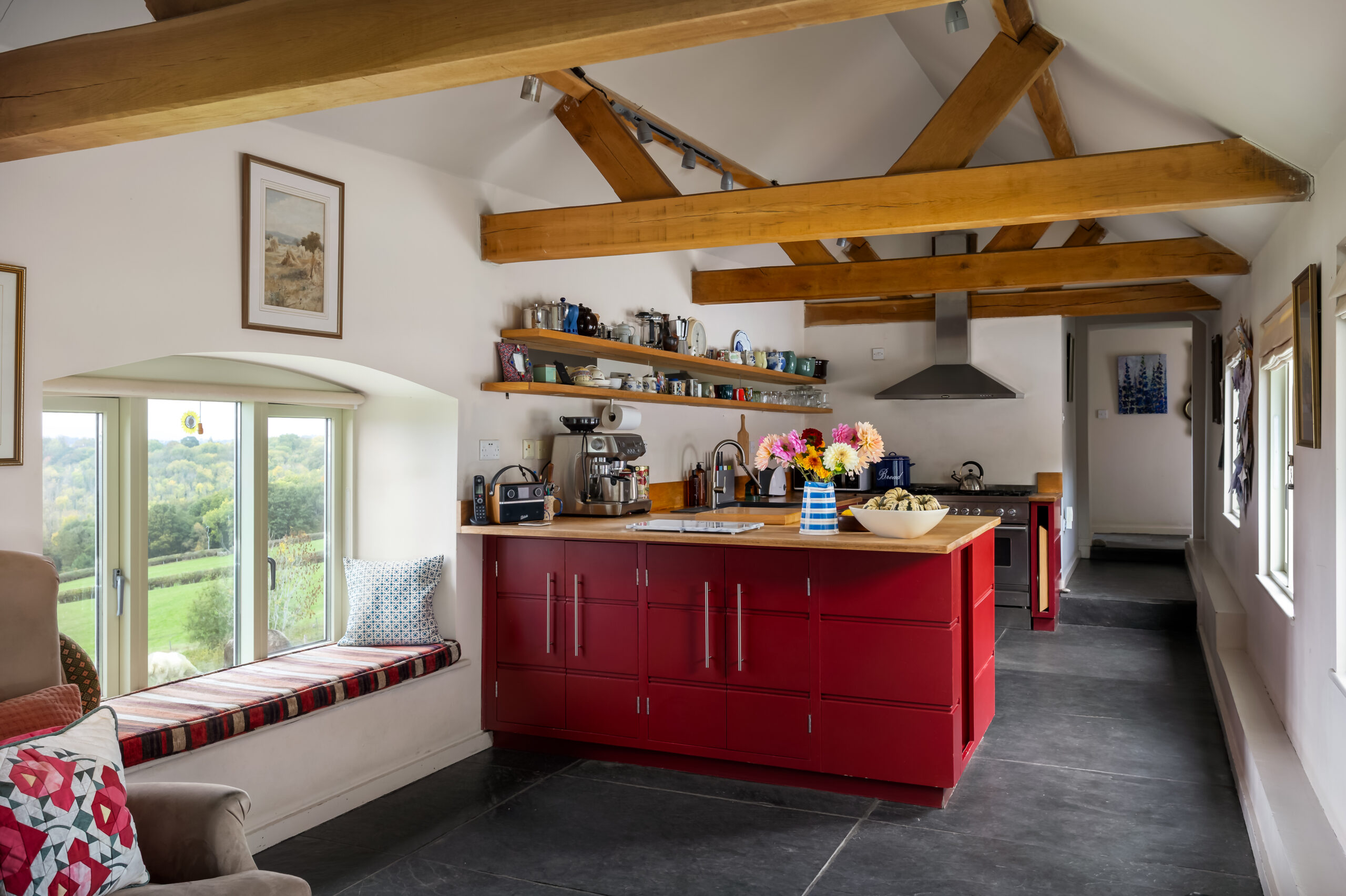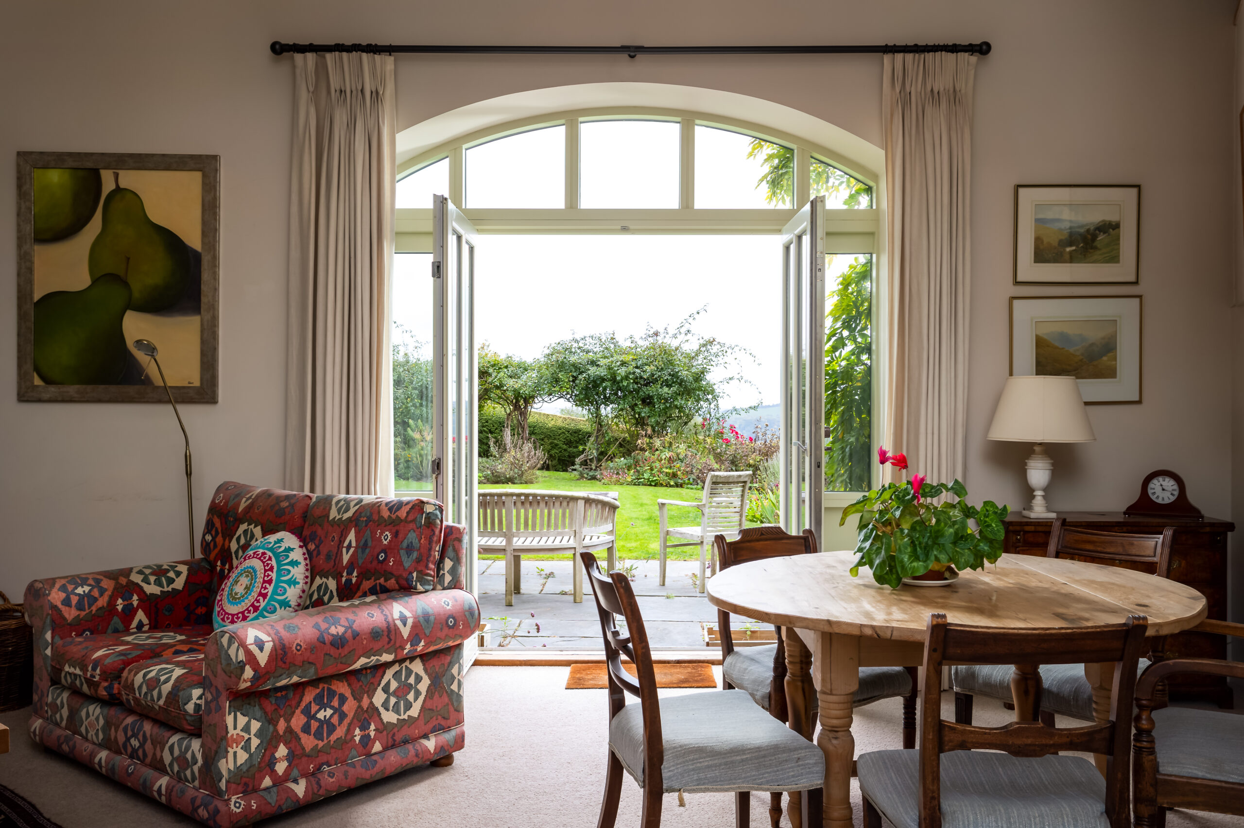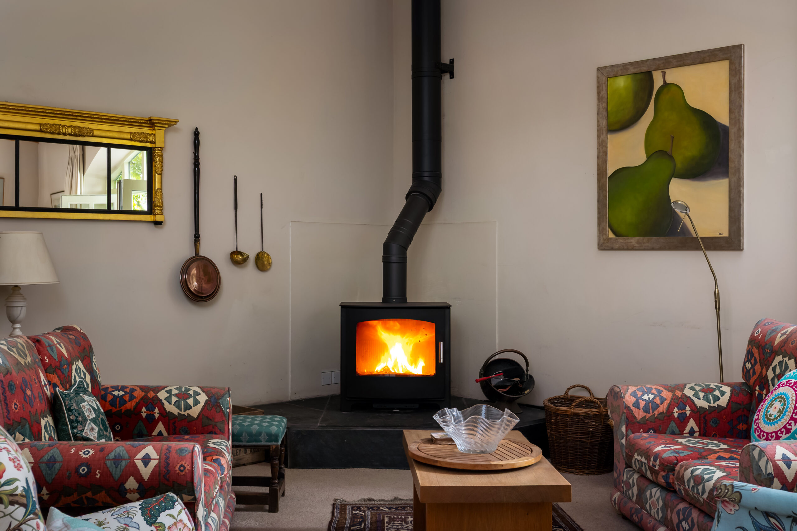 Every room enjoys uninterrupted valley views and ever-changing sunsets. The heart of the home is a spacious live-in kitchen/breakfast room. Living spaces include a vaulted main sitting room with glazed arches, a Jotul wood-burning stove, and direct garden access, plus a second cosy reception room also opening to the garden.