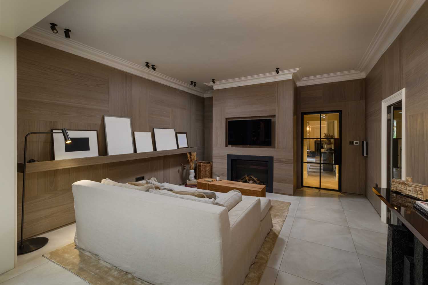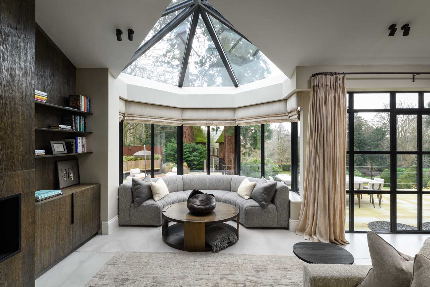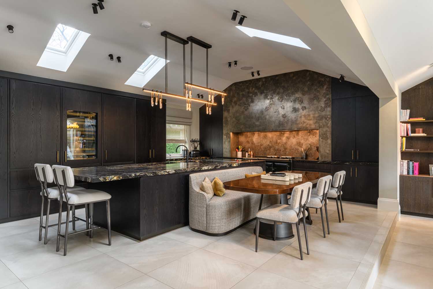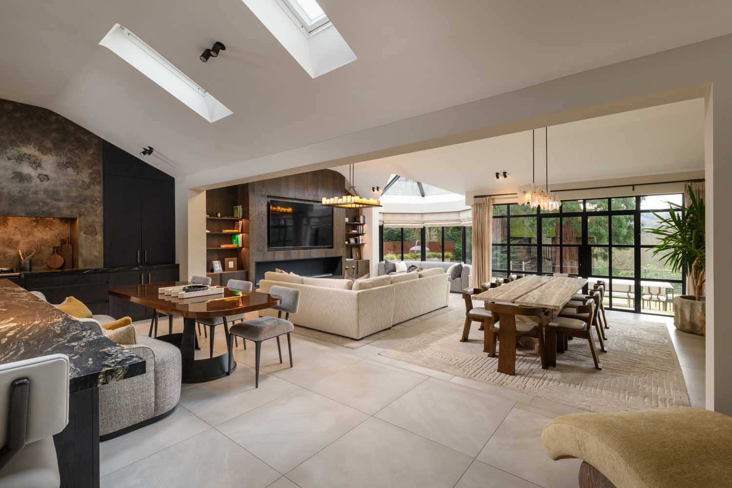 The kitchen forms a striking focal point, with sleek bespoke cabinetry and a substantial island topped in richly veined quartz. Decorated in dark tones, a hand-crafted bronze feature wall brings depth and texture to the space, while an electric AGA and twin Gaggenau ovens offer both everyday practicality and versatility for entertaining. Overhead, a natural quartz crystal pendant chandelier adds a sculptural finishing touch. The open-plan layout extends into a light-filled living area, with an orangery extension crowned with a skylight drawing in garden views. Textured timber panelling frames the media wall.