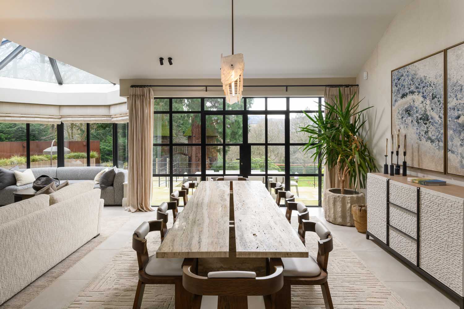The dining area is finished in soft, coastal tones, creating a relaxed setting for family life and entertaining and opens out onto the terrace. A travertine dining table is lit spectacularly by an inspired polished quartz chandelier, while a specialist plaster feature wall zones this extraordinary space.