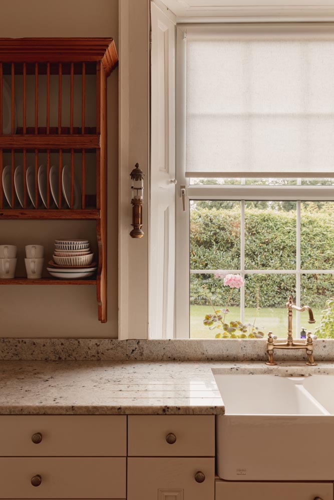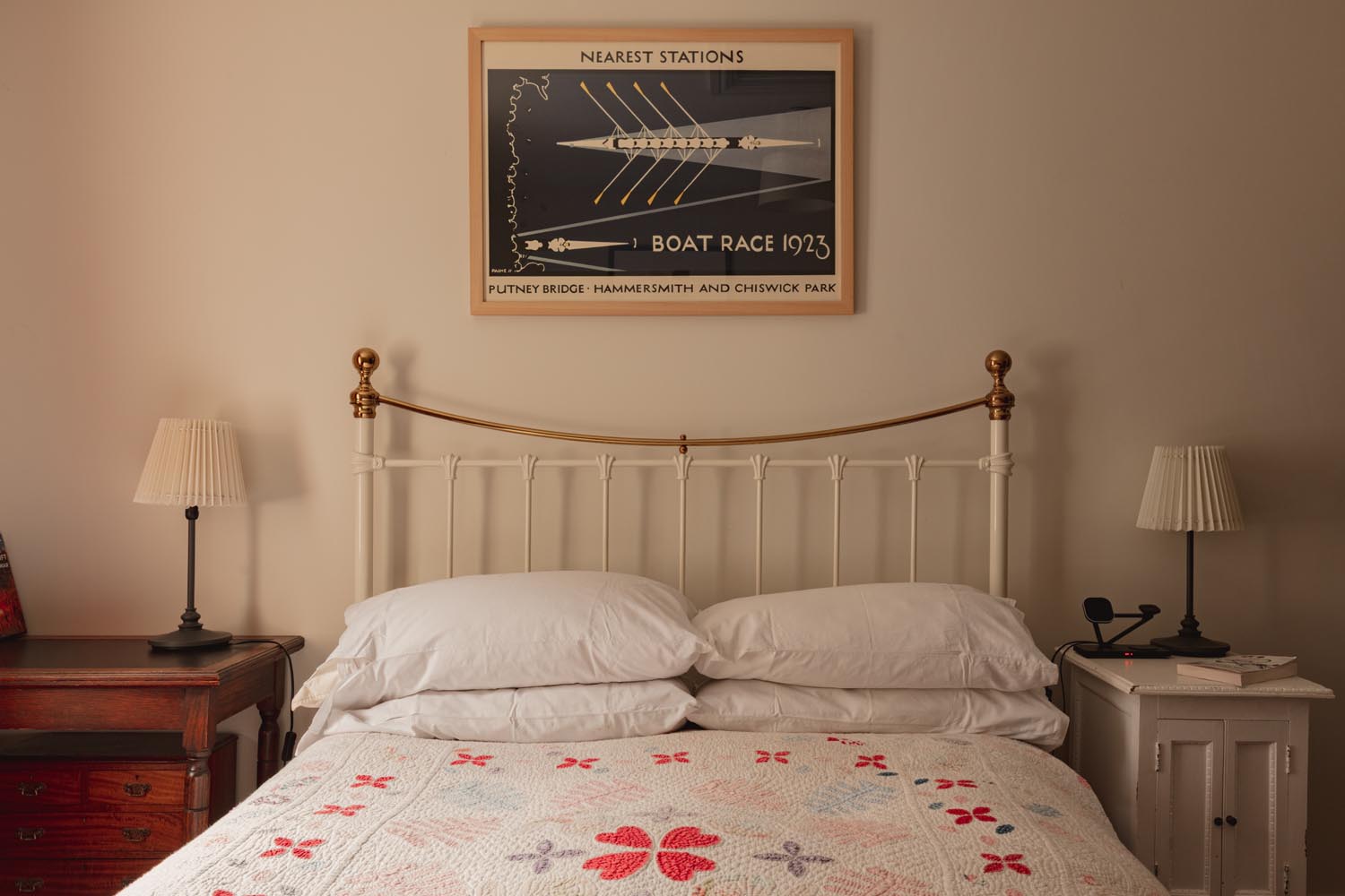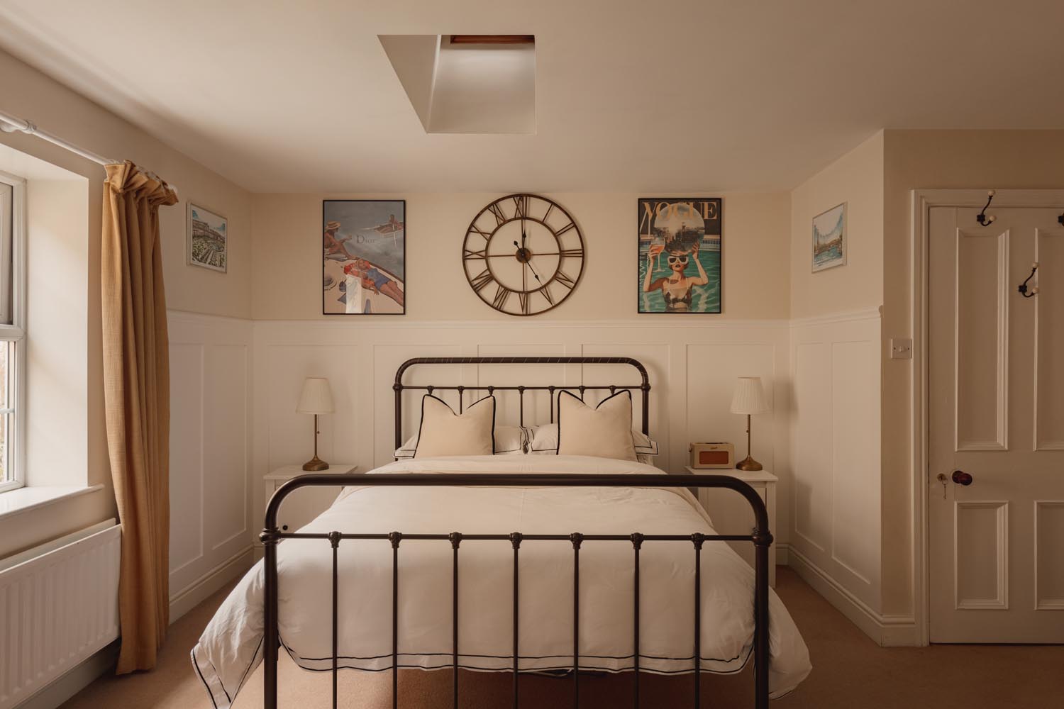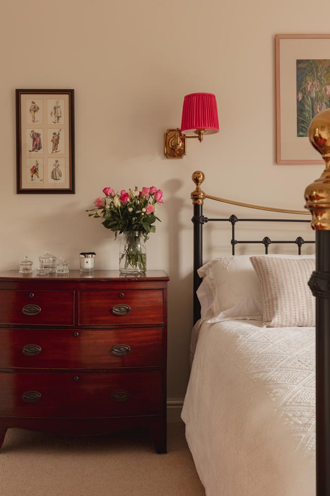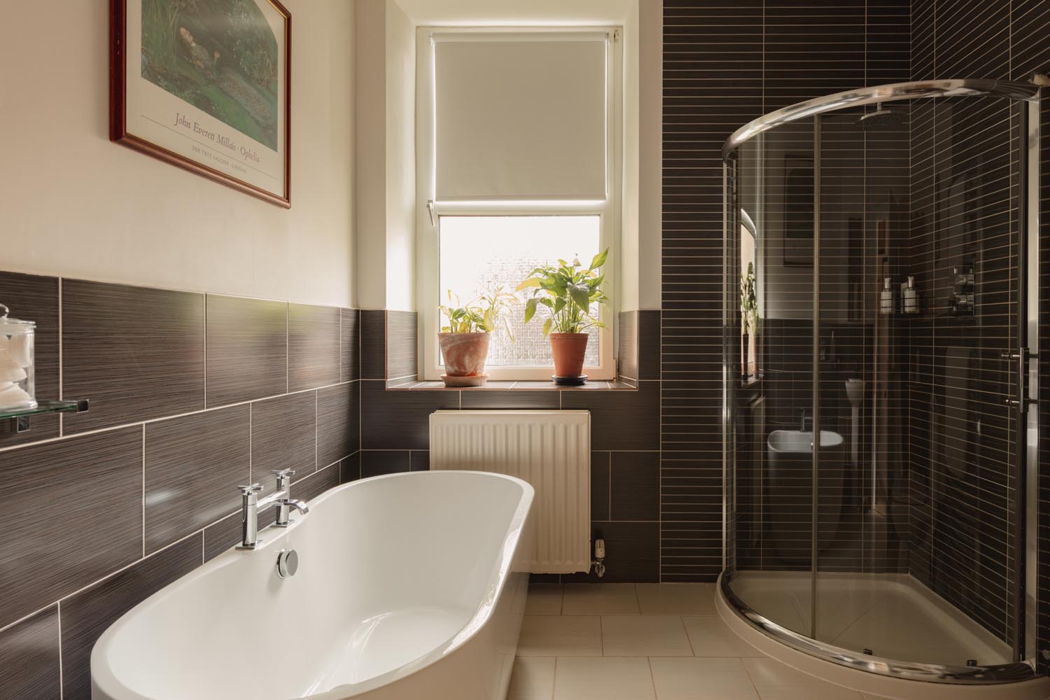 The principal bedroom, set within the oldest part of the house, is calm and carefully proportioned. Natural light pours through a tall sash window with wooden shutters, while an elegant ceiling rose and a traditional cast iron radiator underline the period feel. There is comfortable space for a king-sized bed and occasional seating. Three further bedrooms complete the arrangement, each a good size with pleasant aspects over the gardens and suited to quiet guest or family use. The largest of the three has a smart, practical en suite with neutral tiling, a glazed corner shower and a twin basin vanity offering generous storage and surface space. The main bathroom is fitted with quality fittings, including a freestanding bath and a separate glazed shower.