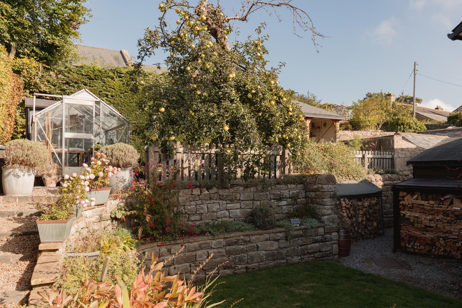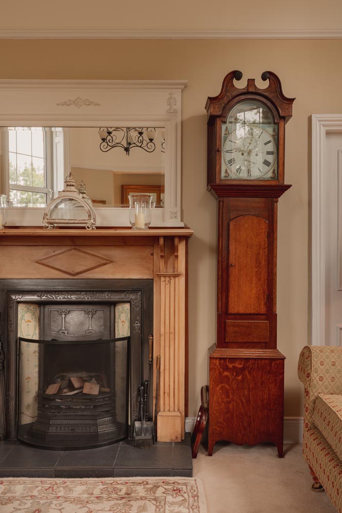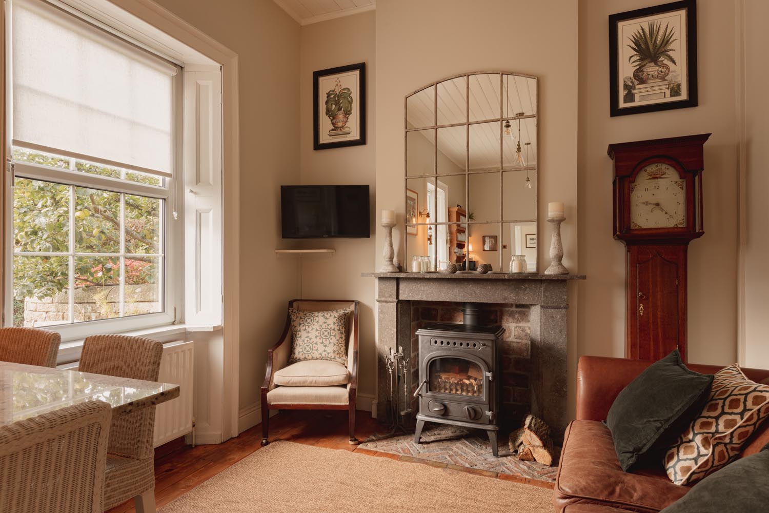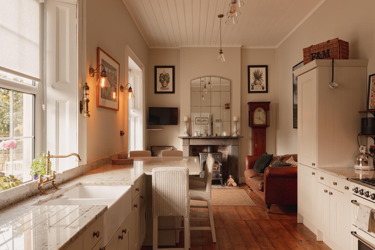 The kitchen is arranged to cook, gather and linger. Tall ceilings frame painted solid wood cabinetry with quality granite work surfaces, a double ceramic sink with high quality brass mixer tap in the French style, and a high specification six burner SMEG range cooker. A solid wood planked floor runs the length of the room, providing warmth and reinforcing the character. A long counter and breakfast seating look to the sitting area beyond, and a wood burning stove anchors this end of the space, making it a natural place to start and end the day. Outlooks from the house take in the gardens, with a south facing aspect giving excellent light through the day.