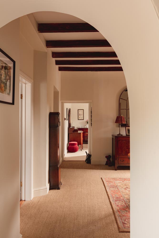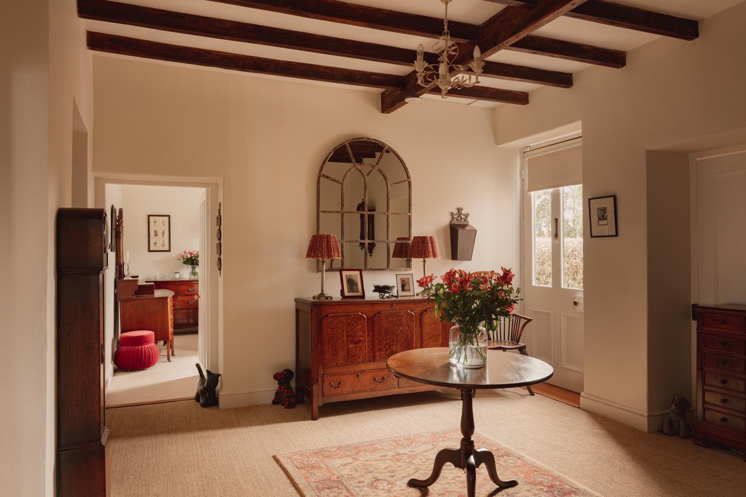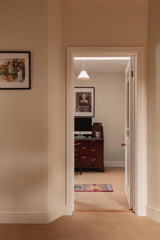 The reception sequence opens in a broad hall with exposed beams that sets a quietly grand tone for the house. To one side, the sitting room is an inviting, well balanced space, the shallow curved bay and deep sash windows bringing soft light across decorative cornice work and an original fireplace. A second reception room, used informally for family living and dining, sits alongside the kitchen and gives further flexibility for entertaining or quiet reading. There is also a dedicated home office located off the hall. Tasteful décor is maintained throughout, with walls painted in Farrow and Ball neutral shades for a refined, timeless backdrop, complemented by elegant wall lights and chandelier style fittings that are in keeping with the period character.