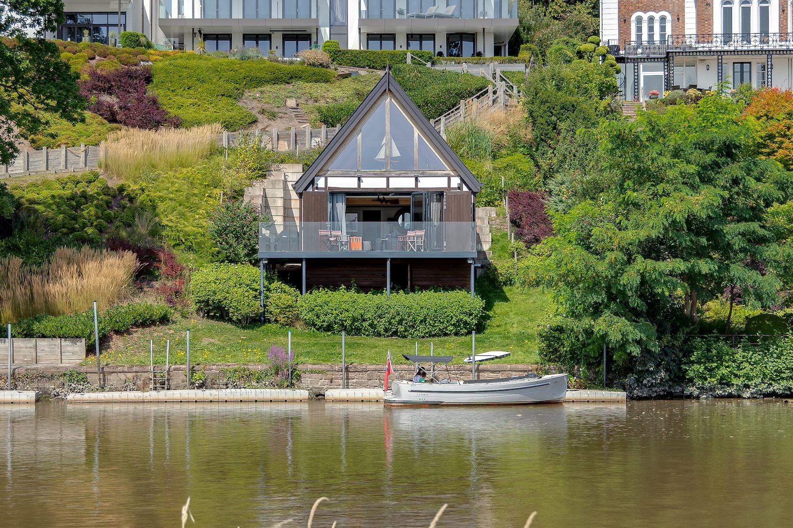 The approach to The Boathouse is both discreet and enchanting. Steps lead you through landscaped grounds towards the waters edge: a fitting entrance to a property where natural beauty and thoughtful design intertwine.