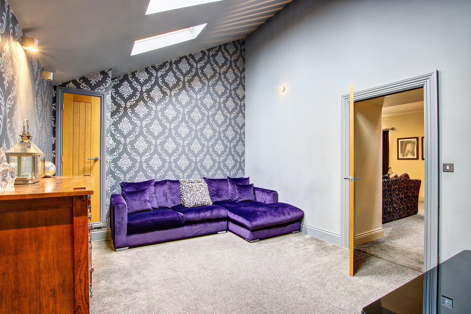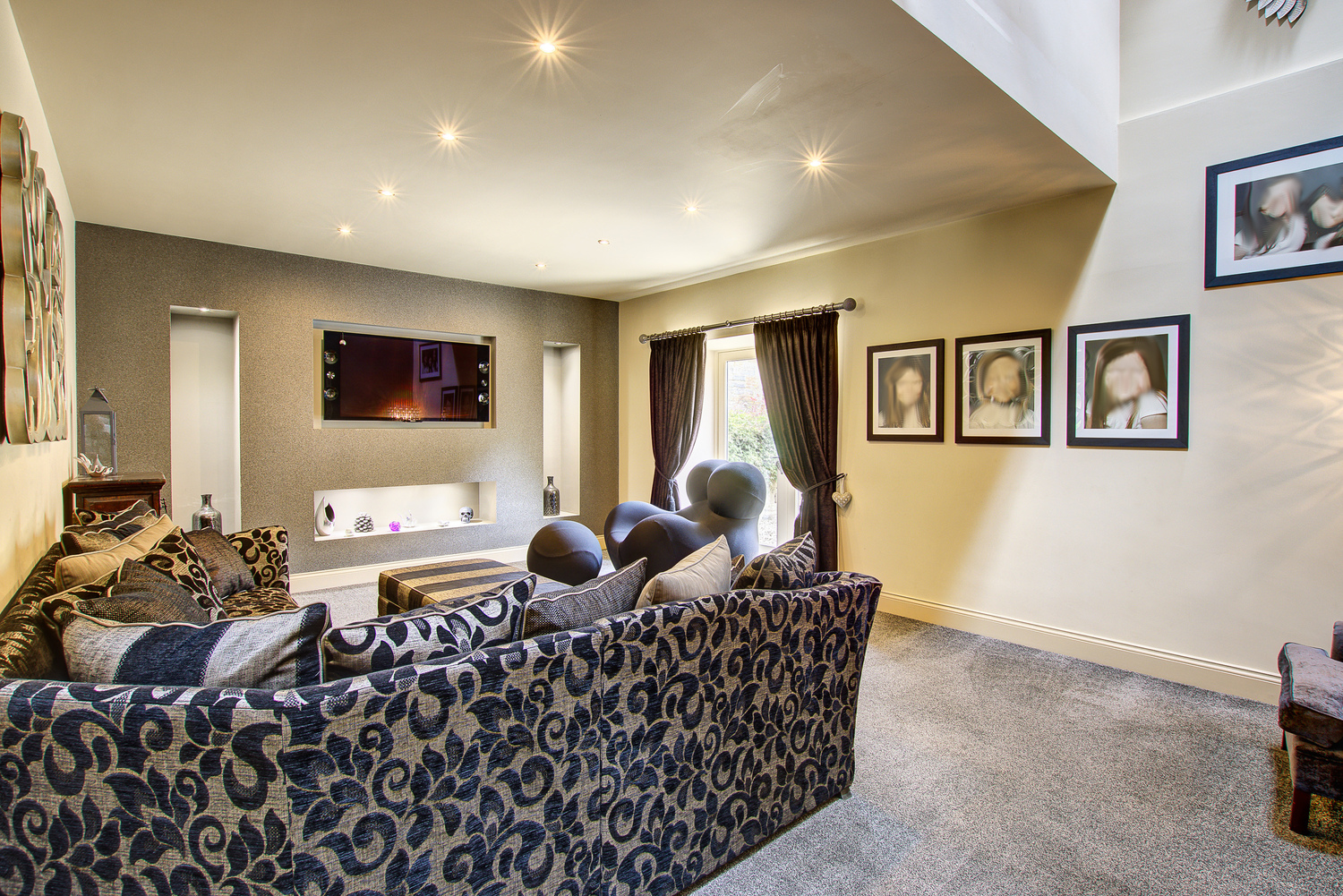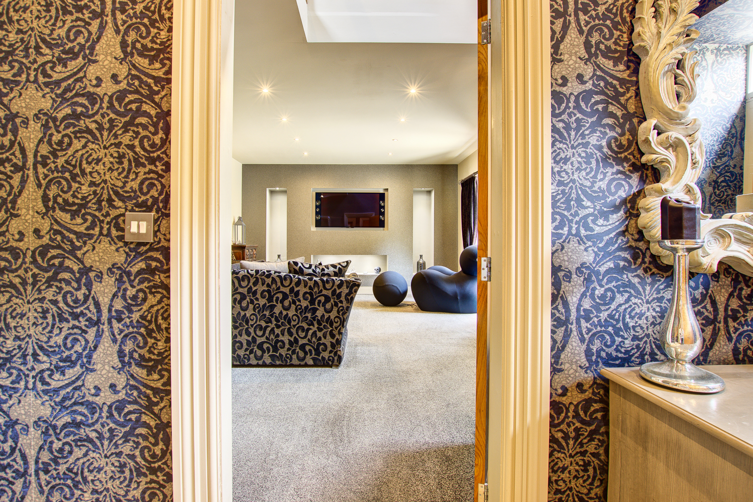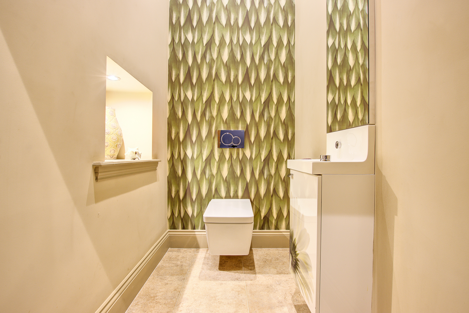 The front door opens from the courtyard to the entrance hall. To the right is the vast sitting room with French doors to the courtyard and eye-catching modern styling. The ceiling at one end of the room rises to the full height of the house where it is galleried to the first floor landing and one bedroom. Adjoining the sitting room is the family room with further relaxing space. The open plan kitchen and dining room is the perfect place to spend time with family and friends. Sleek kitchen units house a range of discreet high quality appliances and the breakfast bar is ideal for casual dining. The hob on the breakfast bar is complemented by a striking ceiling extractor above. Subtle lighting adds to the warm atmosphere. The kitchen flows into an expansive dining area with lots of space for a large table and chairs. The utility room adds great practicality, and also links onwards to a rear hall connecting to a store room. Tucked between the kitchen and the family room is a useful ground floor WC.
