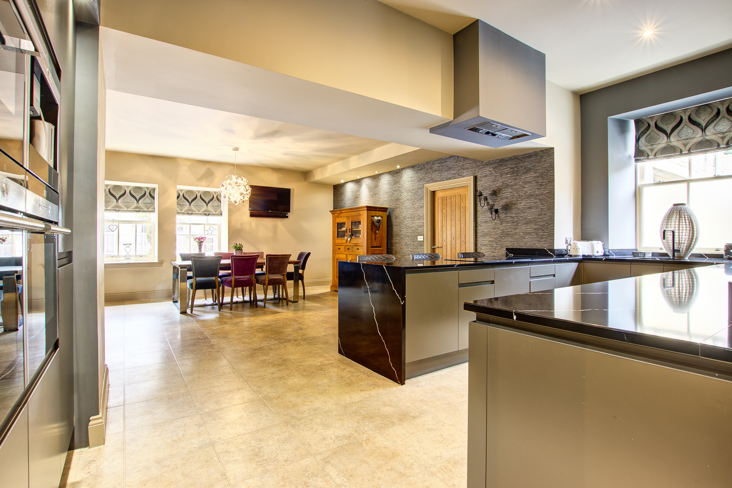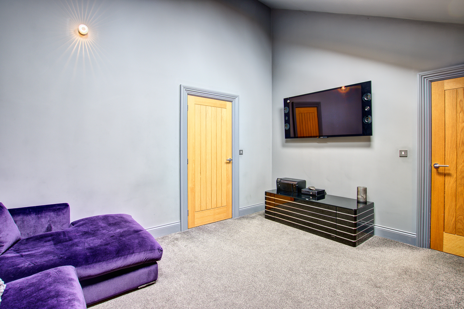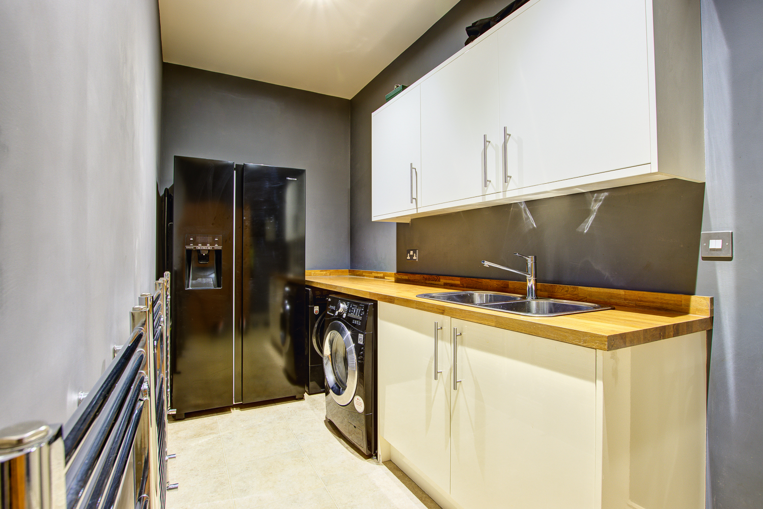The front door opens from the courtyard to the entrance hall. To the right is the vast sitting room with French doors to the courtyard and eye-catching modern styling. The ceiling at one end of the room rises to the full height of the house where it is galleried to the first floor landing and one bedroom. Adjoining the sitting room is the family room with further relaxing space. The open plan kitchen and dining room is the perfect place to spend time with family and friends. Sleek kitchen units house a range of discreet high quality appliances and the breakfast bar is ideal for casual dining. The hob on the breakfast bar is complemented by a striking ceiling extractor above. Subtle lighting adds to the warm atmosphere. The kitchen flows into an expansive dining area with lots of space for a large table and chairs. The utility room adds great practicality, and also links onwards to a rear hall connecting to a store room. Tucked between the kitchen and the family room is a useful ground floor WC.