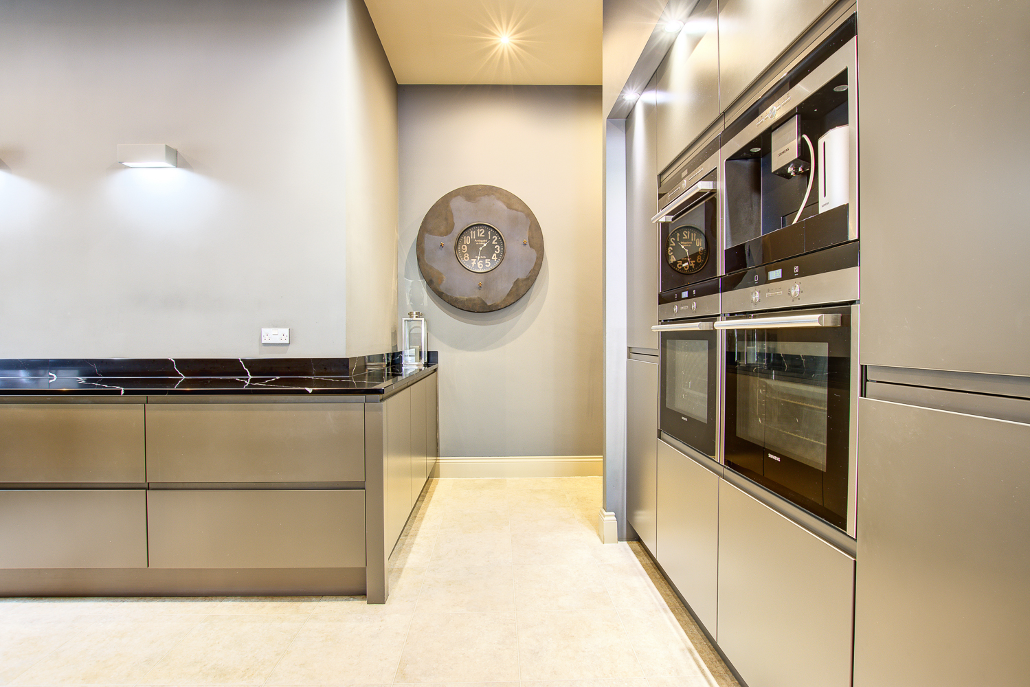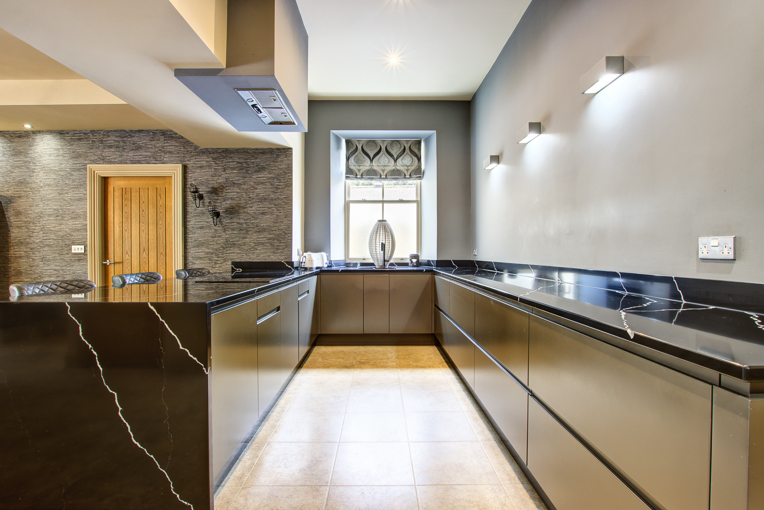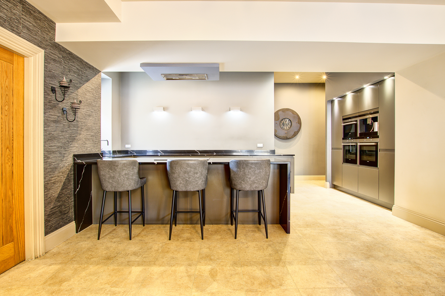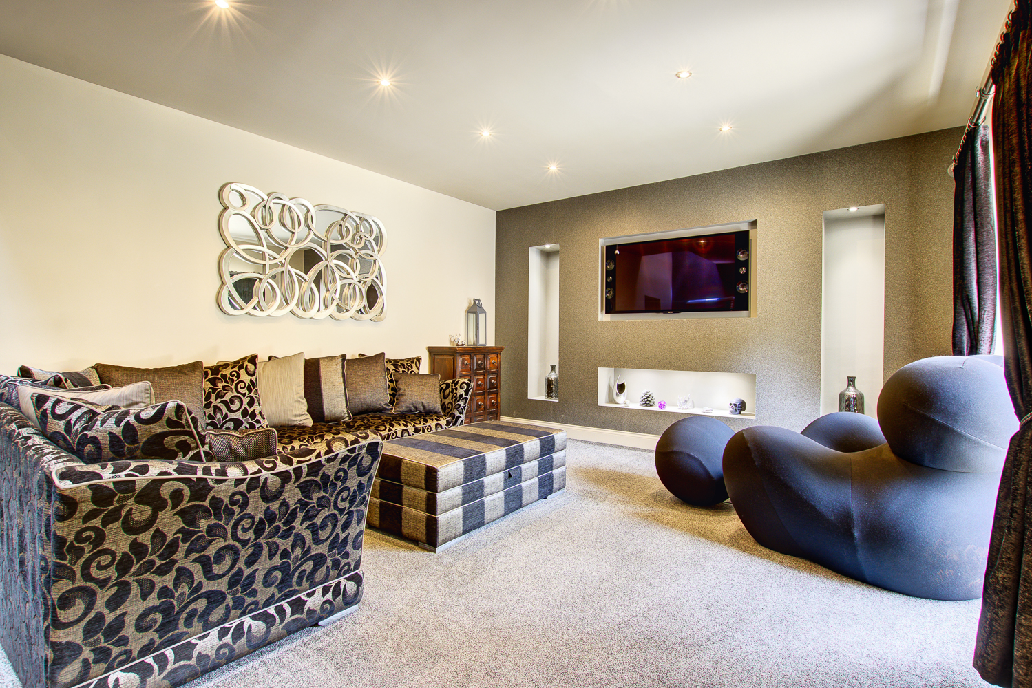 The front door opens from the courtyard to the entrance hall. To the right is the vast sitting room with French doors to the courtyard and eye-catching modern styling. The ceiling at one end of the room rises to the full height of the house where it is galleried to the first floor landing and one bedroom. Adjoining the sitting room is the family room with further relaxing space. The open plan kitchen and dining room is the perfect place to spend time with family and friends. Sleek kitchen units house a range of discreet high quality appliances and the breakfast bar is ideal for casual dining. The hob on the breakfast bar is complemented by a striking ceiling extractor above. Subtle lighting adds to the warm atmosphere. The kitchen flows into an expansive dining area with lots of space for a large table and chairs. The utility room adds great practicality, and also links onwards to a rear hall connecting to a store room. Tucked between the kitchen and the family room is a useful ground floor WC.