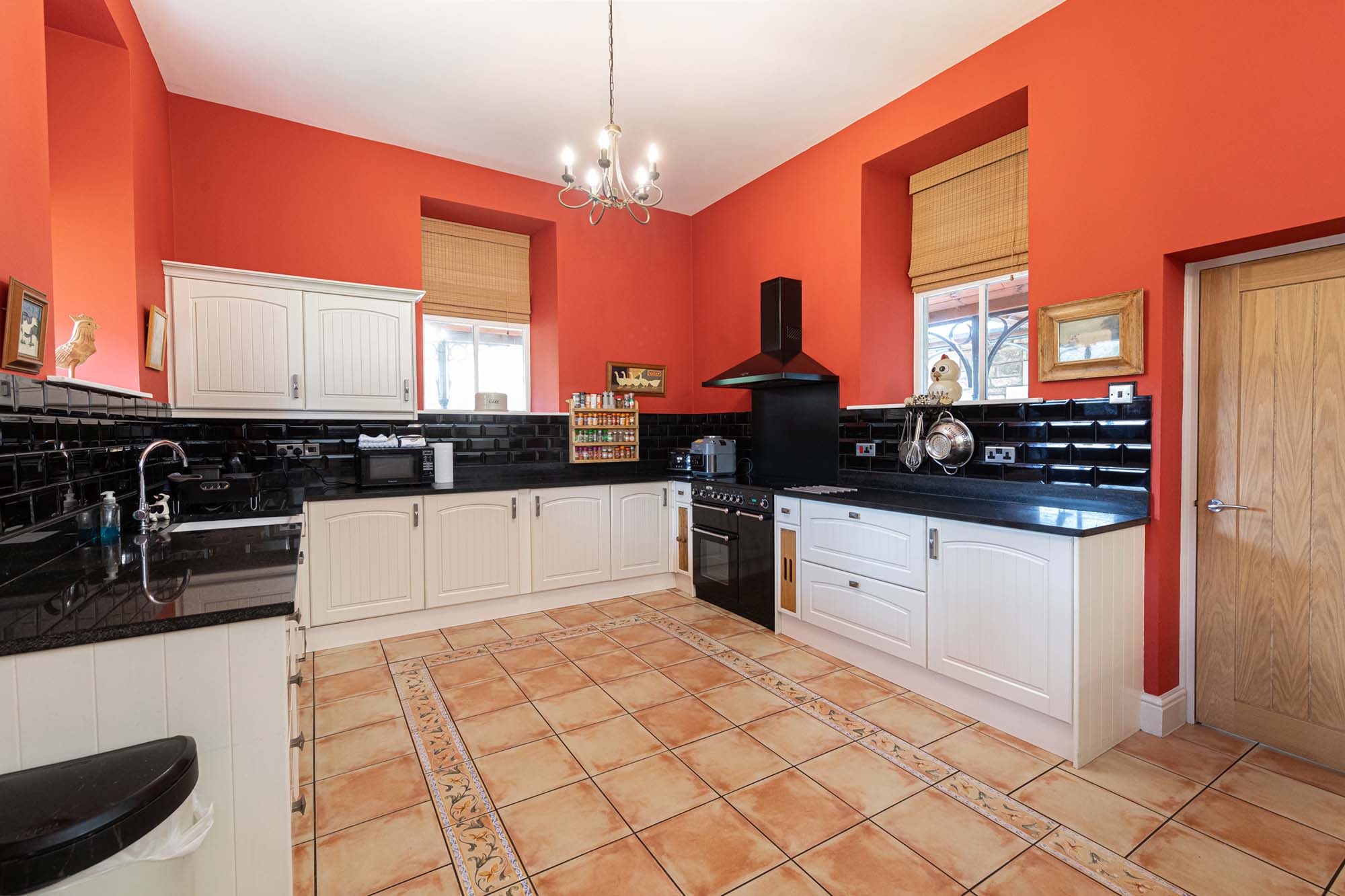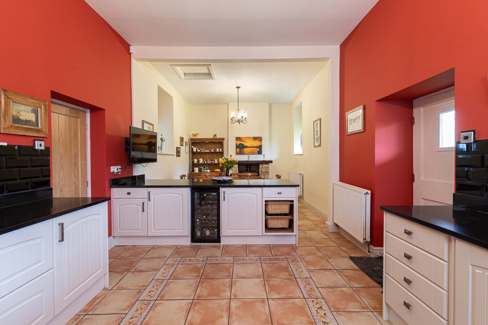 Inside, the property features a spacious open-plan kitchen and dining area, equipped with an electric range cooker, integrated dishwasher, fridge-freezer, and a range of cream units topped with granite work surfaces extending to a central island. The dining area includes an AGA multi-burning fire set within a charming stone fire surround, creating a warm and inviting atmosphere for family gatherings.