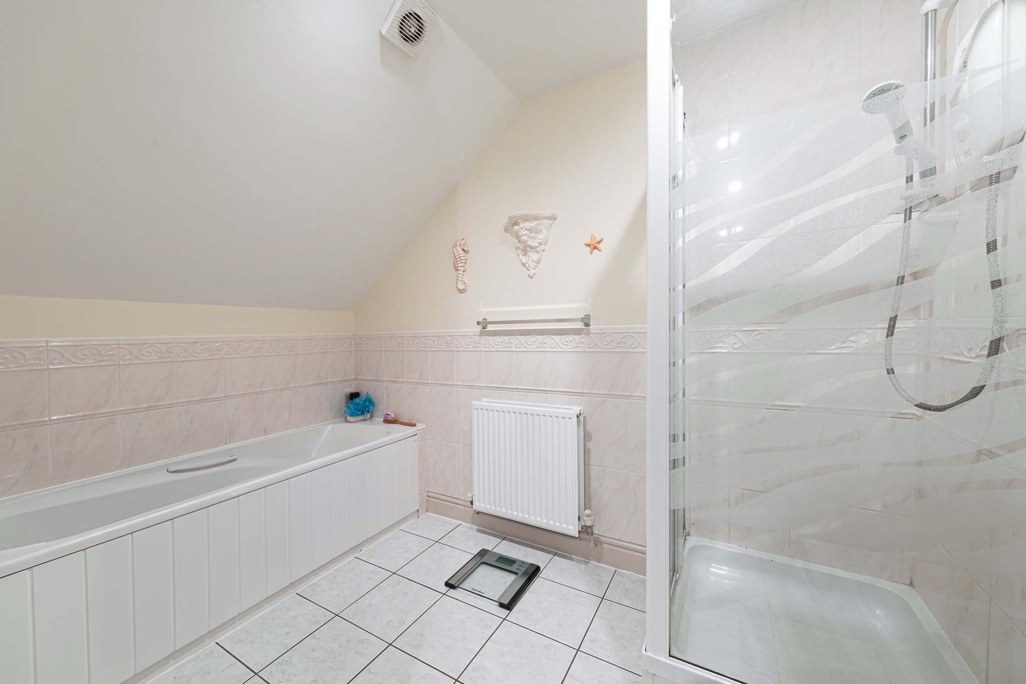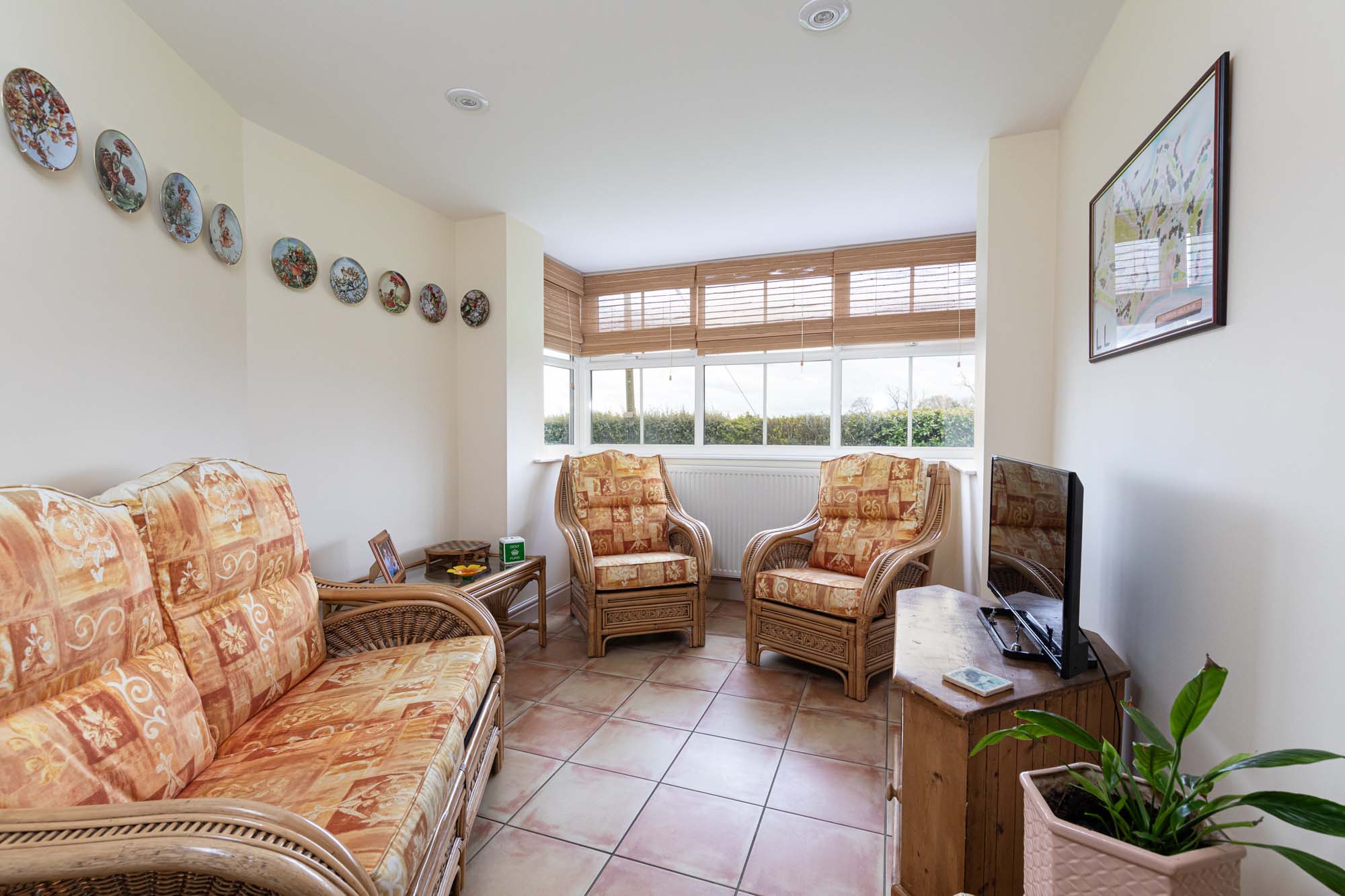 The lounge includes a large bay window that allows plenty of natural light, complemented by an electric fireplace, providing a comfortable setting for relaxation and entertainment. An additional sunroom offers a quiet place to unwind, secluded from the busier areas of the house. On the ground floor, two bedrooms share a bathroom with a separate shower.