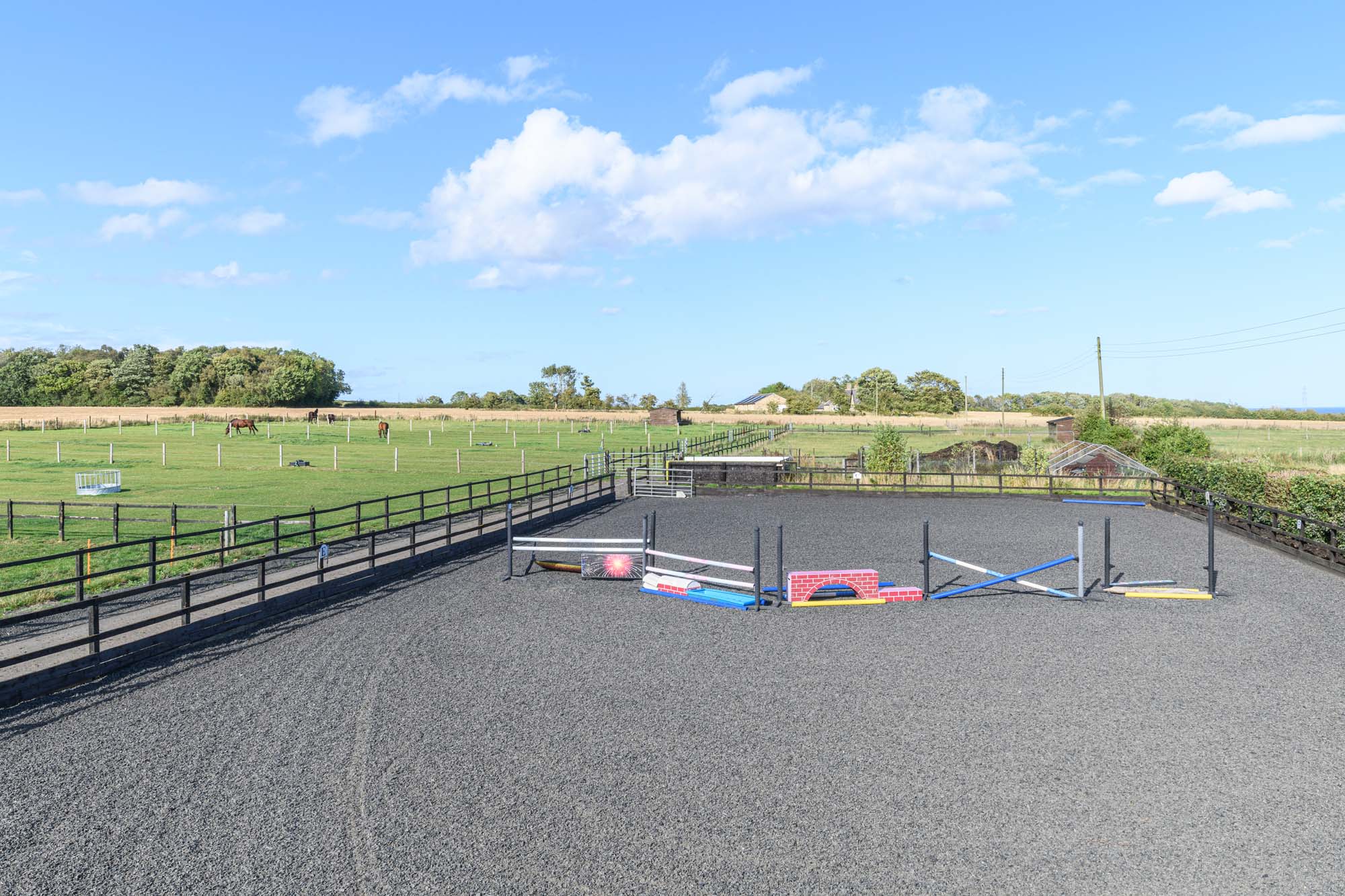 A courtyard and patio provide entry to a complex of six high-quality stables, complete with a feed room and tack room, all equipped with electricity, lighting, and water. The double garages, which include an additional tack room, are secured with alarms and also feature electrical outlets, lighting, and a water supply. The equestrian facilities are further enhanced by a 40m x 20m manège outfitted with a mixture of equestrian sand, fibre, and rubber, ensuring excellent riding conditions year-round. Beyond the main house, there are 5 acres of well-maintained paddock land, surrounded by electric fencing and equipped with a water supply, making it ideal for grazing.
