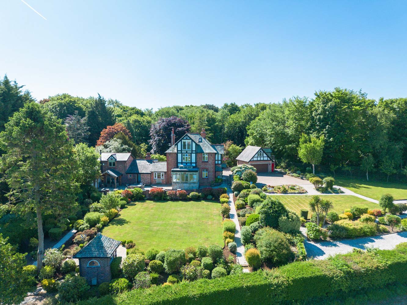 The property is approached via a stone pillared entrance gate giving access to the ’in and out’ driveway which sweeps through the grounds to a detached double garage which has a large room above that would be ideal for anyone looking to work from home. There is extensive parking, and to the front of the property the garden has been beautifully landscaped with a lawned area that surrounds a feature carp pond and is bordered by mature planting.