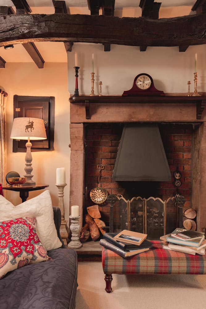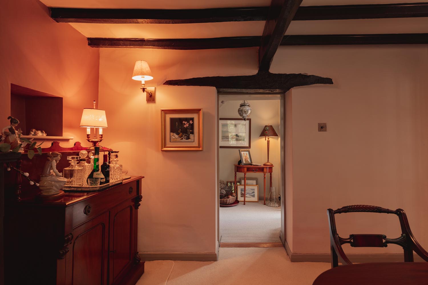From the kitchen, a rear hallway leads to the garden and contains the staircase to the first floor, with a WC and shower room providing convenient facilities. To the right of the kitchen, a separate dining room with exposed beams and a period fireplace creates an inviting setting for formal occasions. This room opens to a living room, a quiet space with an open fire and a garden outlook, then continues to a home office with a door to the front garden, useful for work, study or a calm reading spot.