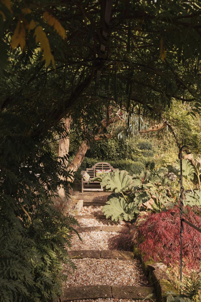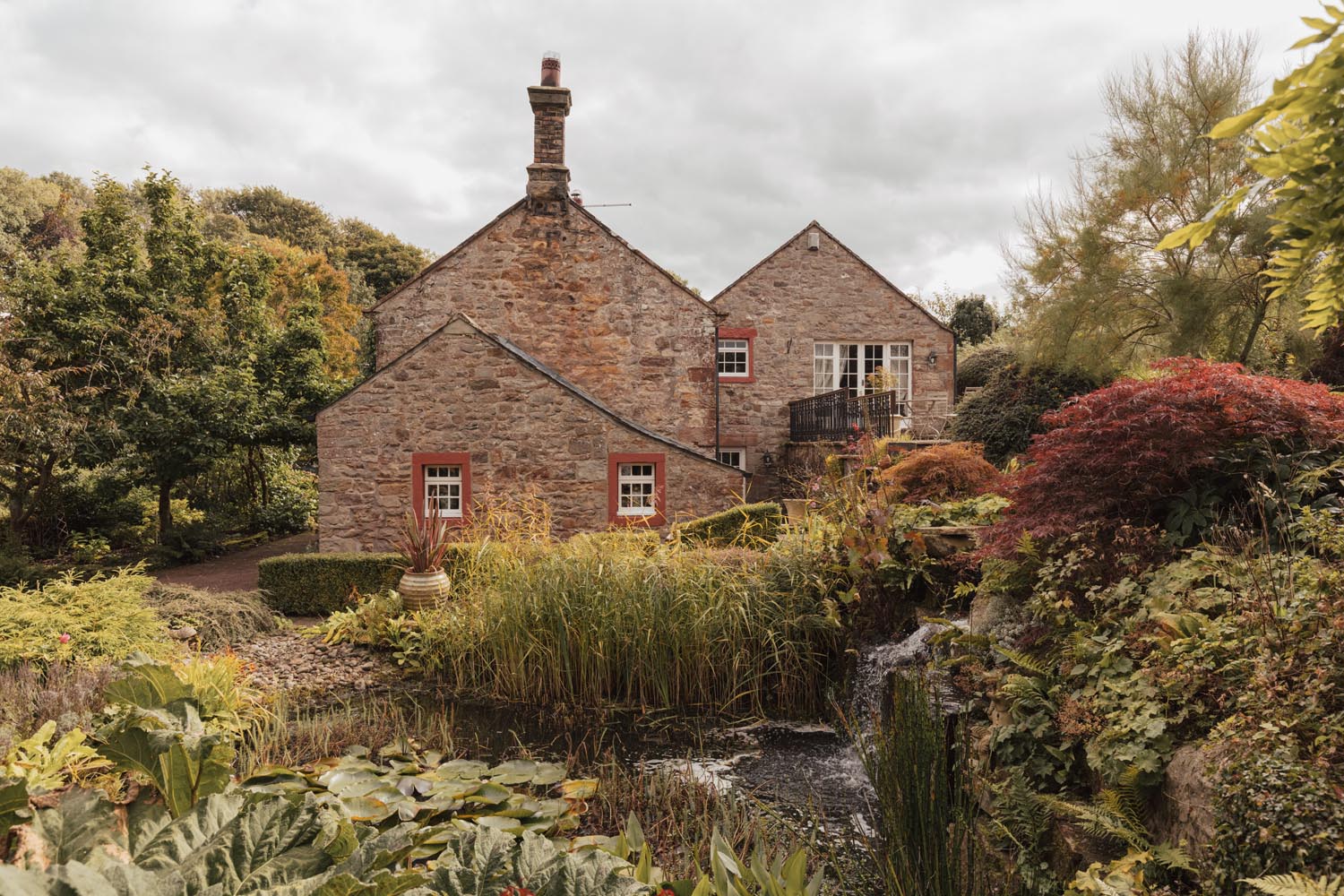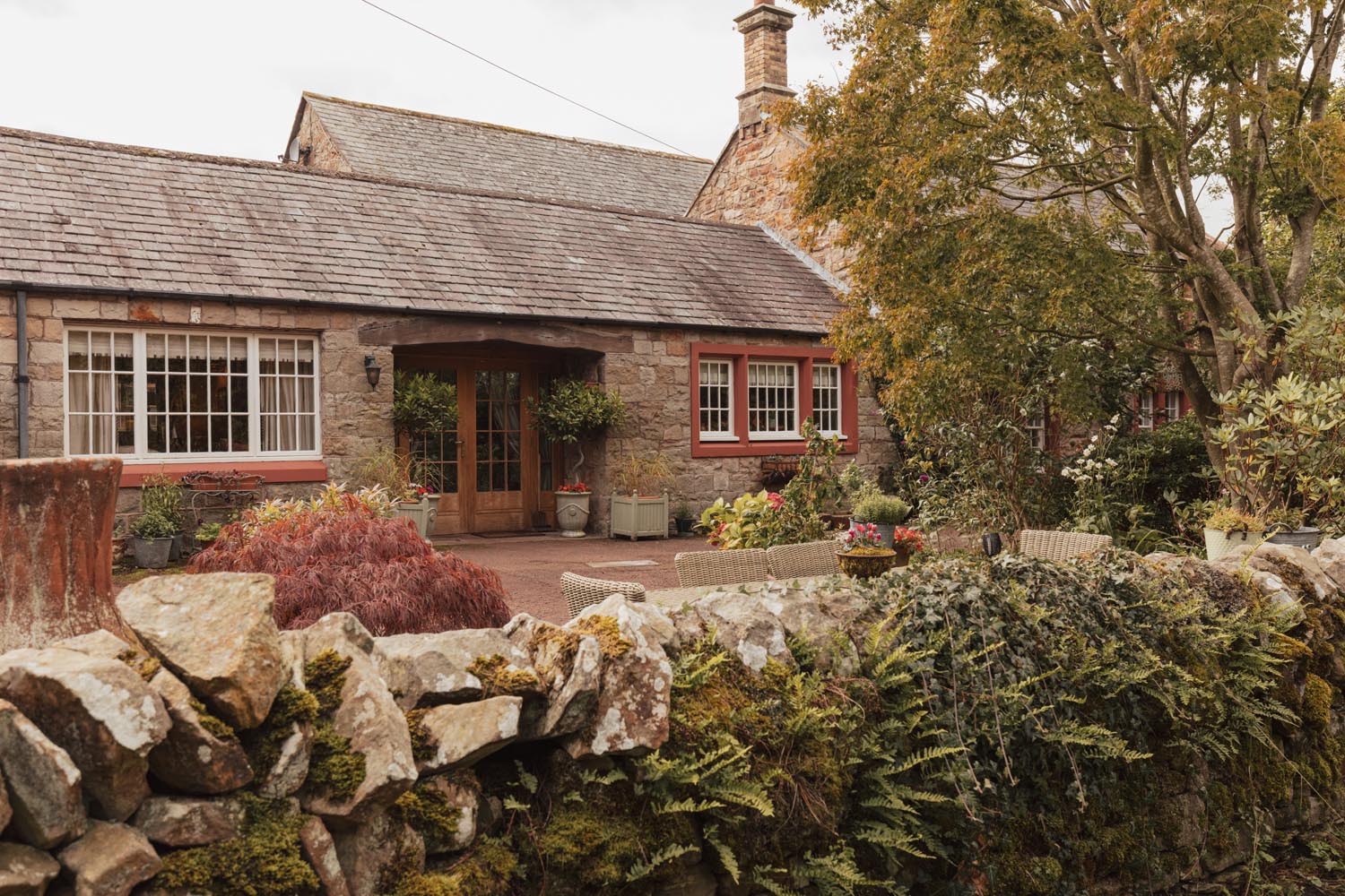 A double garage and broad driveway provide secure parking, enclosed by a traditional stone wall and gates, with ample additional space for visitors. The gardens are a standout feature, wrapping around the house to create a private, richly planted setting. South facing paved seating areas are positioned to follow the sun, ideal for morning coffee and evening suppers, while generous lawns are edged by mature trees and layered borders for seasonal colour and texture. A stream feeds an ornamental pond, linked by a pretty footbridge. Paths draw you through different pockets of the garden, from quiet corners for reading to open areas suited to larger gatherings. The planting has been established to provide privacy without feeling enclosed, and the outlook is towards open countryside, a calm, rural backdrop.