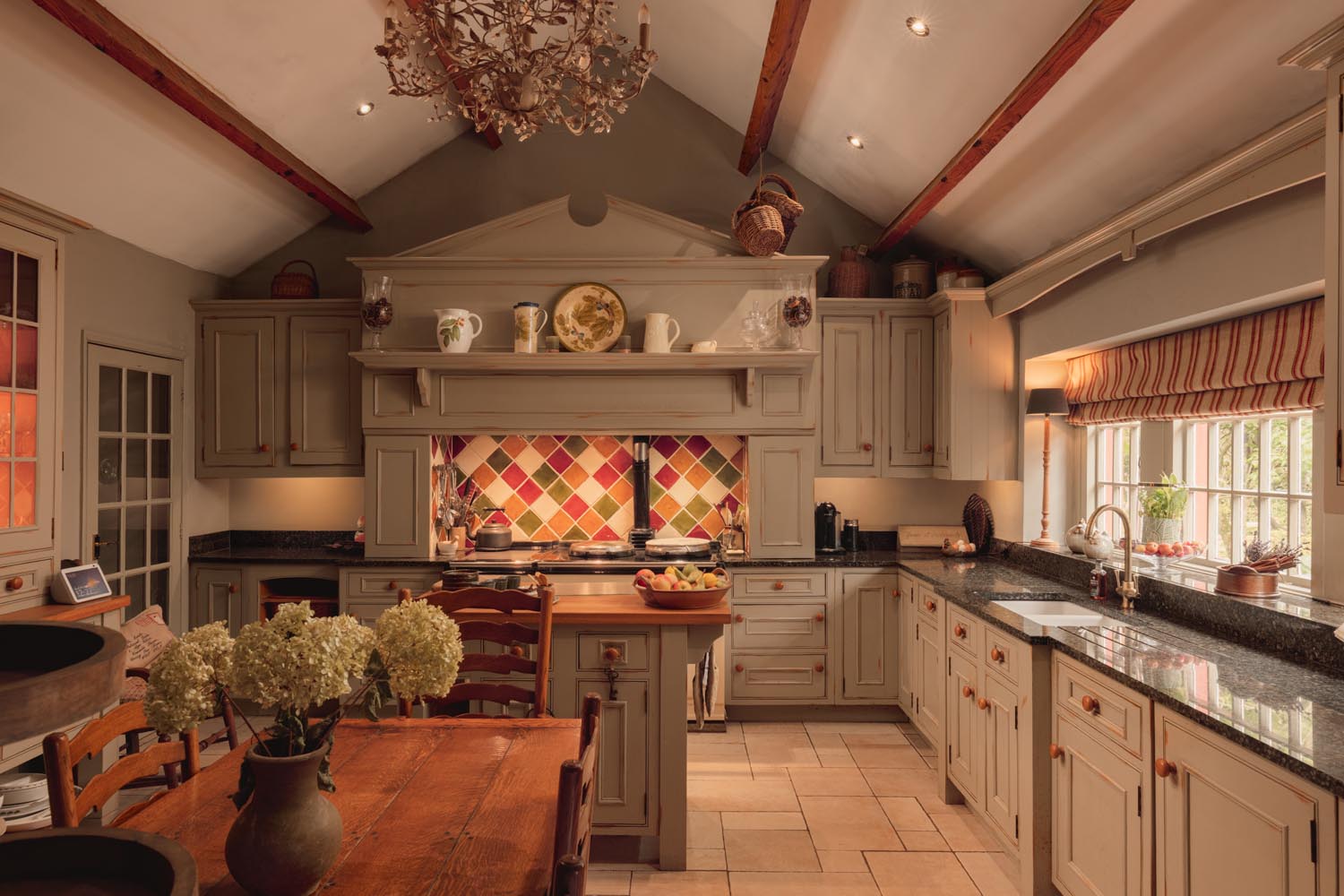 Through the principal doors you step straight into the kitchen and dining area, a practical everyday entrance that also creates a welcoming first impression. The space is finished with specialist cabinetry and marble worktops around a four oven AGA, supported by integrated Bosch appliances including dishwasher, washing machine, tumble drier, fridges and a freezer. There is ample space here for a table and chairs for everyday meals.
