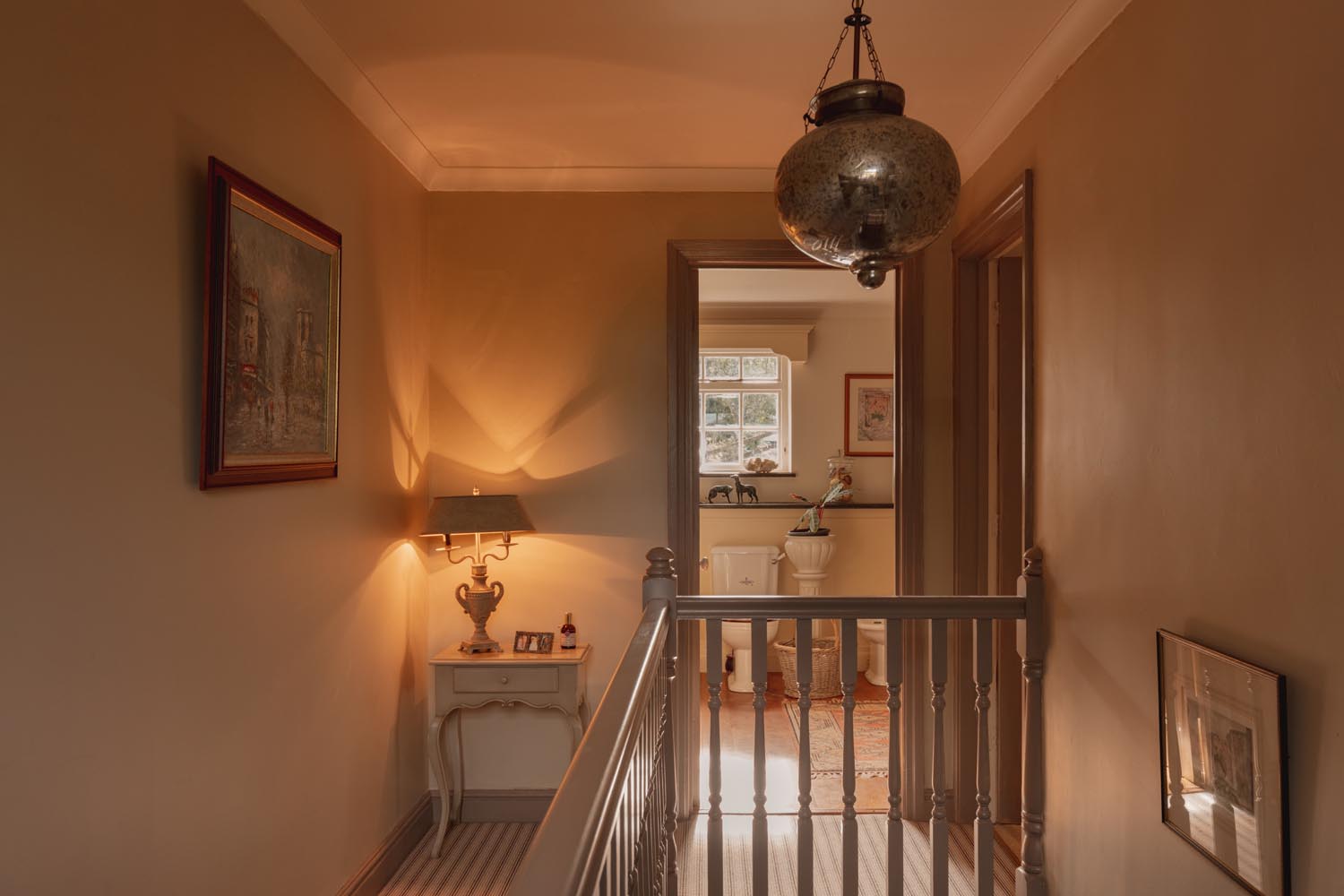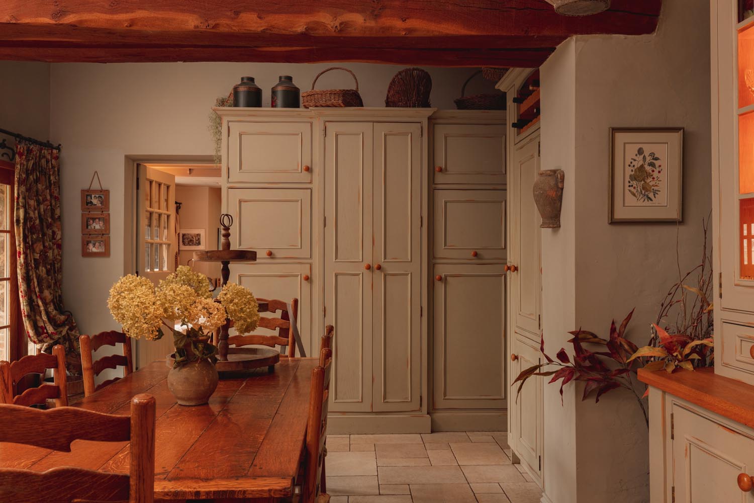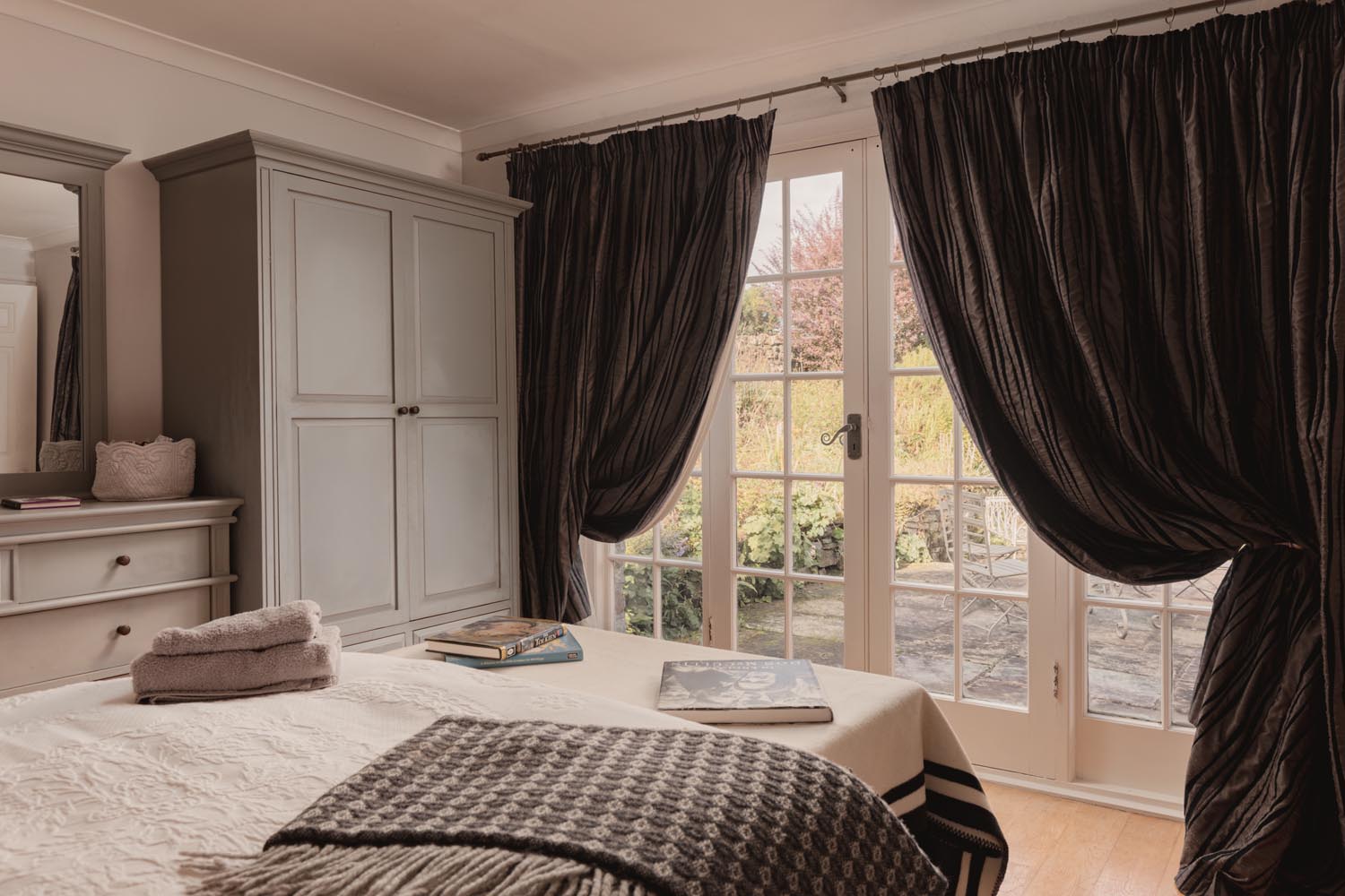 Upstairs, the principal bedroom is a generous space with a vaulted ceiling, exposed beams and fitted wardrobes, served by an en-suite shower room. Two further double bedrooms are well proportioned, one featuring expansive glazing with doors that open directly onto a pretty, private patio area. These bedrooms share a thoughtfully designed family bathroom, with fitted cabinetry and traditional fixtures, while a rear-facing window fills the space with soft natural light.