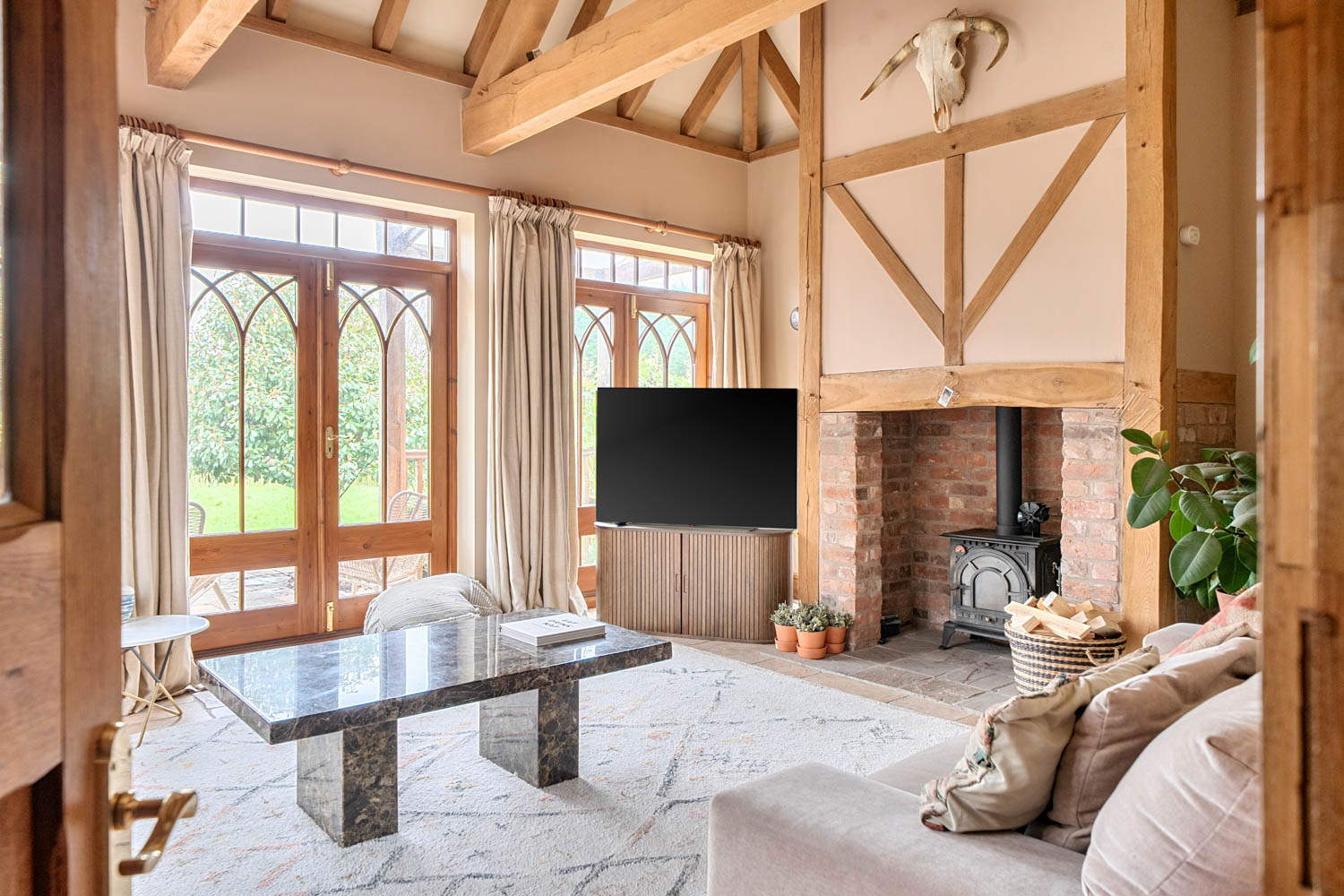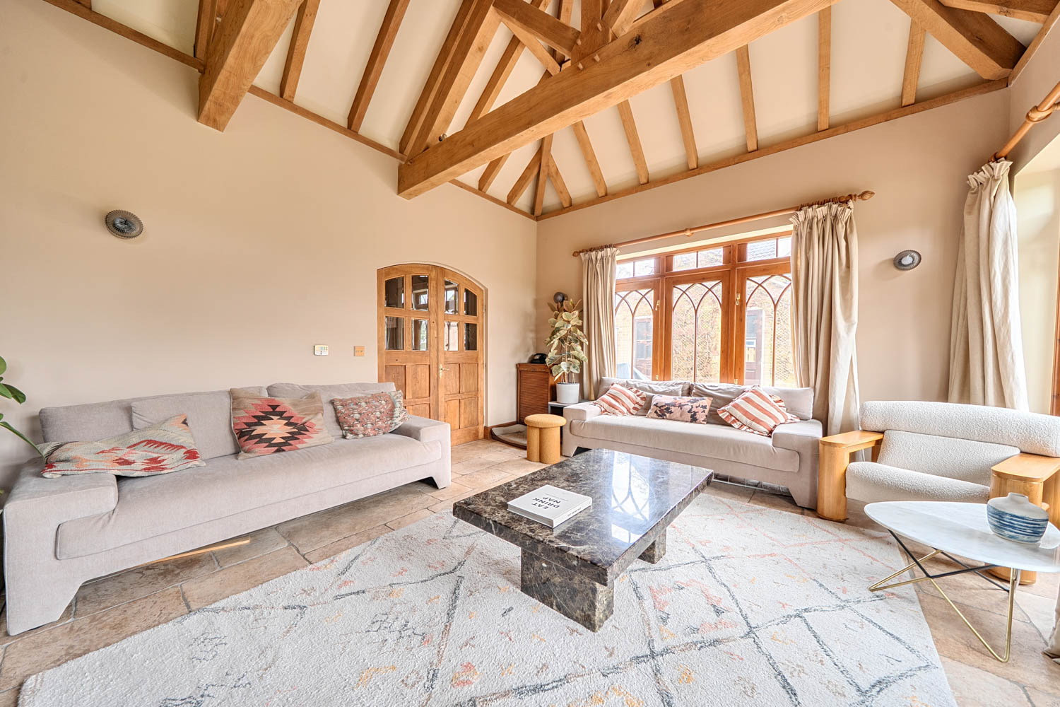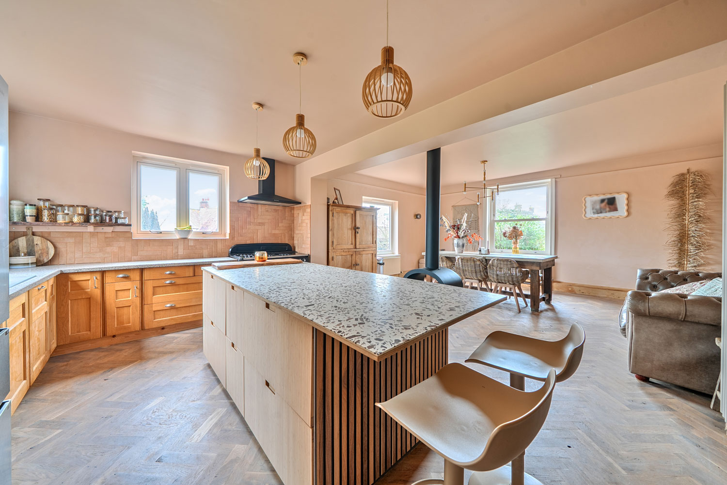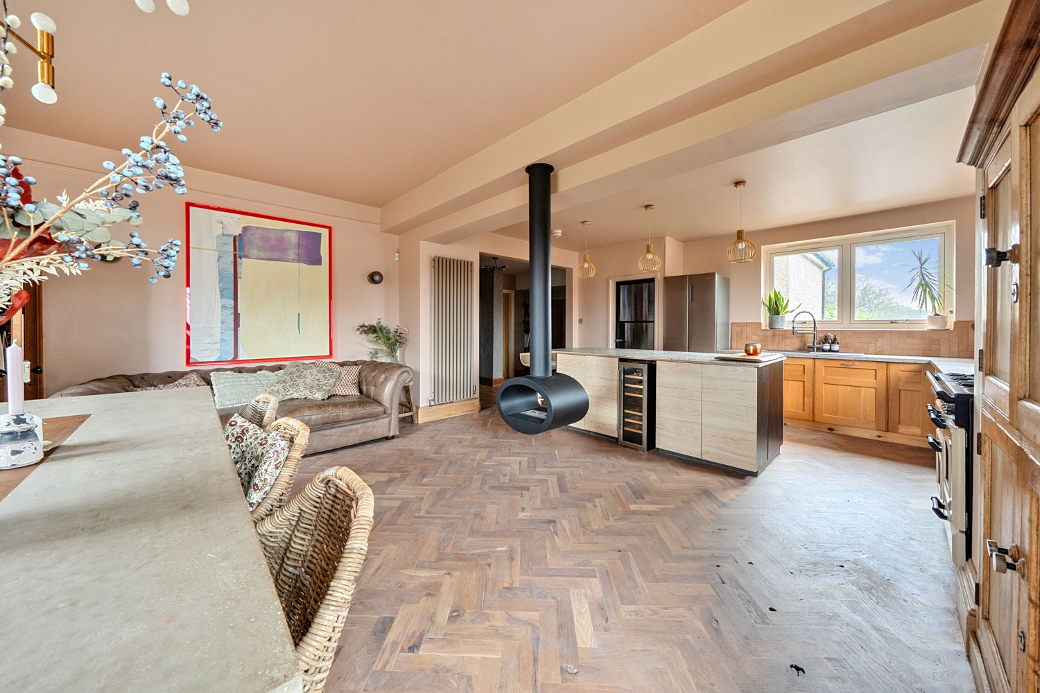 The property is approached via a welcoming entrance hallway which immediately sets the tone for the generous and well-balanced accommodation found throughout. From here, the ground floor unfolds into a series of substantial and versatile reception spaces. At the heart of the home sits the impressive kitchen/breakfast/dining room, a superb open-plan space thoughtfully designed to combine practicality with character. The kitchen is centred around a substantial island incorporating an integrated wine fridge and is fitted with a Rangemaster gas cooker. A striking freestanding fireplace provides a natural focal point, anchoring the room and enhancing the sense of warmth and sociability. This central space flows seamlessly into adjoining family areas, creating a wonderful sense of connectivity throughout the ground floor.