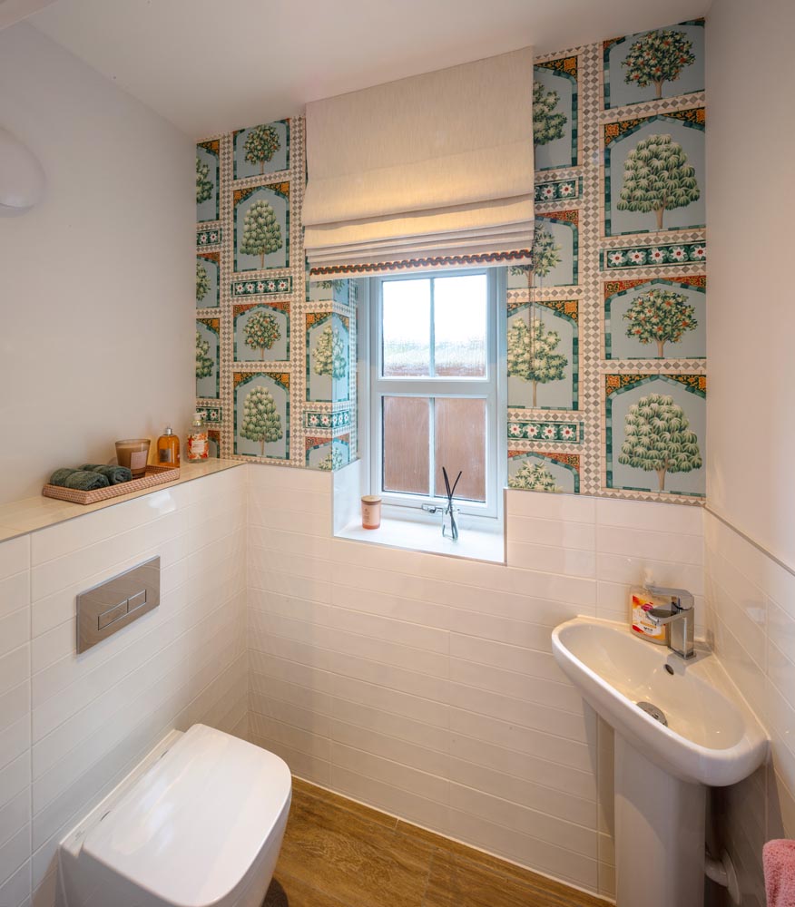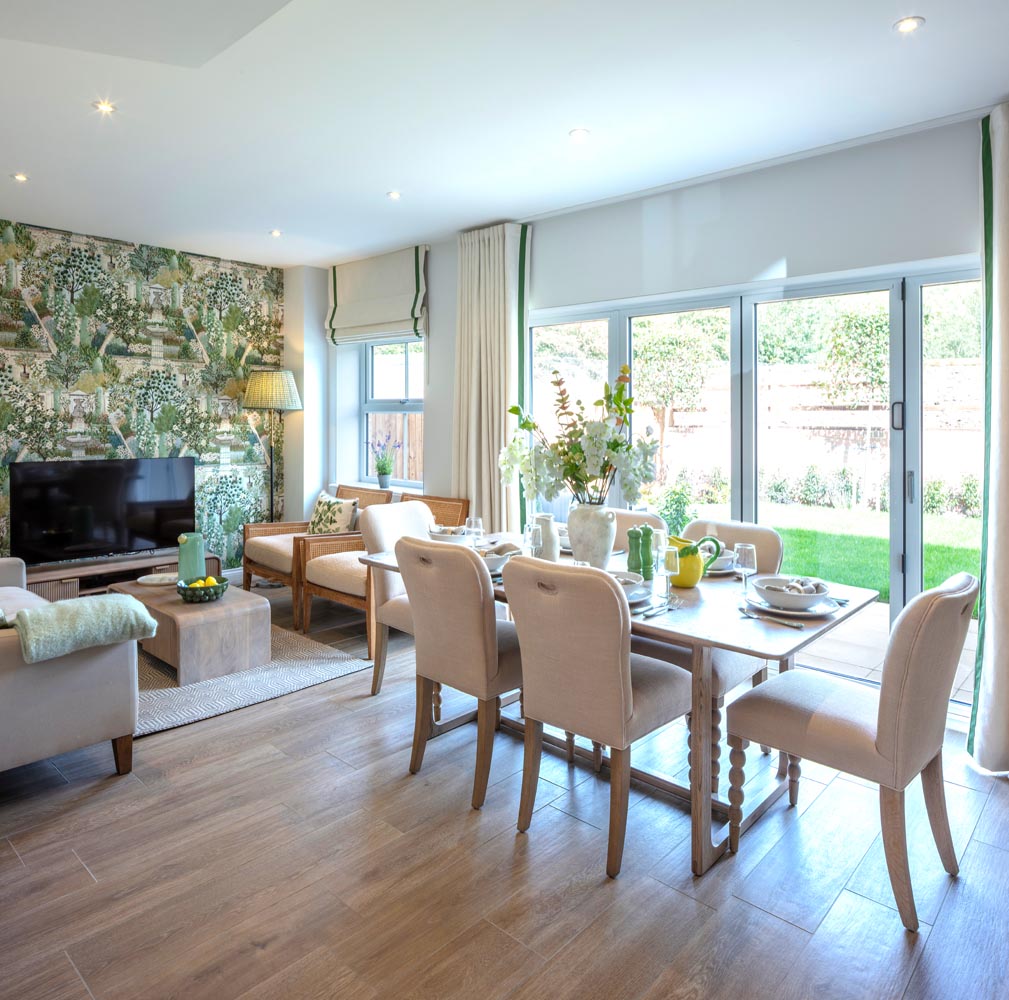 To the rear, the kitchen, dining and family space is designed to work as a natural focal point, combining scale with everyday practicality. Fitted with contemporary cabinetry and laminate work surfaces with matching upstands, the kitchen is equipped with Bosch appliances including an oven, induction hob, extractor and integrated dishwasher. The layout allows for clear zoning between cooking, dining and informal seating, while bi-fold doors open directly onto the garden, extending the space in the warmer months. A separate utility room sits alongside, providing additional storage and laundry space, helping to keep the main living areas uncluttered.